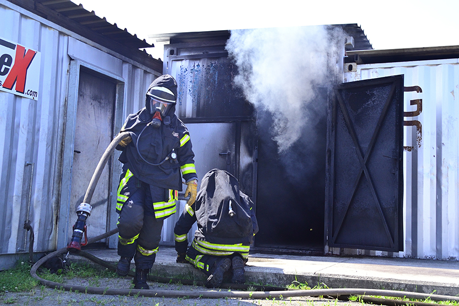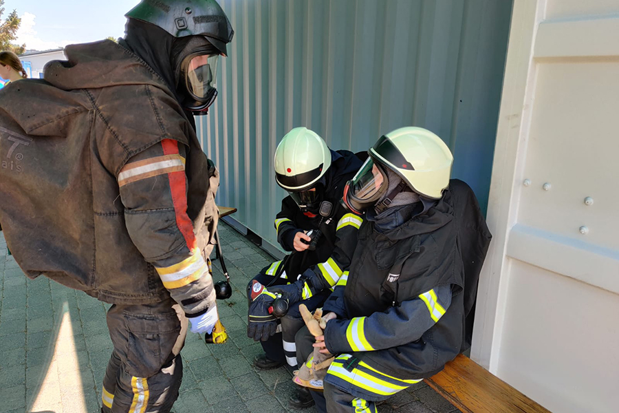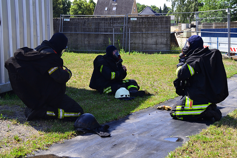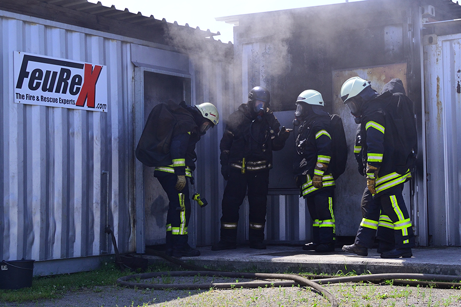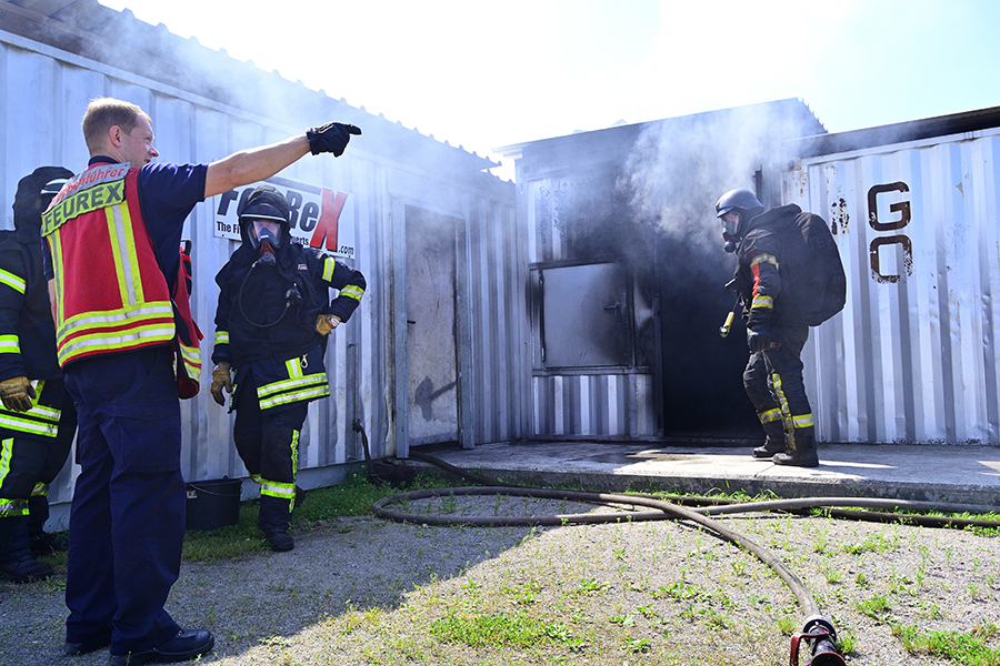 Im letzten Raum der Anlage angekommen, nutzten dann viele Teilnehmer auch den Tipp der Ausbilder: Seitlich mit Blick zum Feuer hinlegen, da am Boden die Luft am Kühlsten ist und so der Kopf weniger von Hitze betroffen wird. Es begann die Brandbekämpfung und die Teilnehmer merkten sofort: Der Wasserdampf "drückte" auf die Einsatzkleidung und steigerte die Belastung. Nachdem "Feuer aus" gemeldet wurde, wurde die Anlage verlassen und das fachgerechte Ablegen der nun mit Rauchgasen kontaminierten Ausrüstung absolviert. "Das haben alle super gemacht", so Randolf Gatz, Geschäftsführer von FeuReX Nord in der Nachbesprechung. Auch habe jeder Trupp bei seinem "Einsatz" bestens miteinander kommuniziert, um sich Aufgaben zu teilen oder auf Besonderheiten hinzuweisen.
