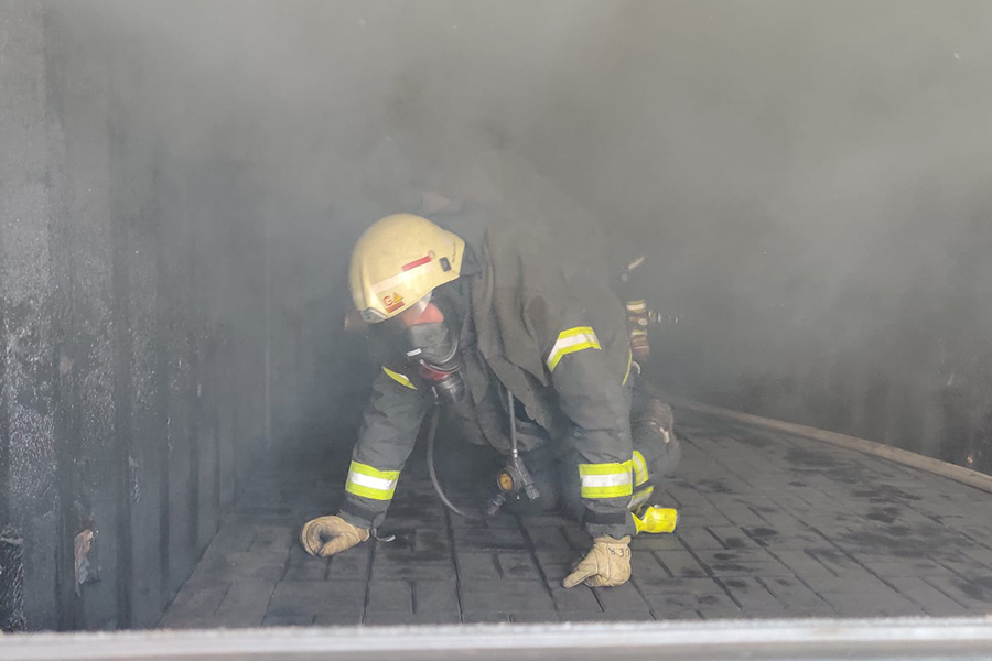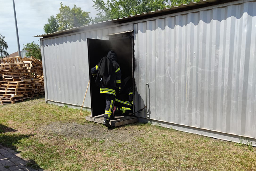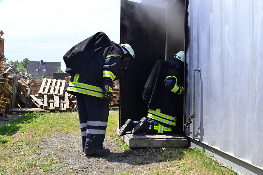 Durch insgesamt drei untereinander verbundene Container ging es bei dem rund 30-minütigen Durchgang für jeden Atemschutztrupp. Im ersten, mit Hindernissen und einem Gitterkäfig mit zwei Etagen ausgestattet, herrschten rund 50 Grad, im zweiten rund 100 Grad und im letzten, in dem sich das Feuer befand, trafen die Feuerwehrkräfte auf rund 200 Grad warme Luft. In der Nähe des Feuers wie auch mit ansteigender Höhe vom Boden durchaus heißer.
