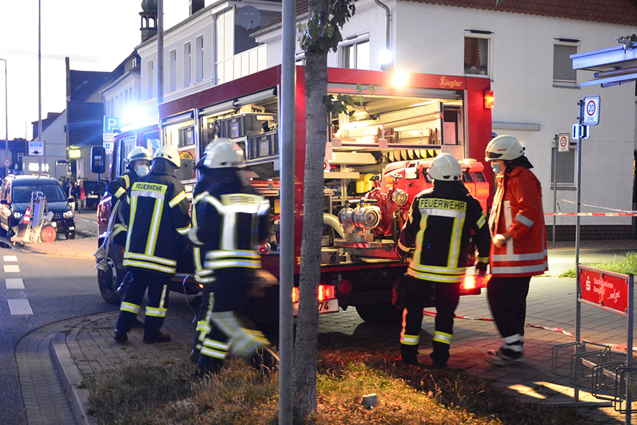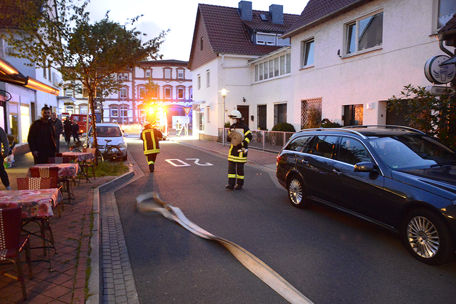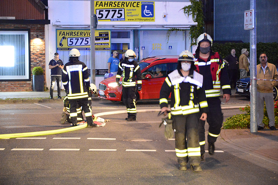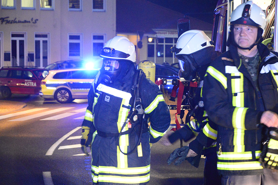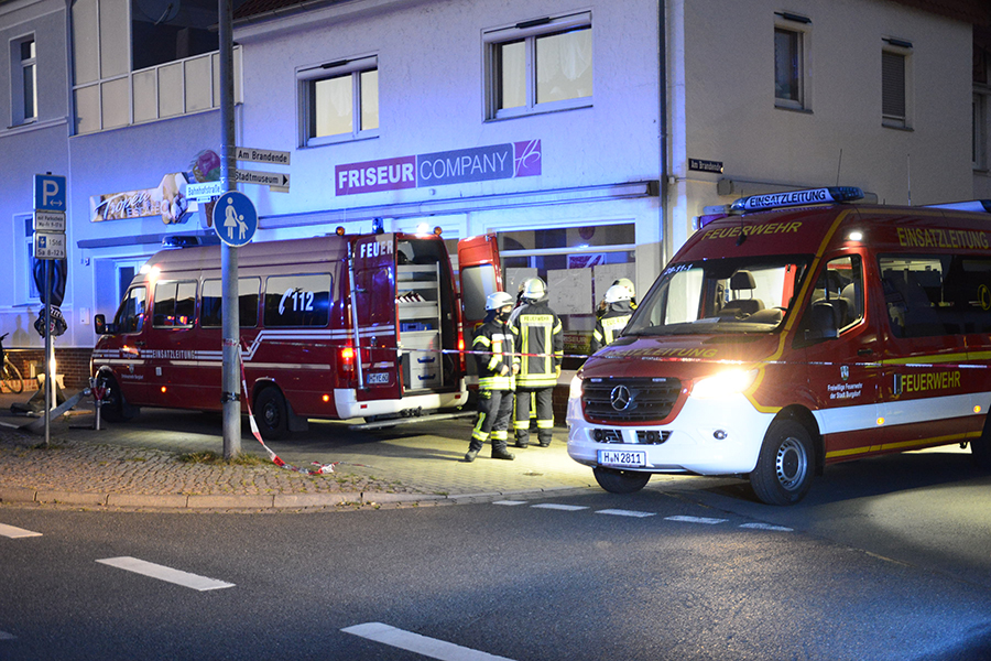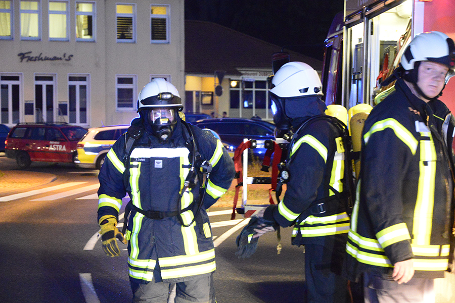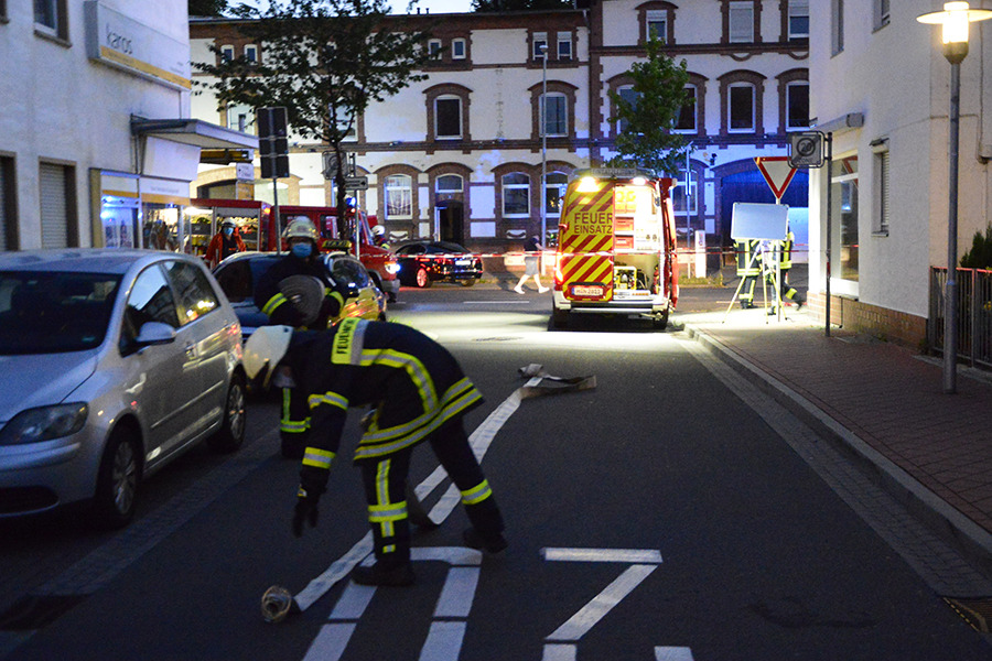Vor Ort fanden die Brandbekämpfer das verlassene Gebäude mit einer Größe von etwa 15×20 Metern in Vollbrand vor. Schwierig gestaltete sich zunächst das Erreichen des Brandherdes, denn eine direkte Zuwegung gab es nicht. Über den Hof der Taxizentrale an der Bahnhofstraße wie auch den Hinterhof des Black Horse und dem angrenzenden Magdalenenfriedhof wurde der Löschangriff in drei Abschnitten vorgenommen. Während die Angriffstrupps unter Atemschutz vorgingen, stellten weitere Feuerwehrkräfte in den umliegenden Straßen die Löschwasserversorgung über Unterflurhydranten vor.