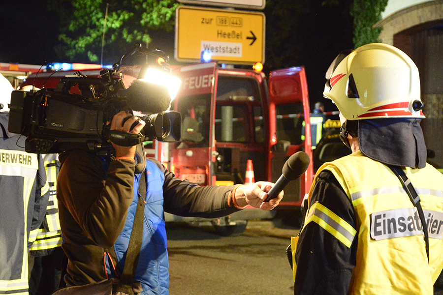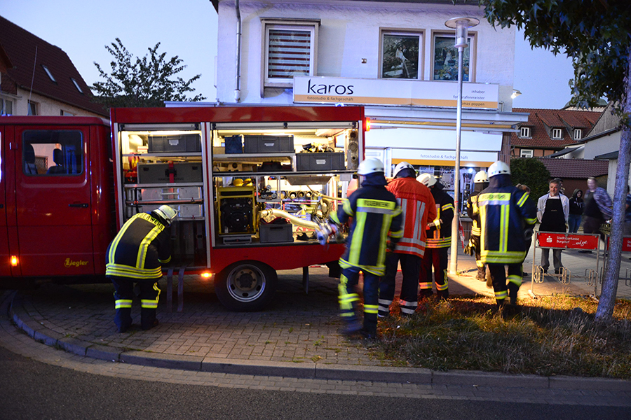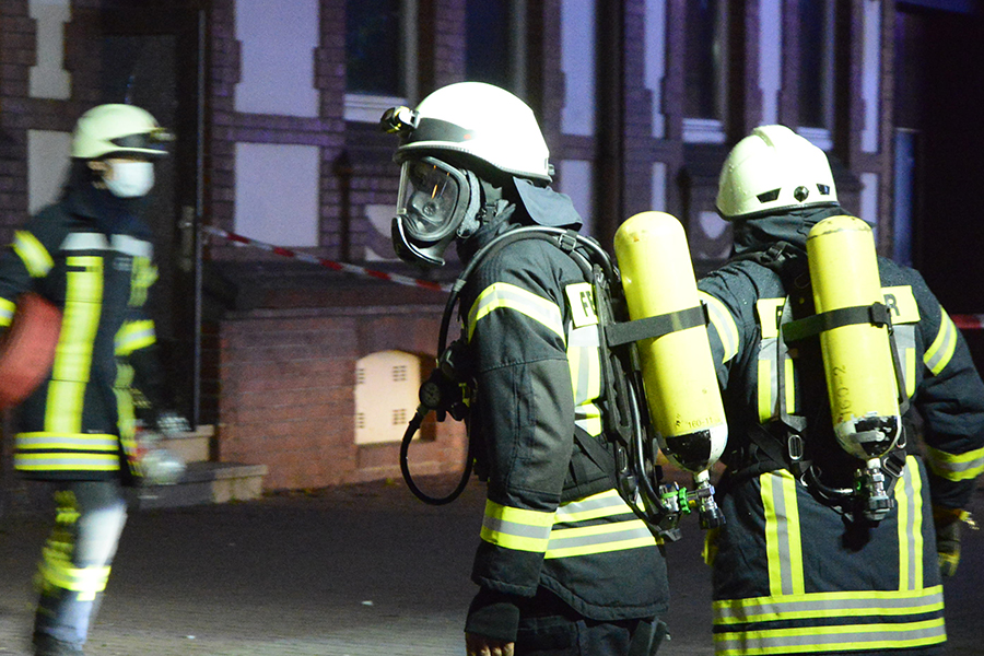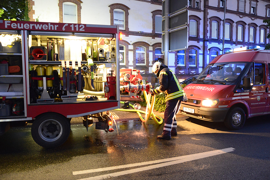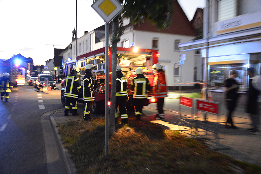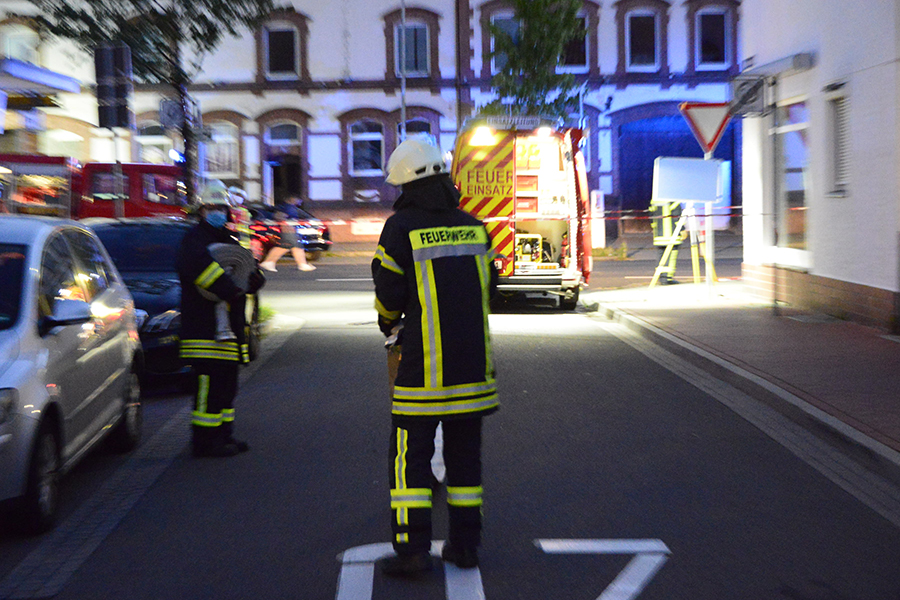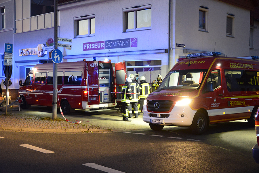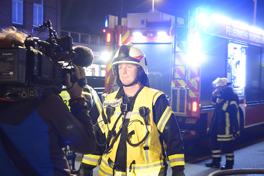 Vor Ort fanden die Brandbekämpfer das verlassene Gebäude mit einer Größe von etwa 15×20 Metern in Vollbrand vor. Schwierig gestaltete sich zunächst das Erreichen des Brandherdes, denn eine direkte Zuwegung gab es nicht. Über den Hof der Taxizentrale an der Bahnhofstraße wie auch den Hinterhof des Black Horse und dem angrenzenden Magdalenenfriedhof wurde der Löschangriff in drei Abschnitten vorgenommen. Während die Angriffstrupps unter Atemschutz vorgingen, stellten weitere Feuerwehrkräfte in den umliegenden Straßen die Löschwasserversorgung über Unterflurhydranten vor.
