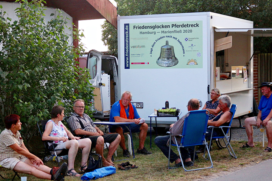 Die so genannte "Nordtour" ist die erste von fünf Friedenstrecks, die am Sonntag, 2. August 2020, auf dem Hamburger Heiligengeistfeld an den Start ging. Ziel der diesjährigen Reise ist das Klosterstift Marienfließ im brandenburgischen Landkreis Prignitz. Bis dahin werden die fünf Kutschen mit etwa 20 Personen alles in allem 23 Stationen ansteuern, um dort zu rasten und zu nächtigen sowie den jeweiligen Gastgebern eine kleine Kopie der Friedensglocke zu überreichen. Ein solche Kopie werden die Schillerslager als 12. Gastgeber der Gruppe in ihrer Kapelle künftig wiederentdecken können. "Der Treck wurde von uns mit Strom, Wasser und Duschen versorgt", sagte Ortsbürgermeister Cord Reißer. Burgdorfs Vize-Bürgermeister Matthias Paul, im Hauptberuf Pastor der Paulusgemeinde in der Südstadt, wünschte dem Unterfangen gutes Gelingen und dass die Friedensglocke als starkes Zeichen in Jerusalem ankommen möge. Mit "Gottes Segen" schloss er seine kurze Ansprache. Nächster Halt ist heute das Dorf und Kloster Wienhausen im benachbarten Landkreis Celle.