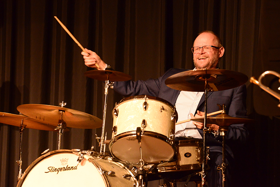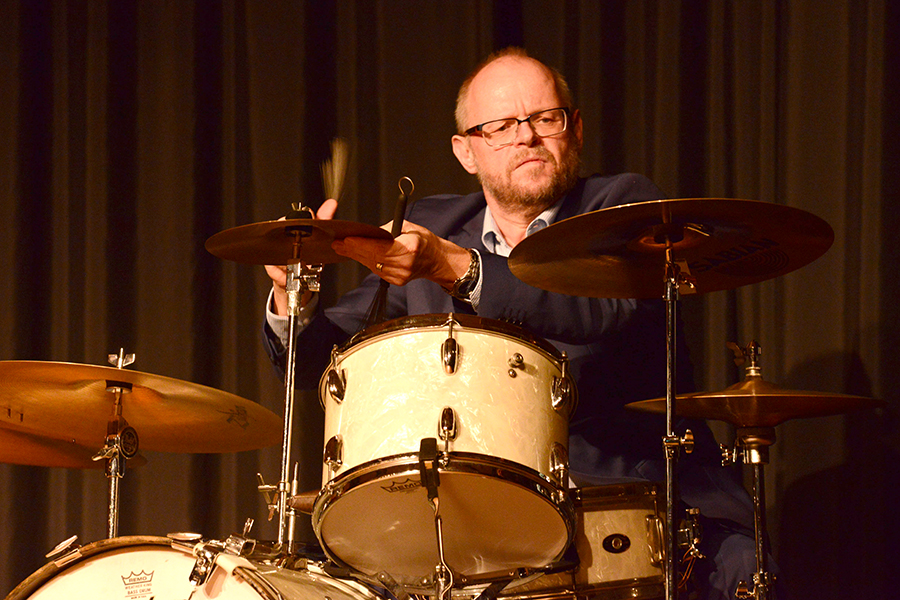 Ob die Ballade oder das rasante Stück "The Midgets", bei dem einem schnellen Einstieg von Lindy Huppertsberg (b) die Bläser Matthias Seuffert (sax, cl) und Patrick Artero (tp) folgten, bis Thilo Wagner (p) dazukam. Dabei immer im Hintergrund der fantastische Drummer Gregor Beck. Im Laufe des Abends durfte er aber bei fünf Soli sein Können im Stil eines Gene Krupa beweisen.
