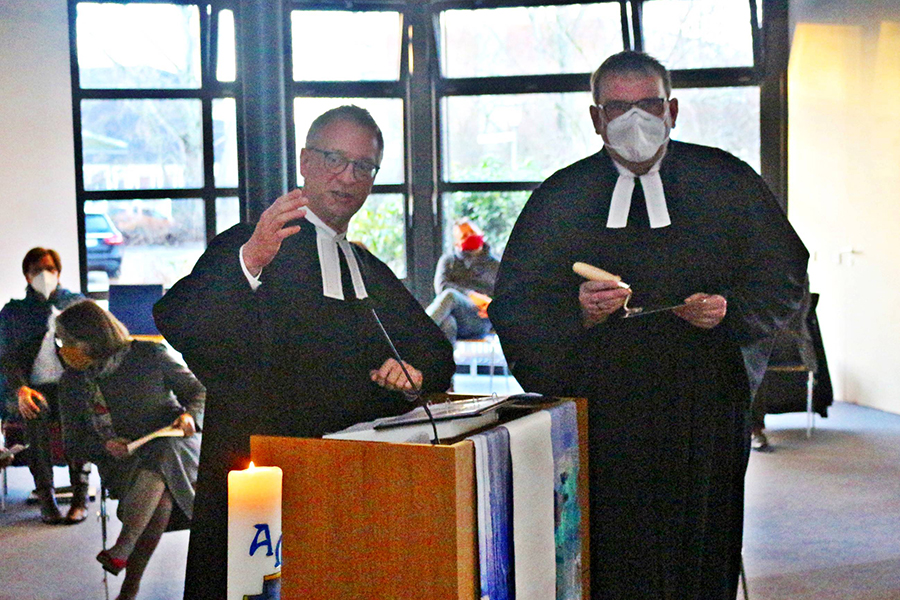 Matthias Paul (rechts) wurde von seinen Aufgaben als Paulus-Pastor vom Pankratius-Pastor Dirk Jonas (links) in dessen Eigenschaft als stellvertretender Superintendent entpflichtet. / Foto: Georg Bosse