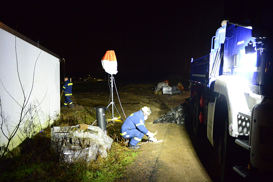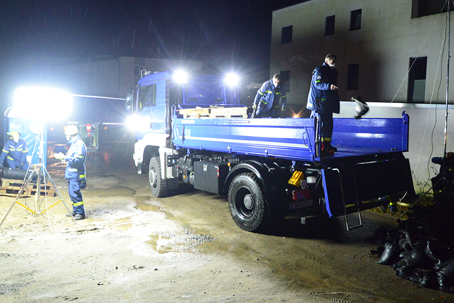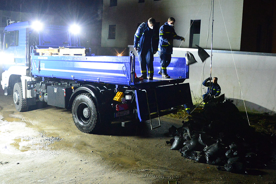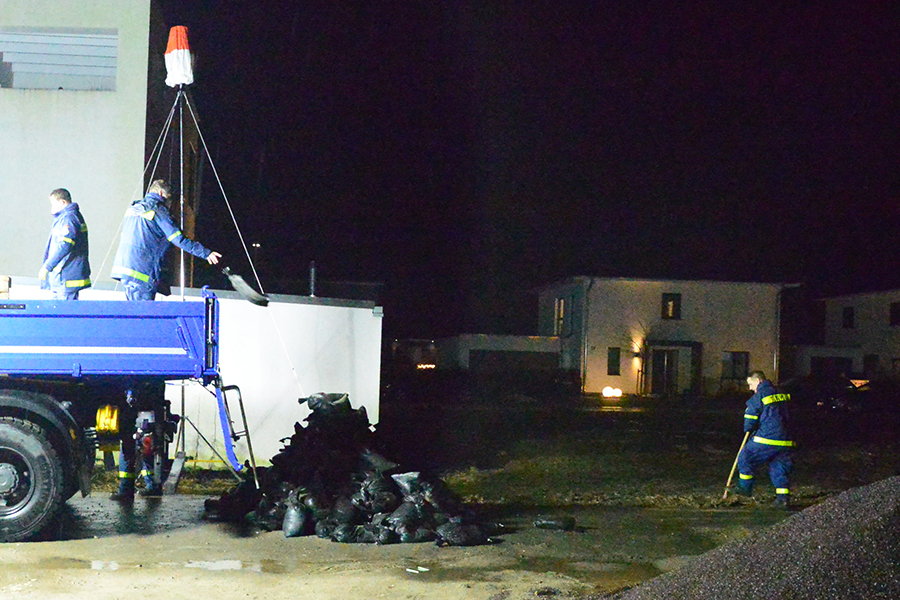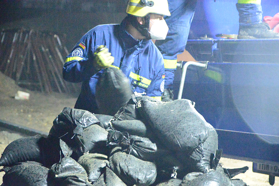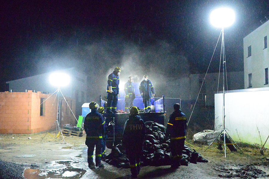 Acht THW-Helfer rückten mit drei Fahrzeugen aus und brachten unter anderem vier Paletten mit Sandsäcken auf einem Lkw mit. Sie bauten eine Barriere, damit das Wasser nicht weiter auf das Grundstück, sondern über die Straße abfließen kann. Um 1 Uhr waren die THW-Helfer wieder in ihrer Unterkunft angekommen.