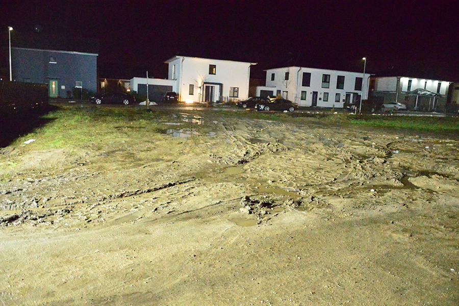 In der Burgdorfer Weststadt war es aufgrund der Wetterlage zunächst zu einer Überschwemmung einer Garage eines Mehrfamilienhauses gekommen. Der schmelzende Schnee mit zusätzlichem Regen drohte, ein Haus unter Wasser zu setzen. Eine besondere Lage vor Ort ließ das Wasser von einem benachbarten Feld zum Haus fließen: Eine neu angelegte Baustraße, rund 40 Zentimeter höher gelegen als das betroffene Grundstück, kanalisierte das vom Feld abfließende Wasser zum Haus. Der gefrorene Boden ließ es auf dem Feld nicht wie sonst versickern, sondern es sammelte sich und floss zum Haus, wo am Abend dann die Garage unter Wasser stand. Zudem drohte es, in den Keller des Hauses zu fließen.