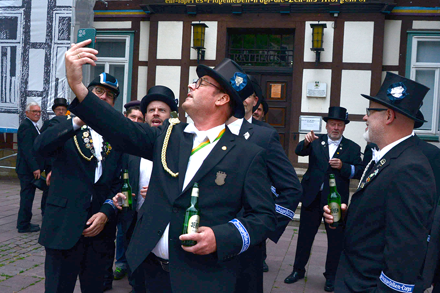 Die Junggesellen, die sich am heutigen Donnerstagabend an historischer Stätte vor dem alten Rathaus einfanden, vergaßen trotz der pandemischen Lage ihre langjährige Tradition nicht: So gab es eine gebührende Totenehrung für die seit dem letzten Schützenfest verstorbenen Fahnenjunker. So erwiesen sie Manfred "Männe" Pust und Kurt "Kutscher" Fuchs die Ehre. Nicht ohne Tränen in den Augen zu Ehren derer, die nicht mehr unter uns verweilen und eine Lücke hinterlassen haben.