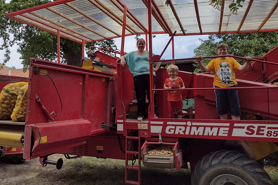 Das bestätigte auch Landwirt Kurt-Heinrich Schweer in Hülpingsen. Er lud alle Fahrradfahrer zu einem Besuch seines Hofes ein. Besonders der bereit gestellte Kartoffelroder und Trecker, die frisch am Morgen in Sorgensen im Ernteeinsatz waren, hatten es den Kindern angetan. Fasziniert erfuhren die Besucher von dem Unterschied zwischen "Pommeskartoffeln", die der Hof auch für McDonalds produziert, und den Speisekartoffeln für den Direktverkauf in seinem neuen Hofladen an die Verbraucher. Auf 30 Hektar von insgesamt 150 baut der Hof die Knolle an. "Monokultur entspricht aber nicht dem Prinzip der Nachhaltigkeit", sagt Schweer. Daher wechselt er in der Fruchtfolge mit Getreide wie Brotroggen für Wasa, Gerste , Hafer, auch Zuckerrüben, Zwiebeln, Kürbis und ab nächstem Jahr zudem Dinkel.