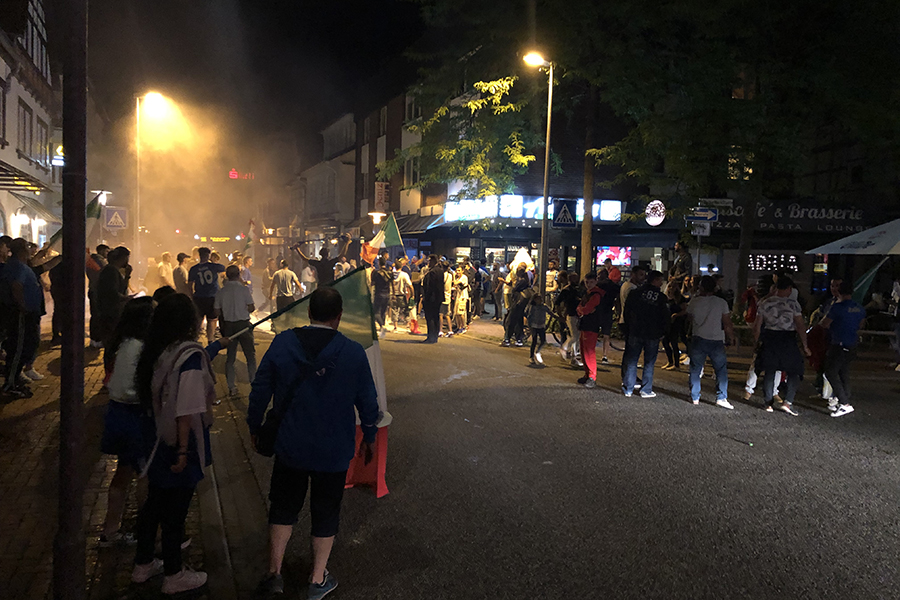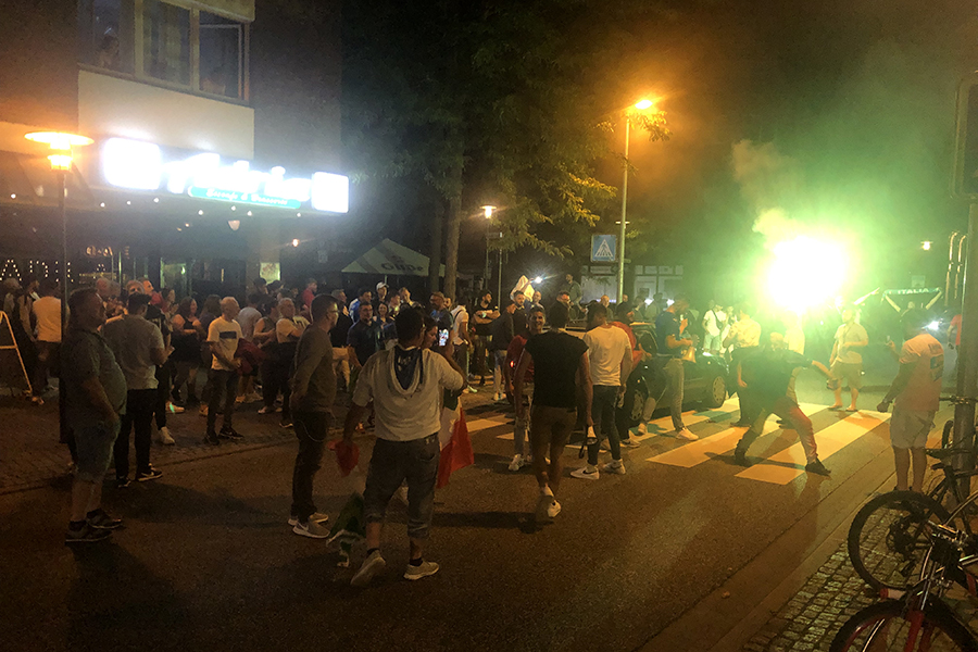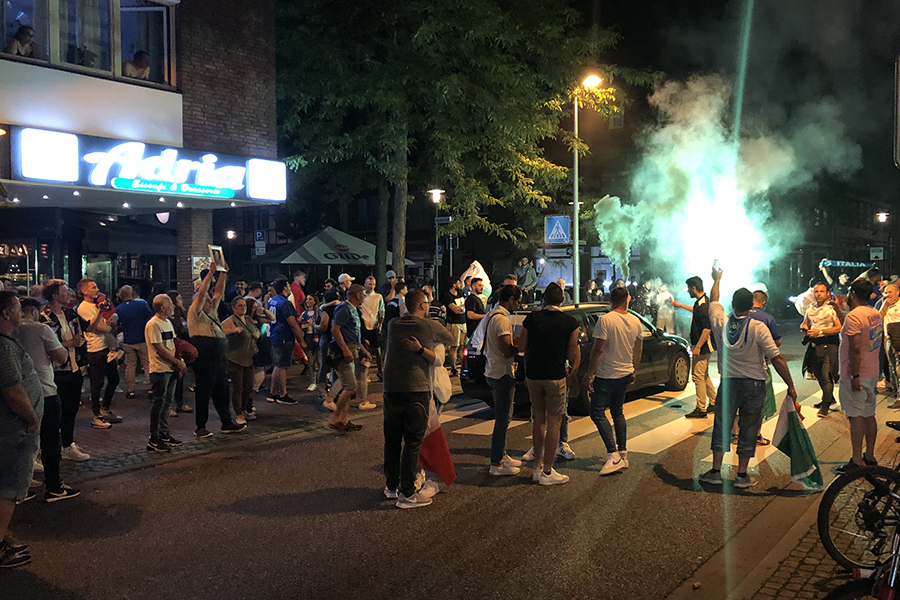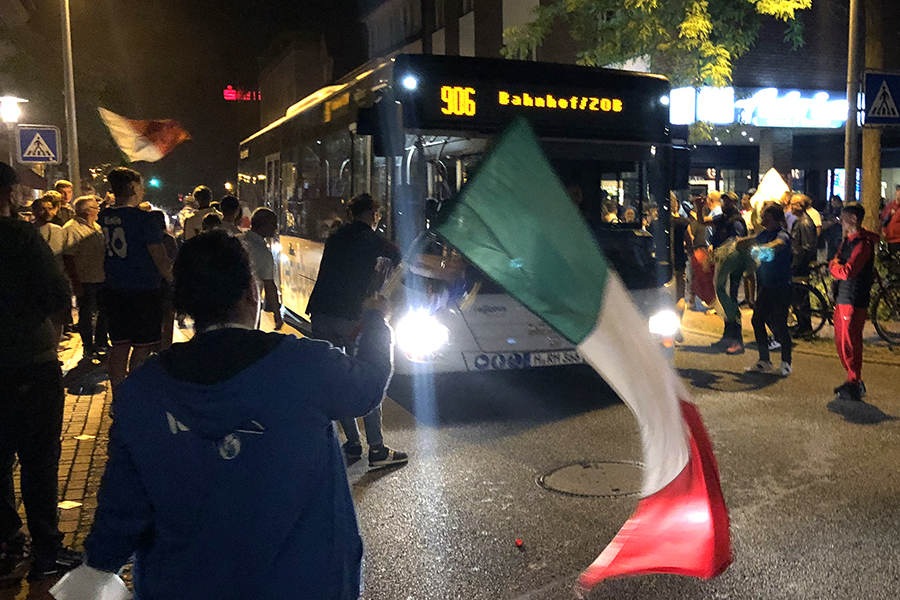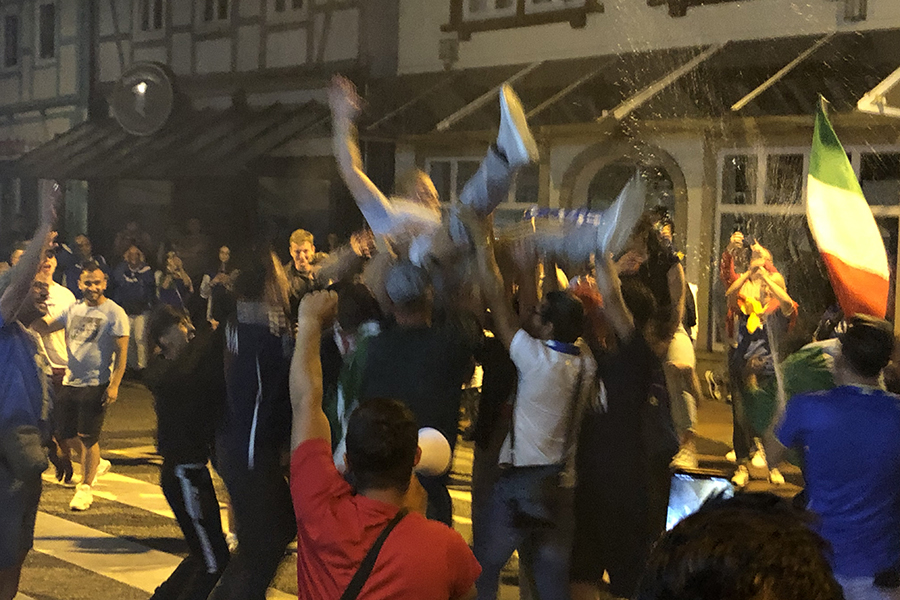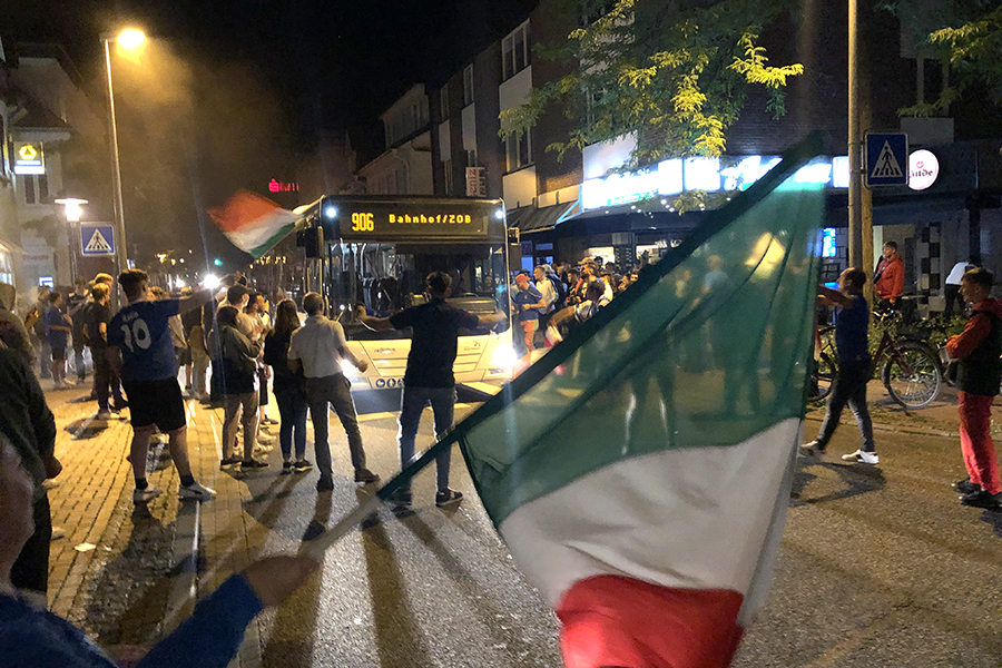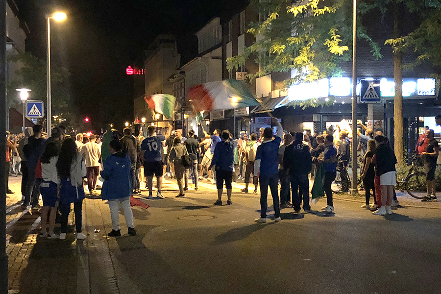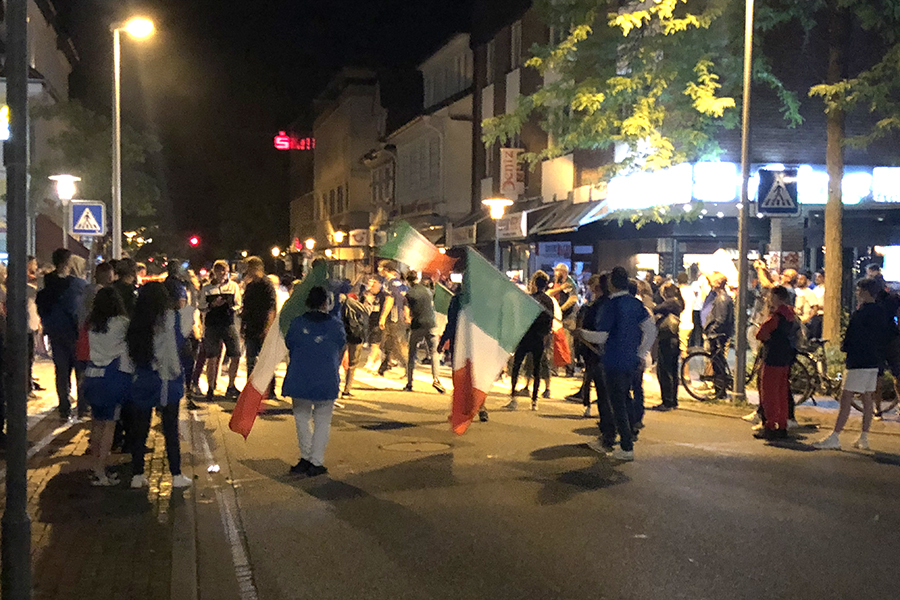 Begeistert, aber friedlich feierten die Fans, die sich dann im Eiscafé zusammen zu die Pokalübergabe anschauten und begeistert die italienische Nationalhymne sangen. Immer wieder fuhren Autos vorbei, zum Teil mit Italien-Fahne auf dem Dach festgemacht.