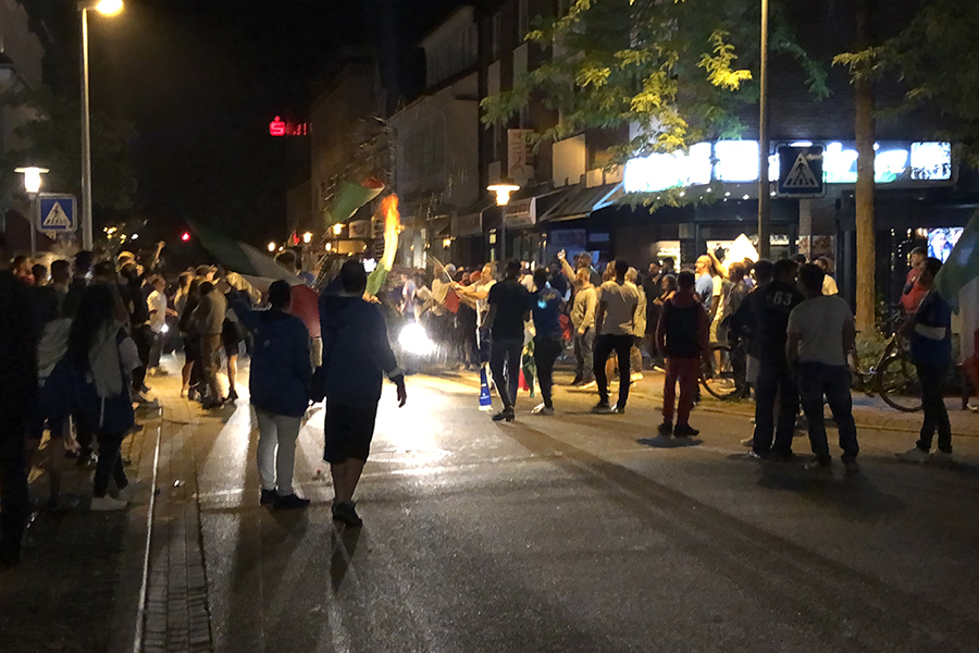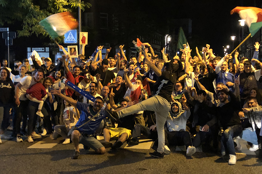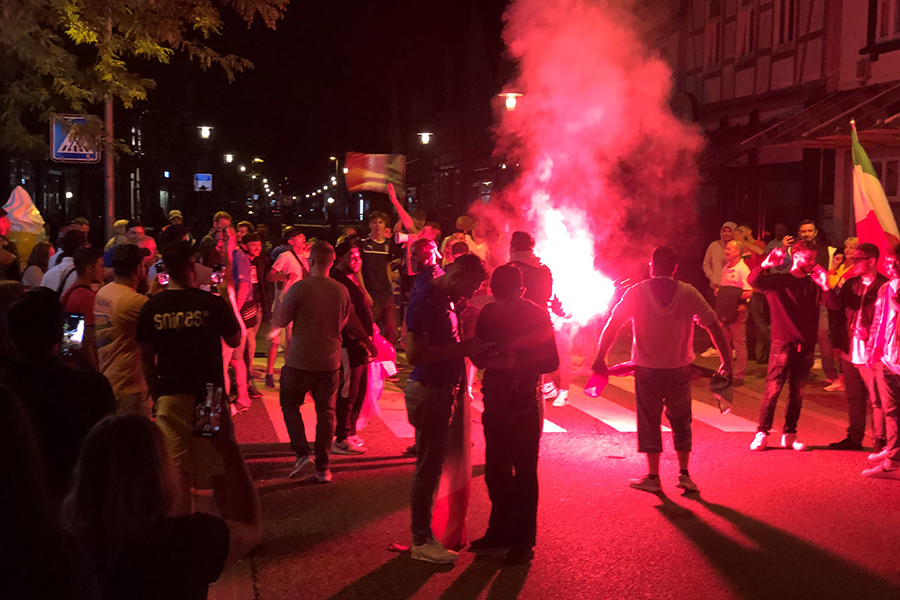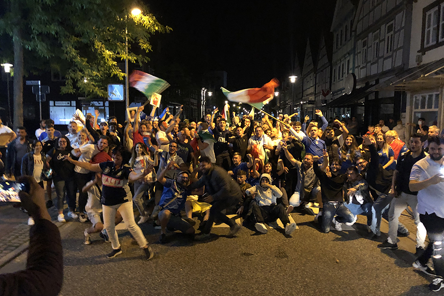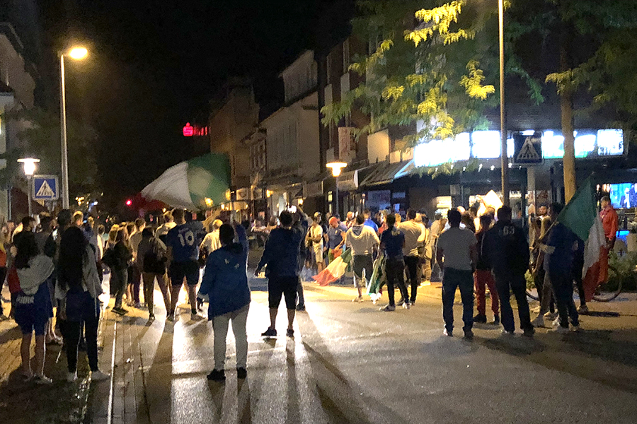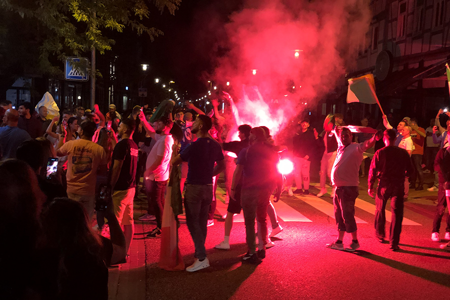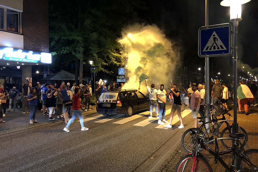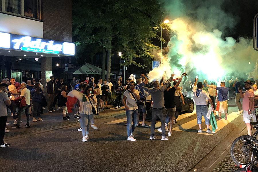 Begeistert, aber friedlich feierten die Fans, die sich dann im Eiscafé zusammen zu die Pokalübergabe anschauten und begeistert die italienische Nationalhymne sangen. Immer wieder fuhren Autos vorbei, zum Teil mit Italien-Fahne auf dem Dach festgemacht.