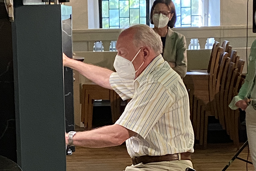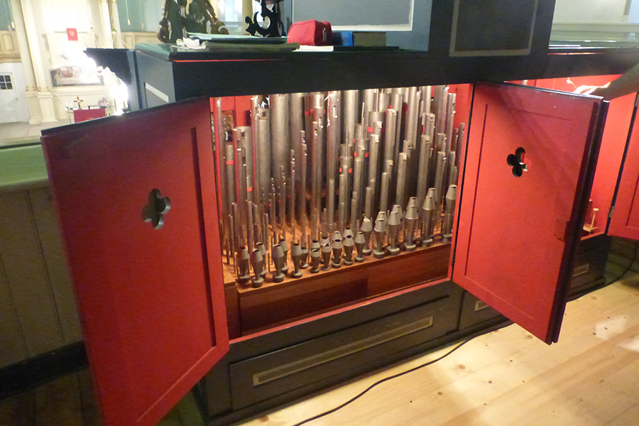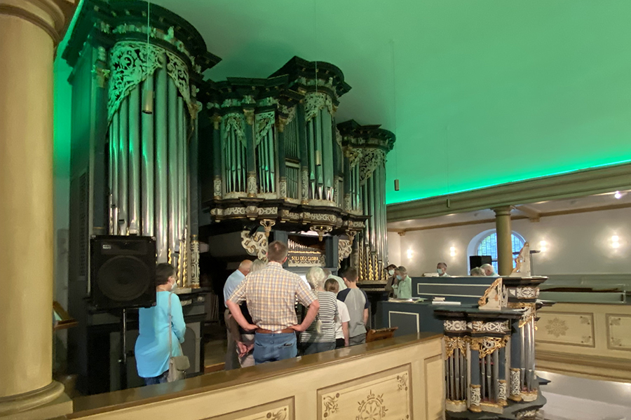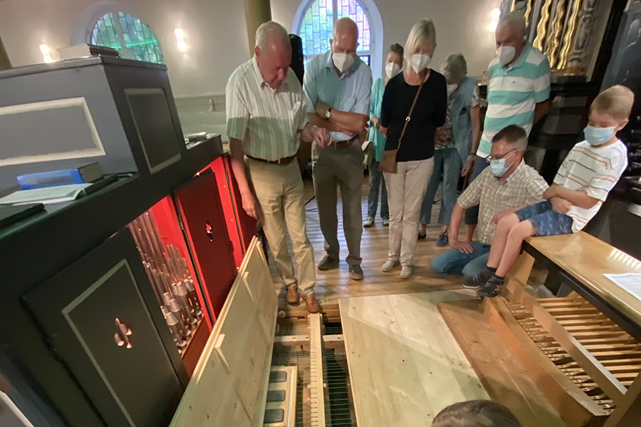 Fachkundige Erklärungen zum Aufbau und zur Handhabung der Orgel gab es vom 2. Vorsitzenden des Fördervereins, Ernst Schmidt, der gelernter Orgelbauer ist und hier seine Kompetenz und langjährige Erfahrung eingebrachte. Bestaunt wurde das "Innenleben" der Orgel ebenso, wie der Aufbau, der Klang und viele interessante Details.