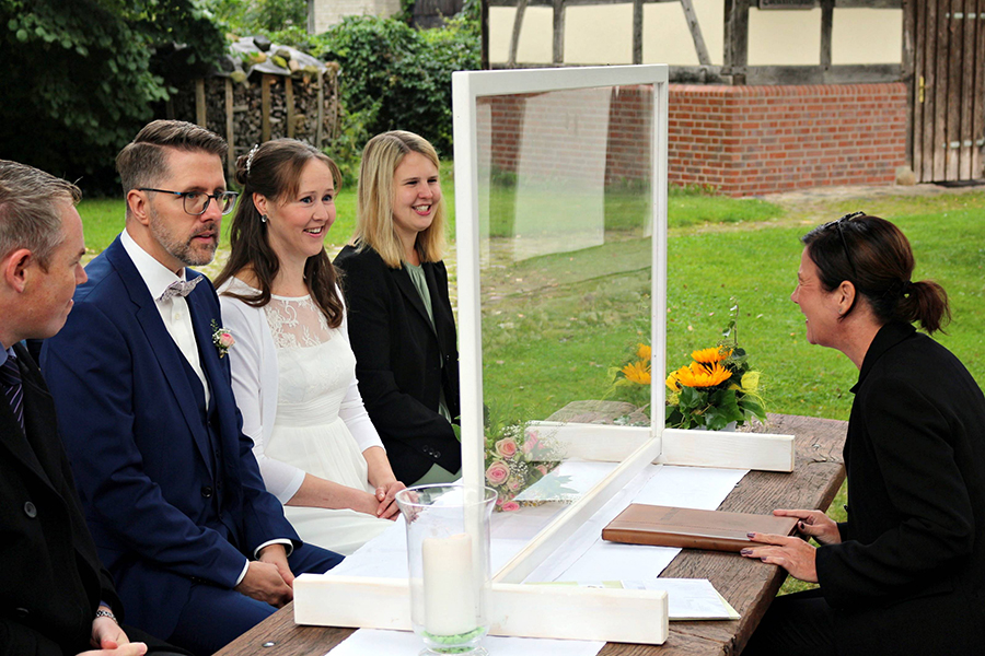 Neben den Trauzeugen Julia Bliedung und Ulf Pohlmann hatten sich rund 30 Familienmitglieder und Freunde "Am Speicher" eingefunden, um der Zeremonie unter freiem Himmel und grünem Blätterdach den gebührenden Rahmen zu geben. Zu diesem Rahmen trug auch das von der legendären "Rentnerband" in ehrenamtlicher und liebevoller Kleinarbeit erstellte Fachwerkensemble bei, das vor gut fünf Jahren in die Bürgerstiftung Otze übergegangen ist. Zweck der Stiftung ist die Förderung von Kultur, Denkmalschutz sowie Denkmal- und Heimatpflege.