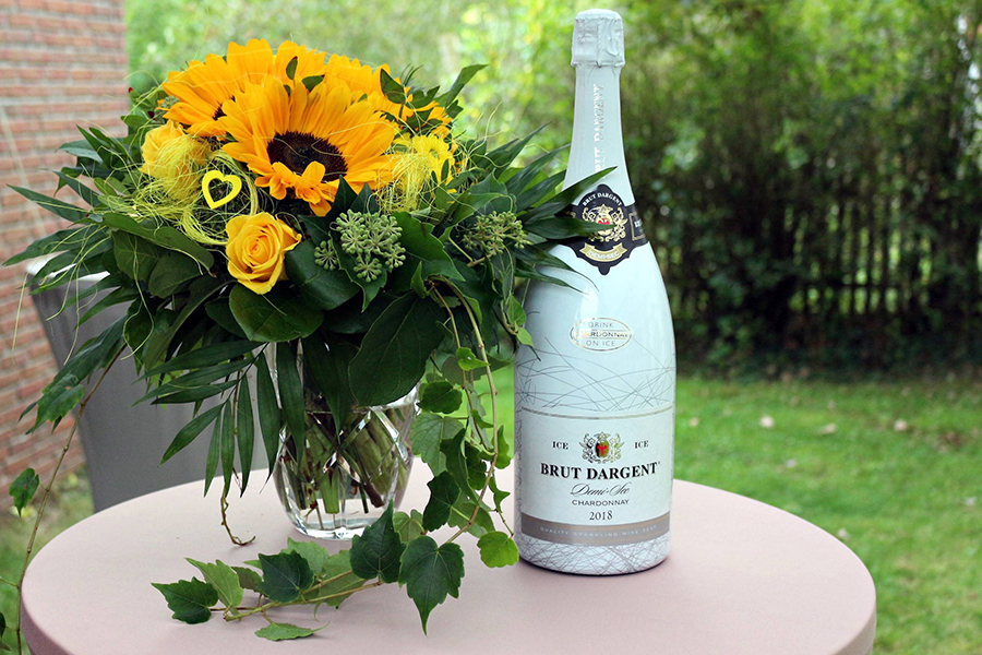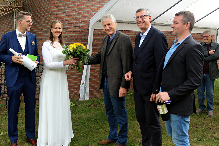 Nach den herzlichen Gratulationen der anwesenden Hochzeitsgäste, warteten schon Bürgerstiftungs-Vorsitzender Hans Jörg Fischer, Otzes Ortsbürgermeister Andreas Meyer und Burgdorfs Verwaltungschef Armin Pollehn im Hintergrund, um dem frisch vermählten Paar ein herbstliches Gebinde und etwas Prickelndes zu überreichen.