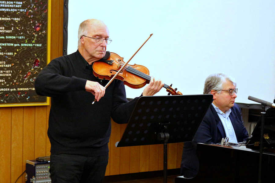 Die Wortbeiträge während der Gedenkveranstaltung wurden von Dr. Matthias Schorr (Violine) und Michael Schalamov (Klavier) mit hebräischen Melodien und Stücken von Bach und Kantor Meir Finkelstein würdevoll begleitet.