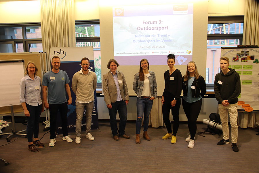 Im Hörsaal 2 moderierte parallel dazu Katharina Lika (RSB-Vorstand für Sportentwicklung) das Forum 3 mit dem Titel "Outdoorsport – Nicht nur ein Trend – Outdoorsport im Verein". Hier gab es Vorstellungen und Austausch mit mehreren Akteur:innen, die ihre Angebote und Erfahrungen zum Thema Outdoorsport bzw. Sport im Freien mit dem Plenum teilten und anschließend Fragen beantworteten. Mit dabei: Michael Diessner (Sport-Thieme), Sandy Stoll & Karl Schilling (Turn-Klubb zu Hannover) sowie Nina Panitz (LandesSportBund Niedersachsen) zusammen mit der Praktikantin Marieke Bölsing und dem Praktikanten Lenard Hansen.