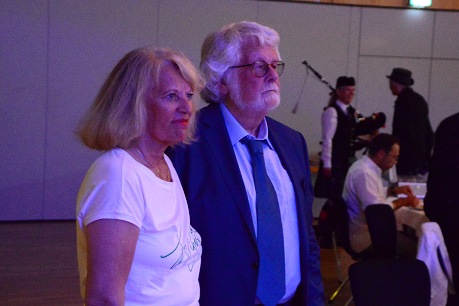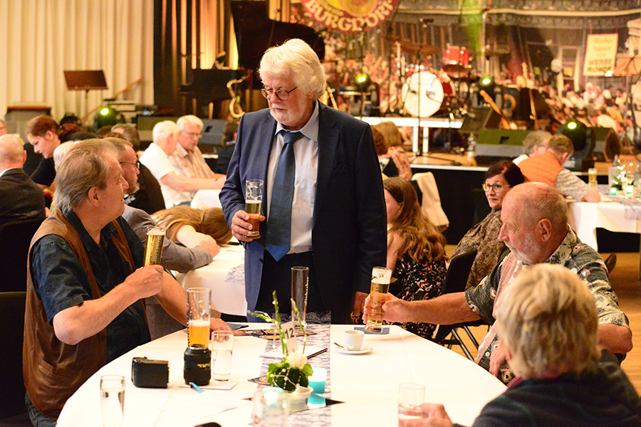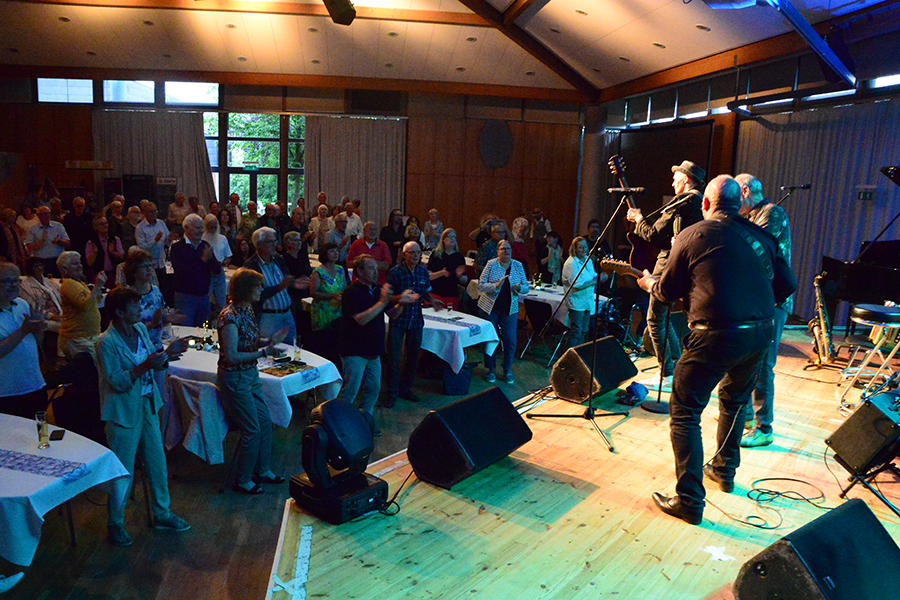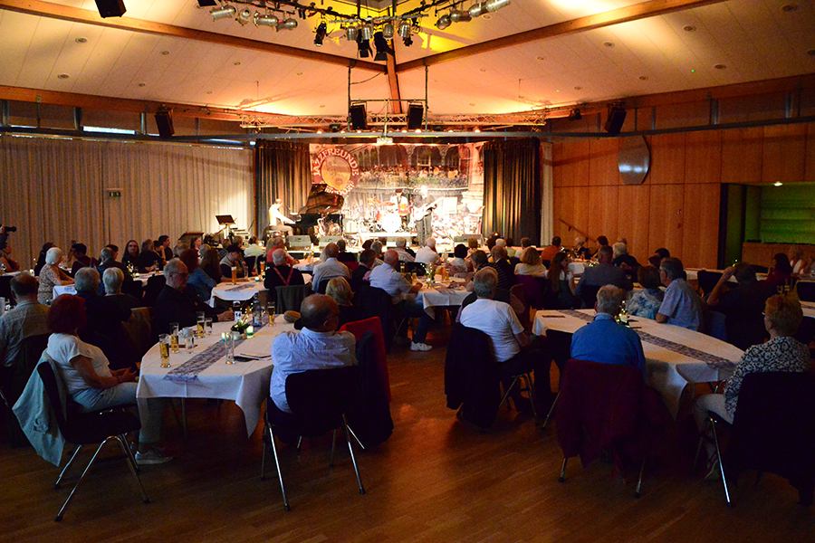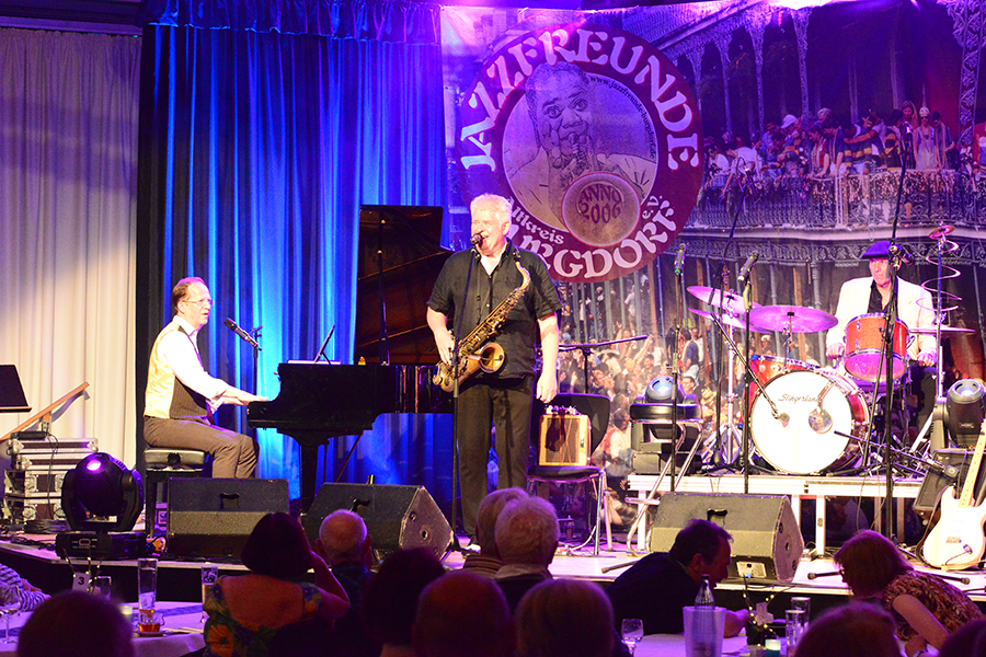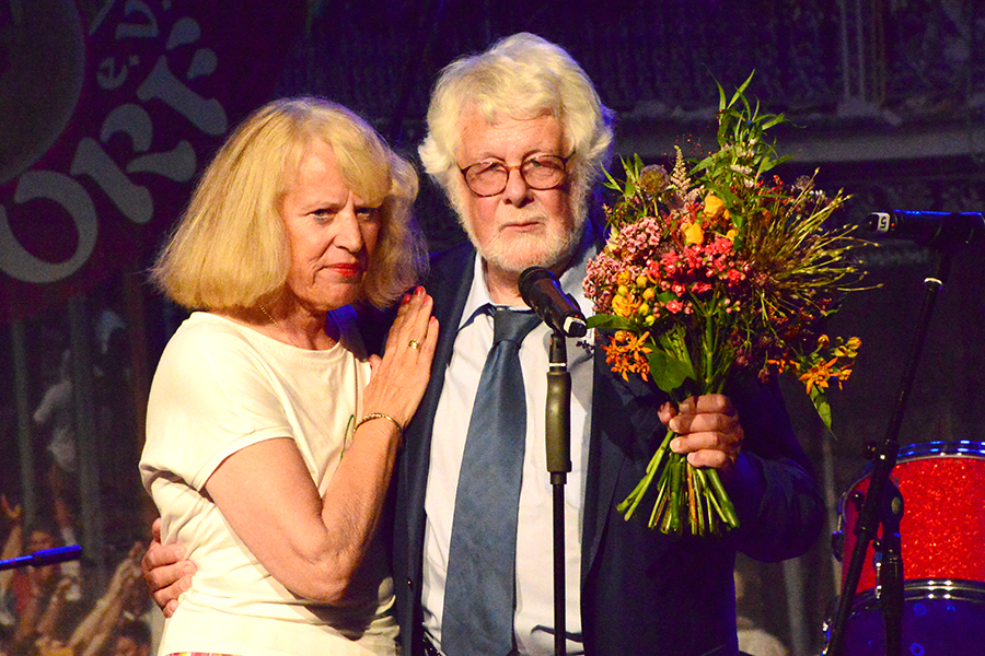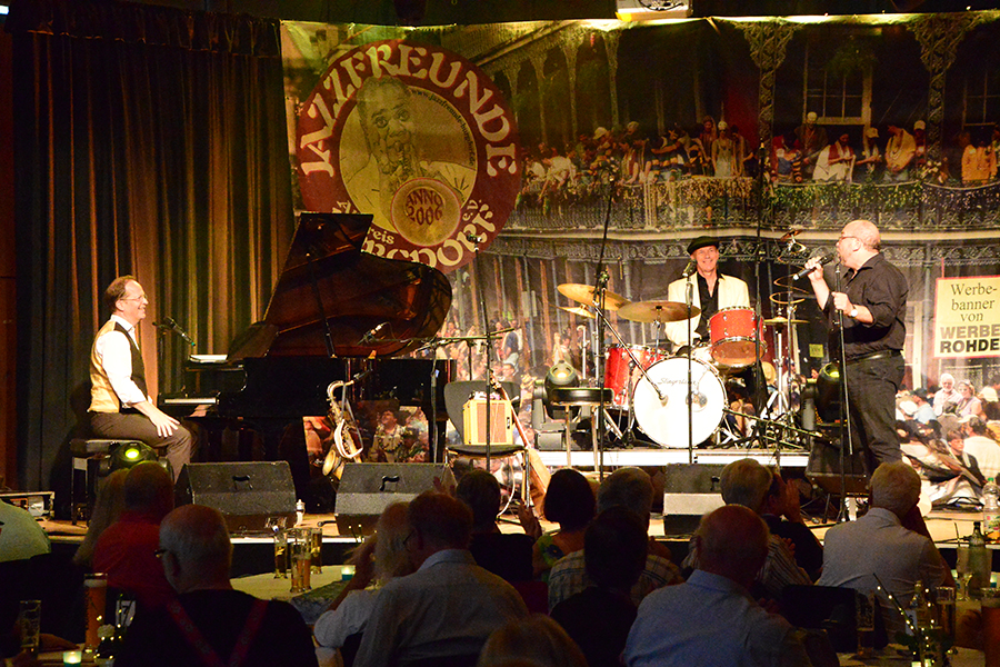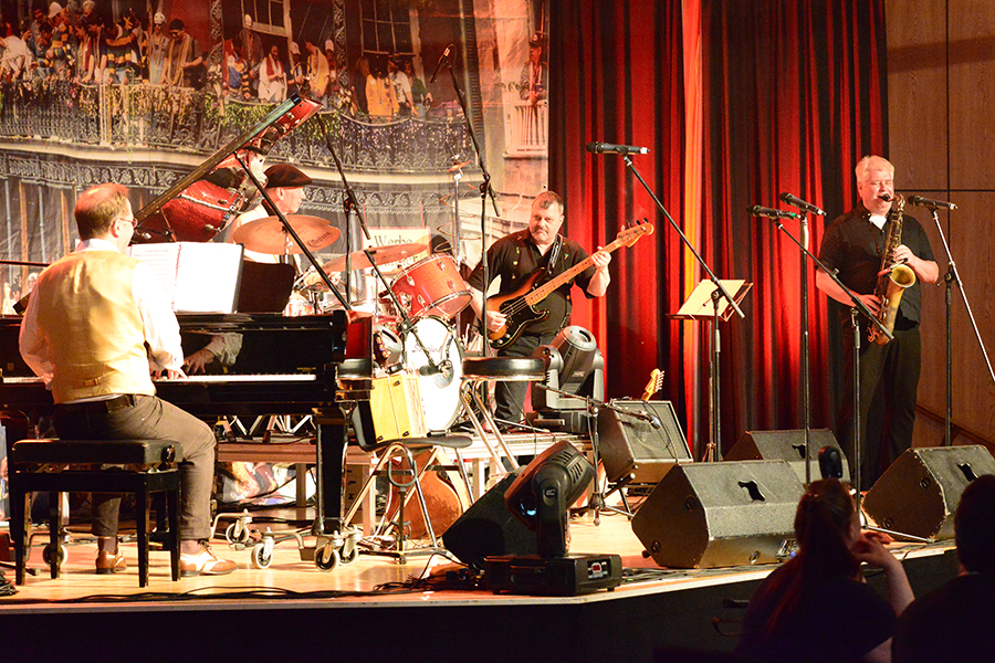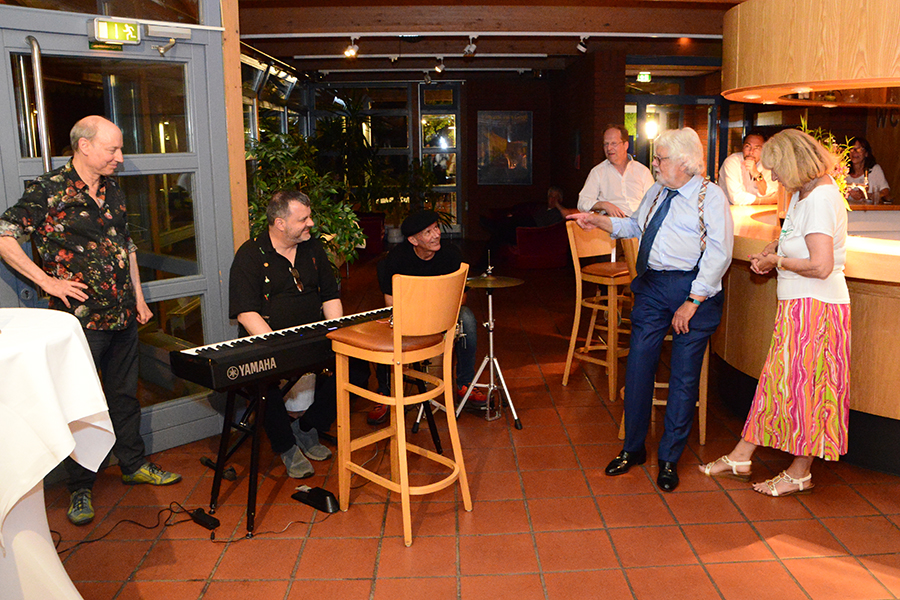 Unterbrochen wurde die Show vom Einzug der Dudelsack-Spielerin Ann-Kathrin Albert, gefolgt von Uwe Görlich und Marina Richter, zwei ehemalige Staatsanwälte. Sie hatten eine Laudatio für Paul Rohde vorbereitet, da dieser exakt an dem Tag seinen 80. Geburtstag feierte und auf 50 Jahre ehrenamtliche Arbeit zurückblicken konnte. Seine Leistung als Gründer des Jazzclubs wurde vom 2. Vorsitzenden Andreas Fehér und der unermüdlichen Helferin Carola Görs gewürdigt. Rohde bedankte sich für die Worte und stellte die Leistung seiner Frau Magitta hervor, ohne die nichts laufen würde.