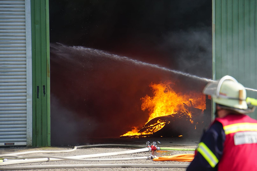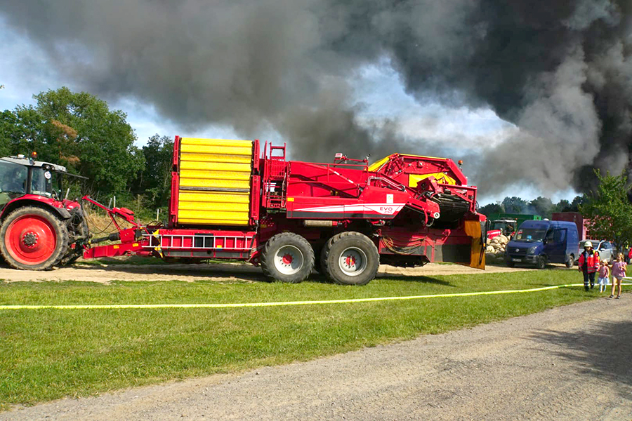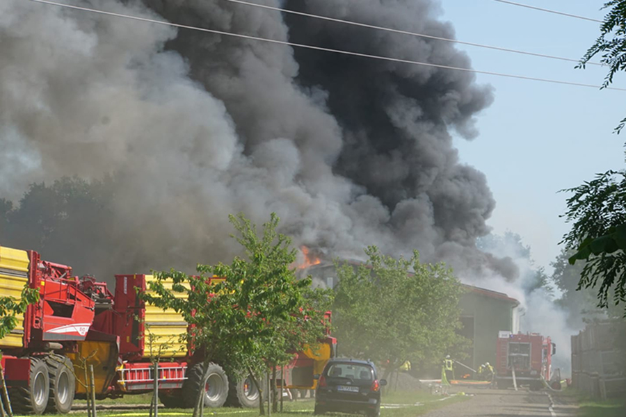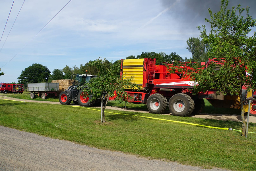 Vor Ort angekommen leiteten die ehrenamtlichen Feuerwehrkräfte umgehend einen Löschangriff ein, konnten jedoch das Gebäude nicht betreten: Von der Photovoltaikanlage wie auch in dem Gebäude vermutete Gasflaschen ging ein zu großes Risiko aus. Auch Explosionen konnten vernommen werden, so dass Burgdorfs Ortsbrandmeister Florian Bethmann, der auch die Einsatzleitung hatte, die Einsatzkräfte nicht in Gefahr bringen wollte und den Löschangriff von außen vornehmen ließ. Personen waren nicht in dem Gebäude, so dass eine defensivere Taktik die bessere Wahl war. Ein in der Scheune befindlicher Kartoffelroder konnte bereits noch im Vorfeld aus der brennenden Scheune gefahren werden. Von der Berufsfeuerwehr Hannover wurde das Löschunterstützungsfahrzeug alarmiert. Dieses ist ein Löschroboter, mit dem dann auch im Innern gelöscht werden konnte.