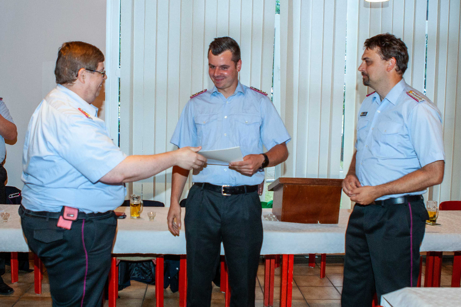 Durch Stadtbrandmeister Dennis-Frederik Heuer wurden Andreas Czlwik zum Hauptfeuerwehrmann und Kevin Meyer zum Ersten Hauptlöschmeister ernannt.