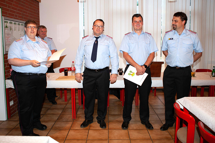 Im Beisein von Ortsbrandmeister Timo Scheffler (rechts) verlieh Stadtbrandmeister Dennis-Frederik Heuer (links) den Dienstgrad Hauptfeuerwehrmann an Andreas Czlwik (2. von links) und den Dienstgrad Erster Hauptlöschmeister an Kevin Meyer. / Foto: Dieter Siedersleben