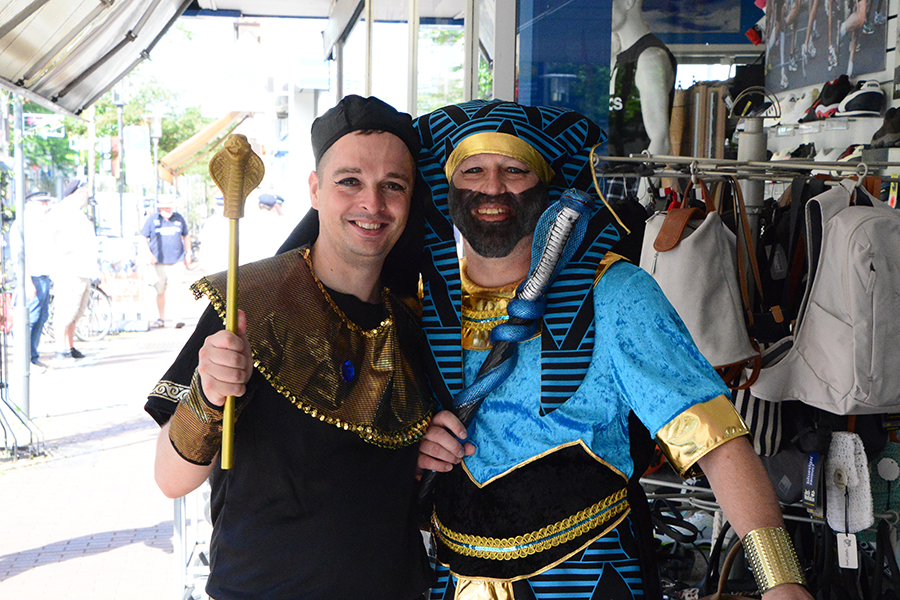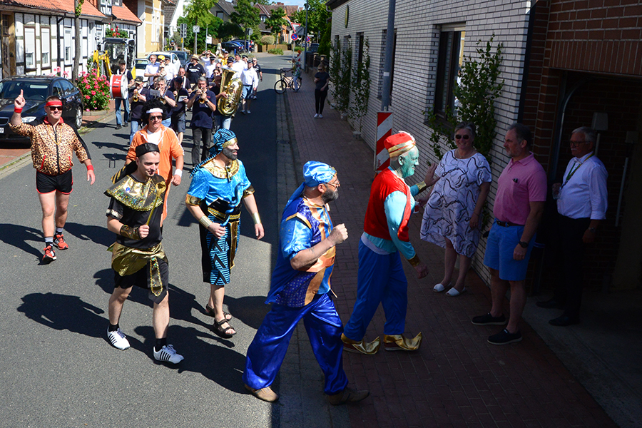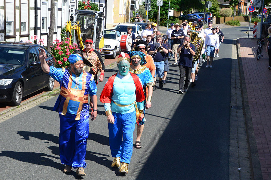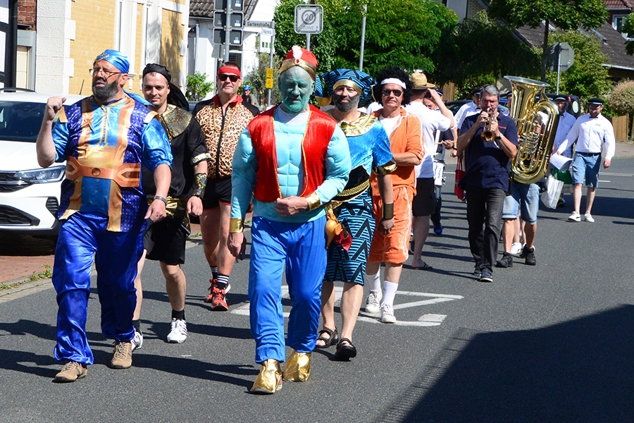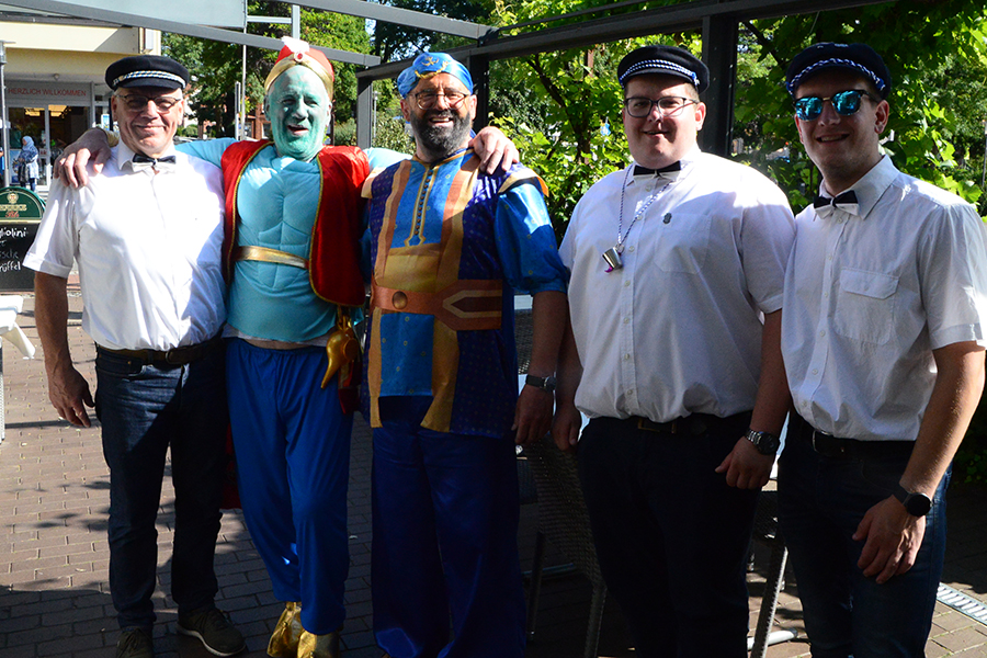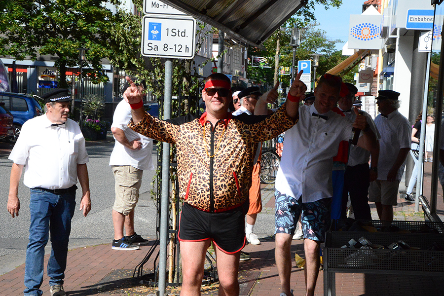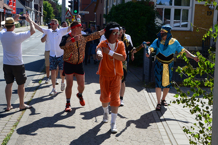 So trafen sich die Junggesellen am frühen Morgen beim Friseurteam Wadewitz in der Braunschweiger Straße, wo sie in ihre Kostüme stiegen und entsprechend geschminkt wurden. So waren die Sammlerpaare als Aladdin, TopGun-Piloten und Pharaonen ab 8 Uhr in den Straßen der Stadt unterwegs.