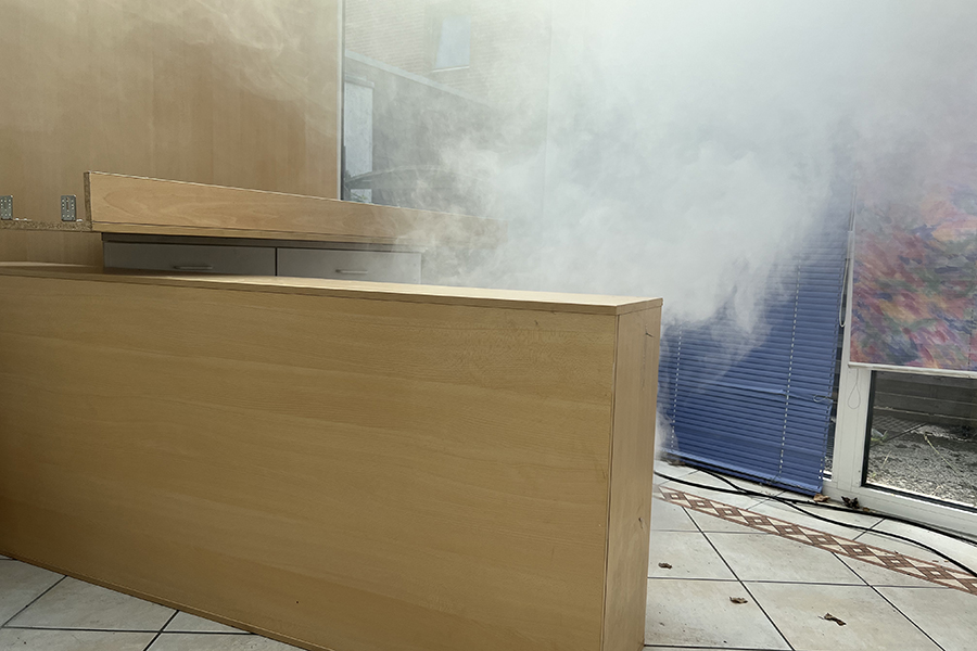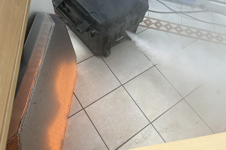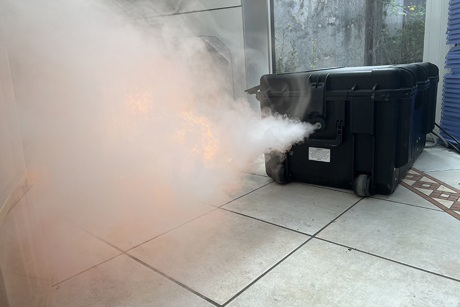 Die Ausbildung wurde durch Thomas Enders und Uwe Siemons, Geschäftsführer von "Feuerwehr Training & Coaching" aus Remscheid, durchgeführt. Sie hatten ebenfalls modernste Technik dabei: Ein digitales Flammenpanel simulierte das Feuer und eine damit verbundene Nebelmaschine sorgte für die Verrauchung. "Mit dem System der Firma Lion können verschiedene Feuerarten simuliert werden", so Thomas Enders. Mit dem ebenfalls digitalem Hohlstrahlrohr, der Schlauch war statt mit Wasser mit Sand gefüllt, um das selbe Gewicht zu haben, wurde ebenfalls digital das Feuer gelöscht. Ist beim Löschen der Löschwassereinsatz zu gering, lodert das Feuer wieder auf, ist er erfolgreich, wird der Rauch hell beleuchtet, um Wasserdampf zu simulieren.