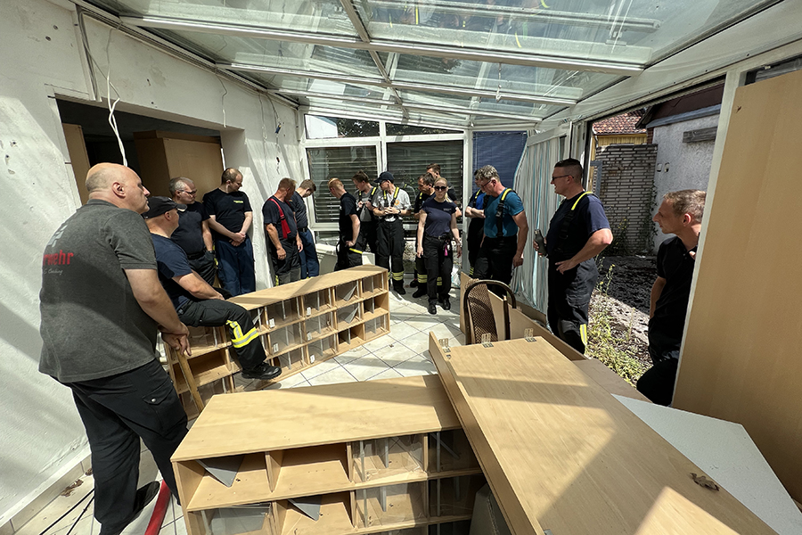 So stand zunächst die "einfache" Menschenrettung aus dem Gebäude auf dem Programm. Am Nachmittag ging es dann beispielsweise um das Retten einer Einsatzkraft aus dem ersten Obergeschoss mittels einer Schleifkorbtrage, auf der die Person die steile Treppe heruntergelassen werden musste.