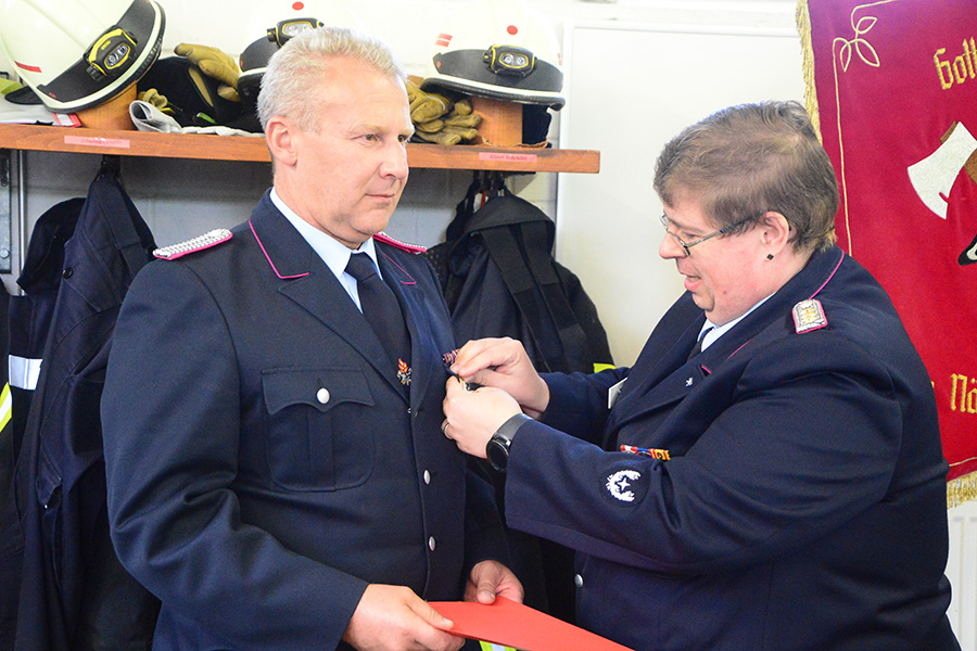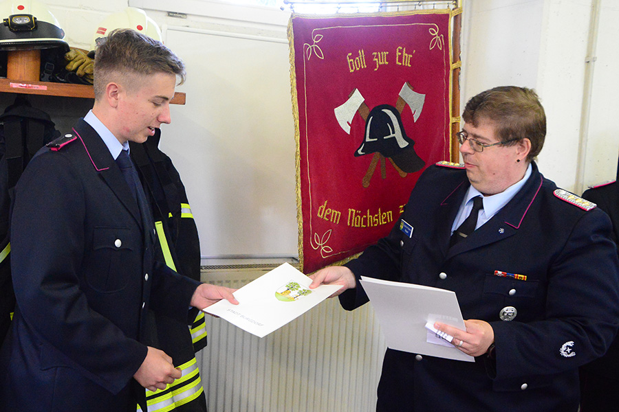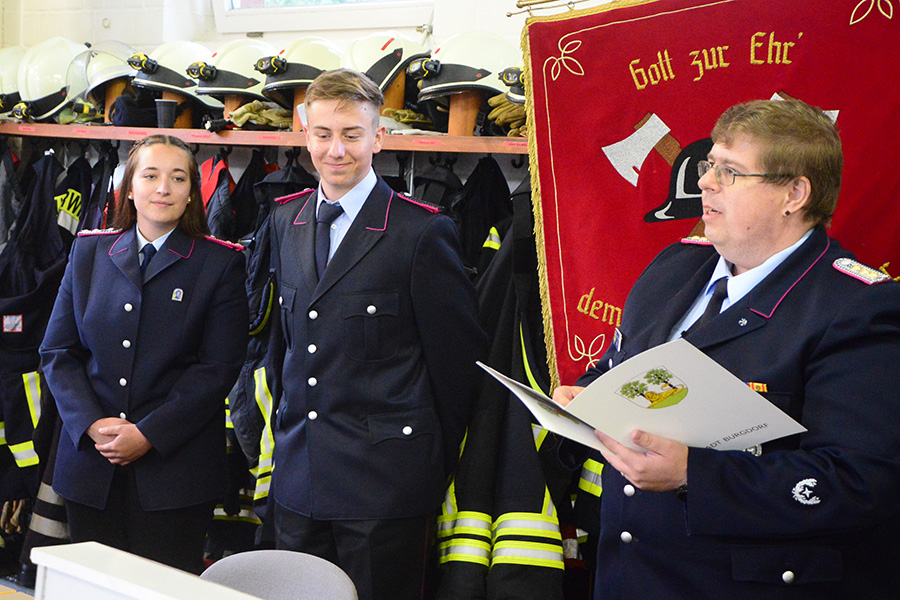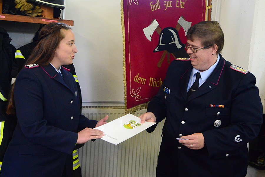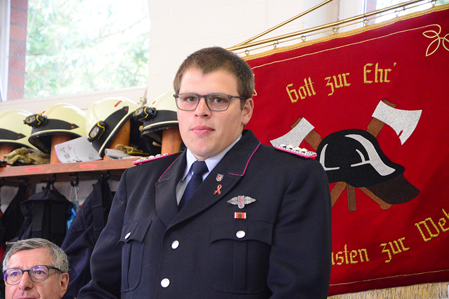 Erfreulich zeigt er sich auch über die Anzahl der Frauen in der Ortsfeuerwehr. Im vergangenen Jahr waren bei einem Einsatz mehr Frauen als Männer auf den Fahrzeugen. Auch mit der Beförderung von Johanna Licht zur Löschmeisterin gibt es ein weiteres Novum in Dachtmissen: Die erste Löschmeisterin. Den ersten Dienstgrad seiner Feuerwehrlaufbahn erhielt Leon Kleine, der zum Feuerwehrmann ernannt wurde und seinen Diensteid ablegte.