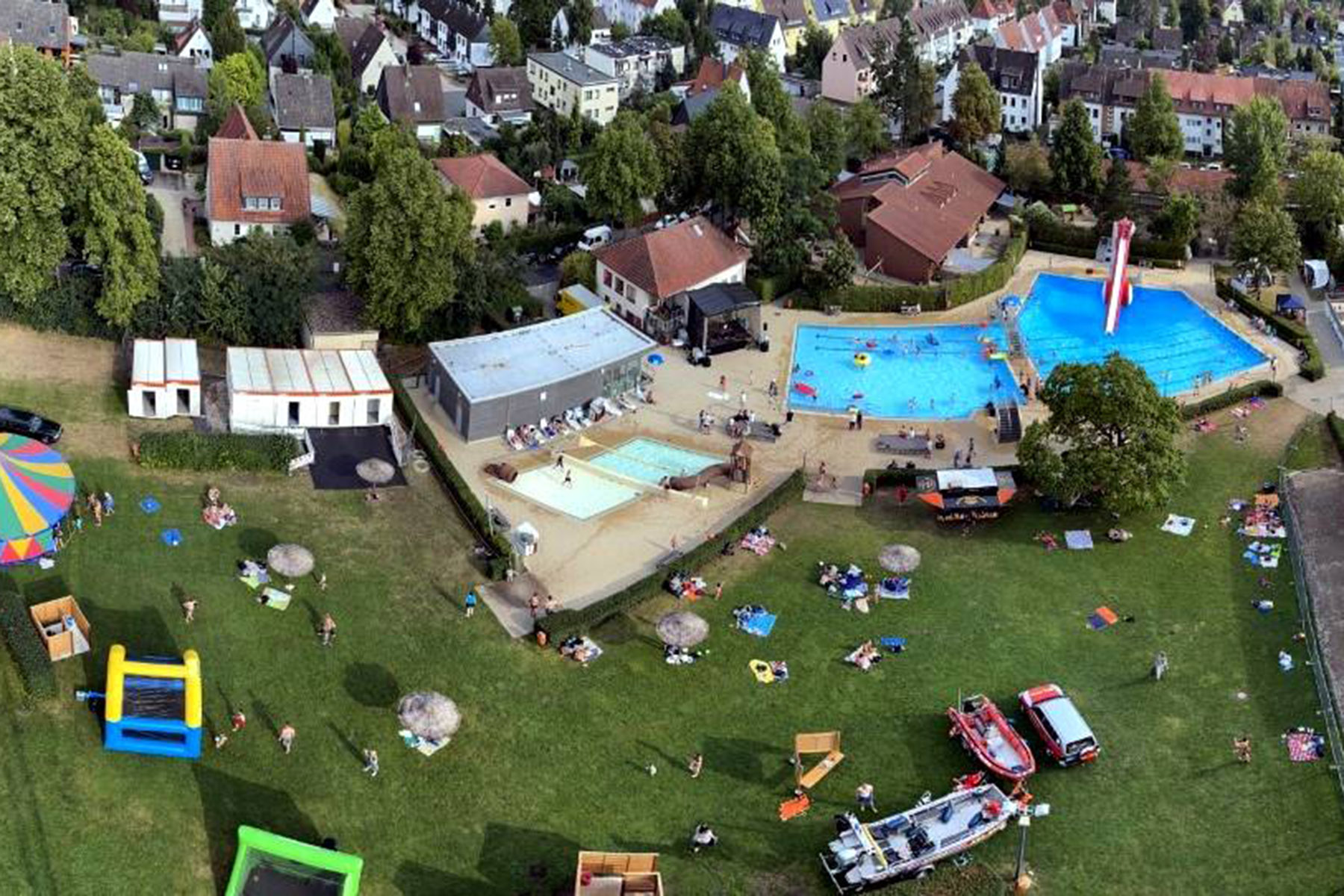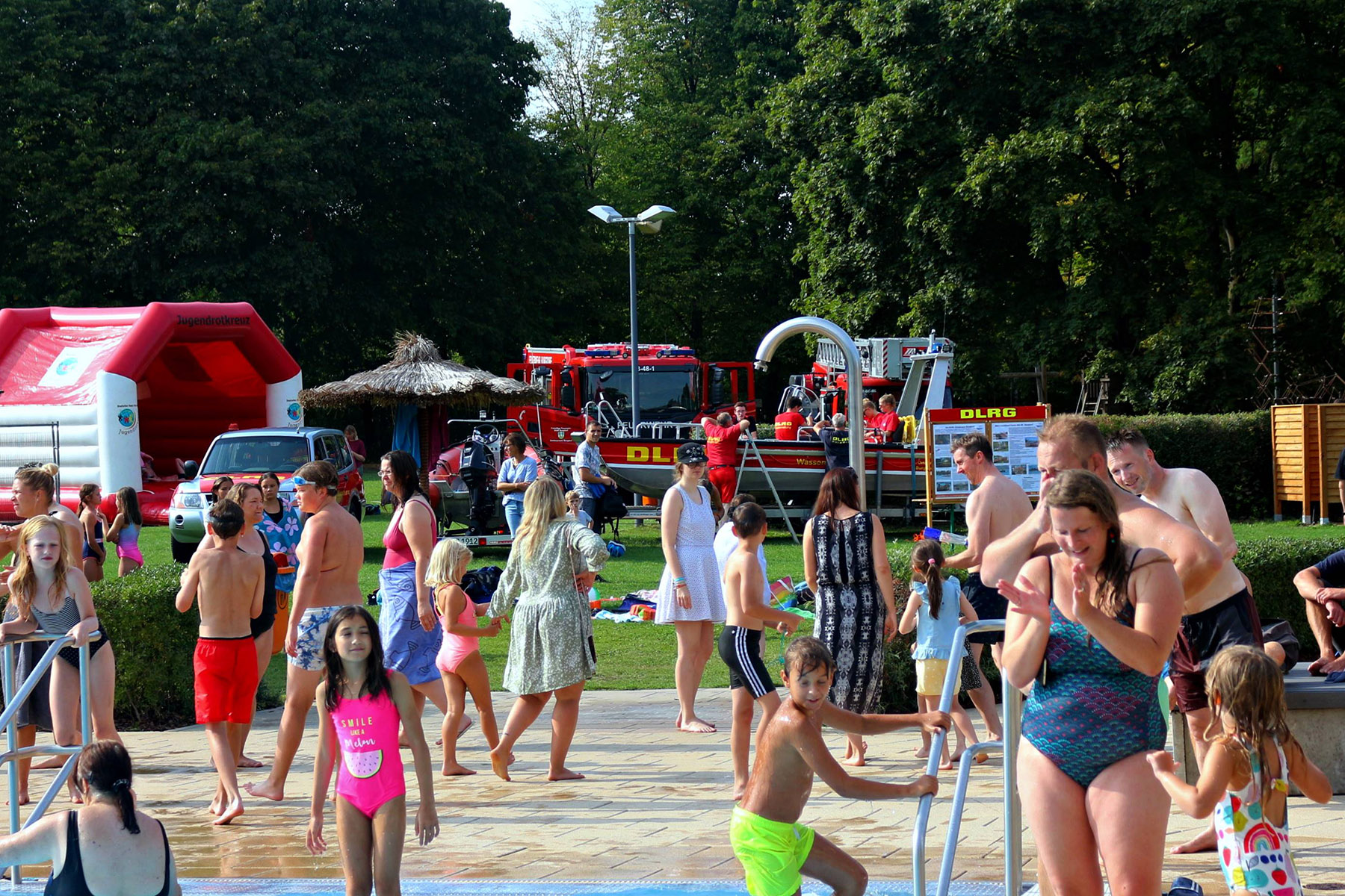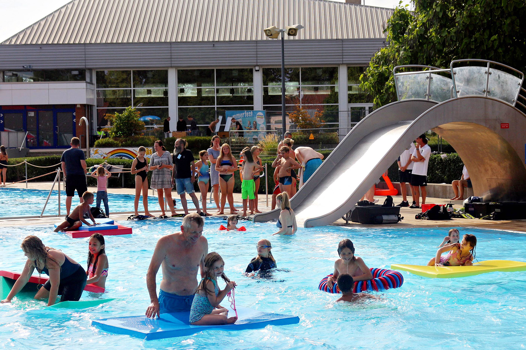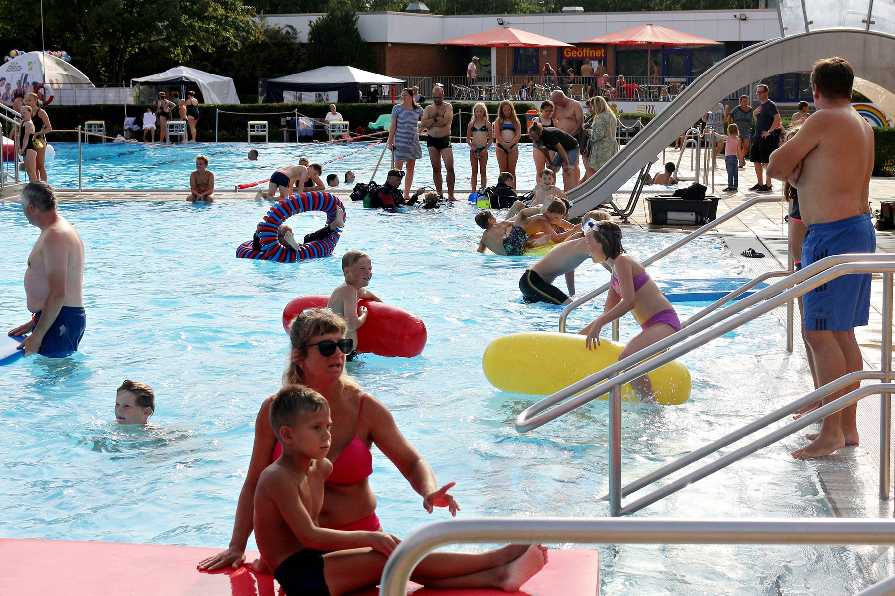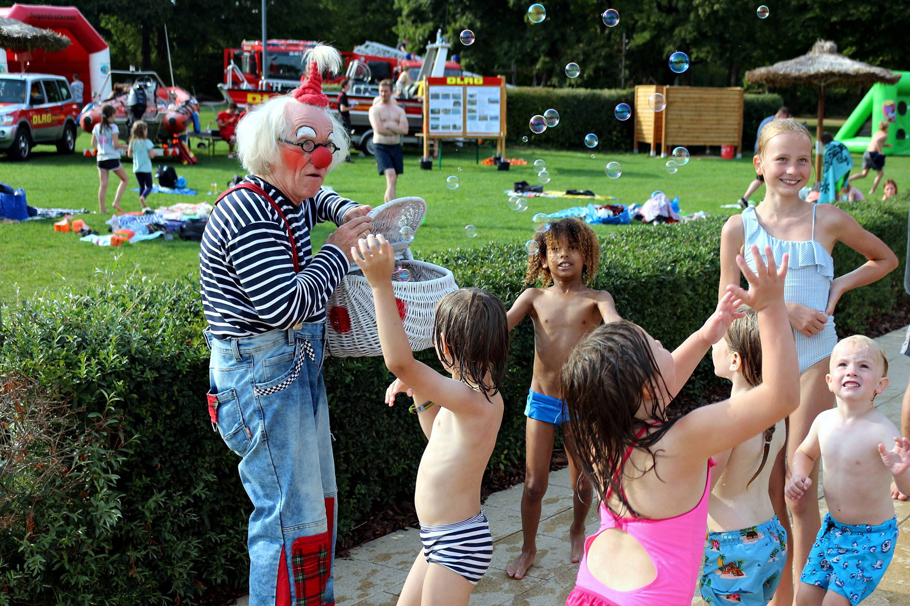 Zum Riesenprogramm gehörte selbstverständlich die Riesenrutsche vom 5-Meter Sprungturm, die Riesenhüpfburg des Jugendrotkreuz und ein Kicker-Turnier, der Kinderzirkus Kritzpritzknuckelmuckeldü des JohnnyB. um Laura Ohlemacher sowie Clown Fidolo, der aus seinem weißen Weidekörbchen kleine Seifenblasen aufsteigen ließ. Darüber hinaus präsentierten sich die Burgdorfer Ortsgruppe der DLRG und die Freiwillige Feuerwehr der Auestadt auf der großen Liegewiese.