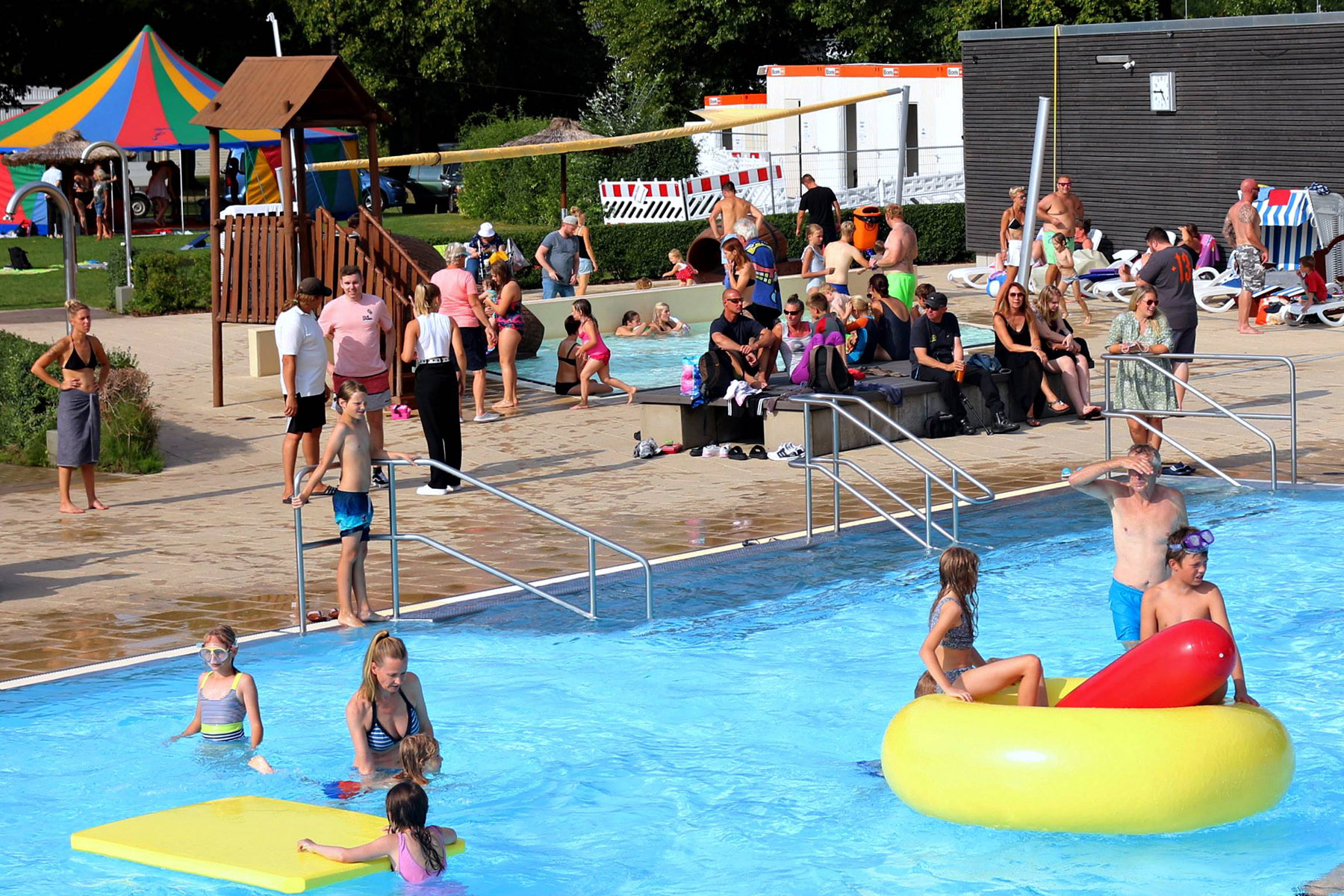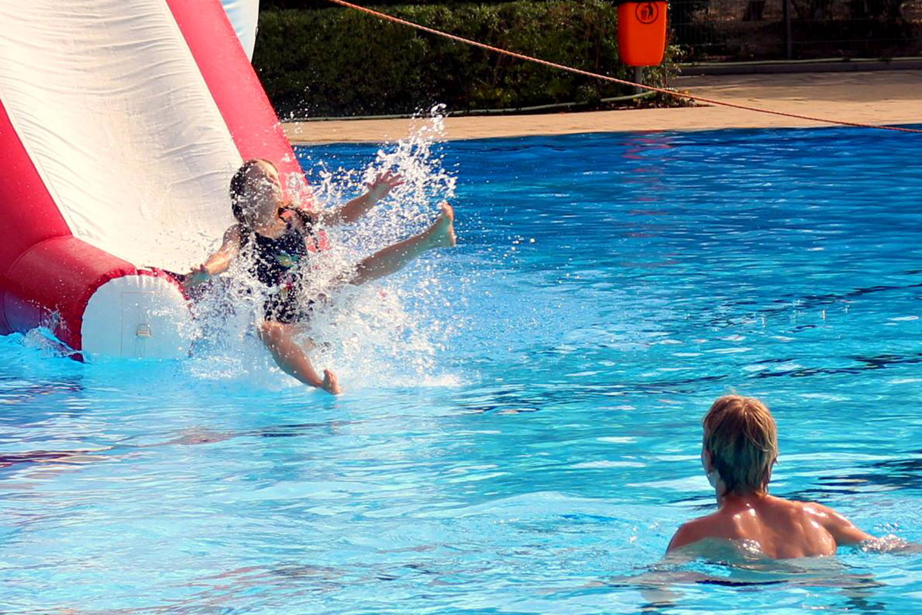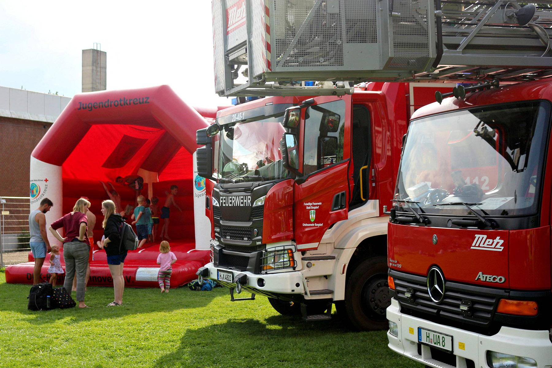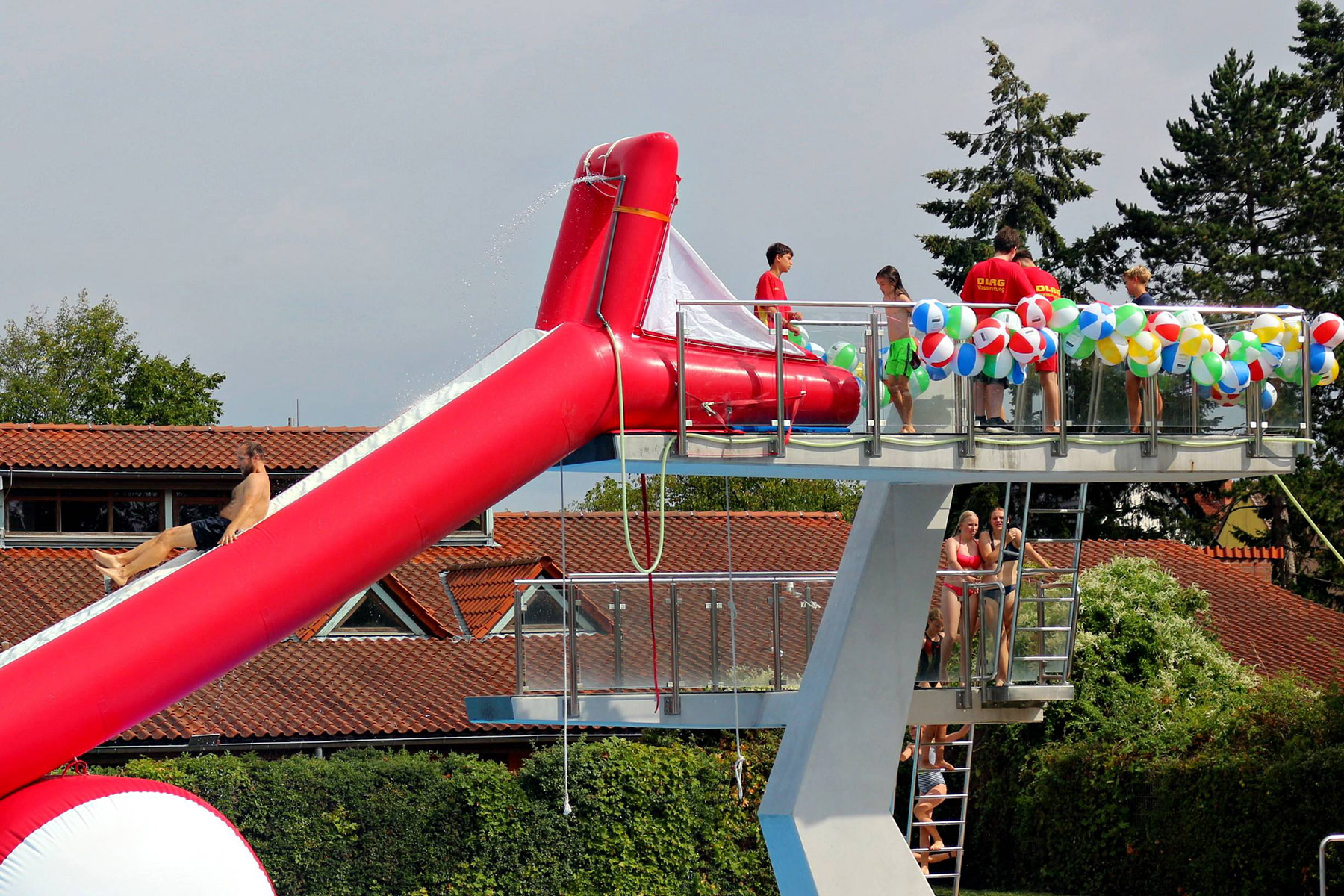 Zum Riesenprogramm gehörte selbstverständlich die Riesenrutsche vom 5-Meter Sprungturm, die Riesenhüpfburg des Jugendrotkreuz und ein Kicker-Turnier, der Kinderzirkus Kritzpritzknuckelmuckeldü des JohnnyB. um Laura Ohlemacher sowie Clown Fidolo, der aus seinem weißen Weidekörbchen kleine Seifenblasen aufsteigen ließ. Darüber hinaus präsentierten sich die Burgdorfer Ortsgruppe der DLRG und die Freiwillige Feuerwehr der Auestadt auf der großen Liegewiese.