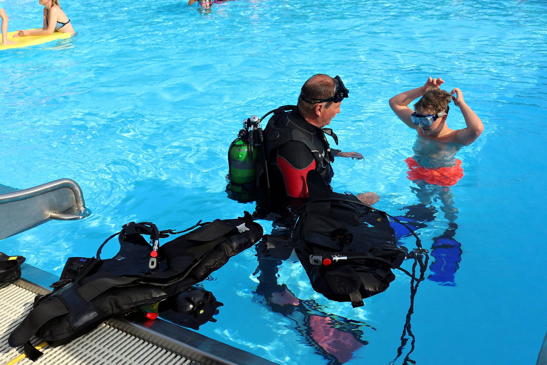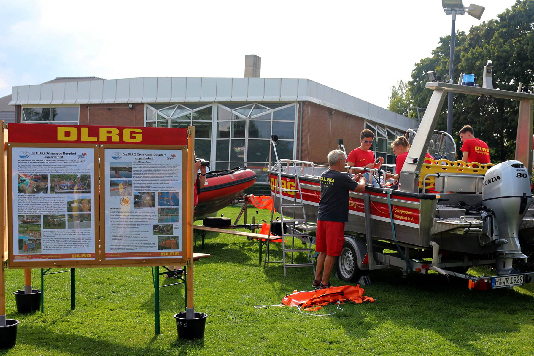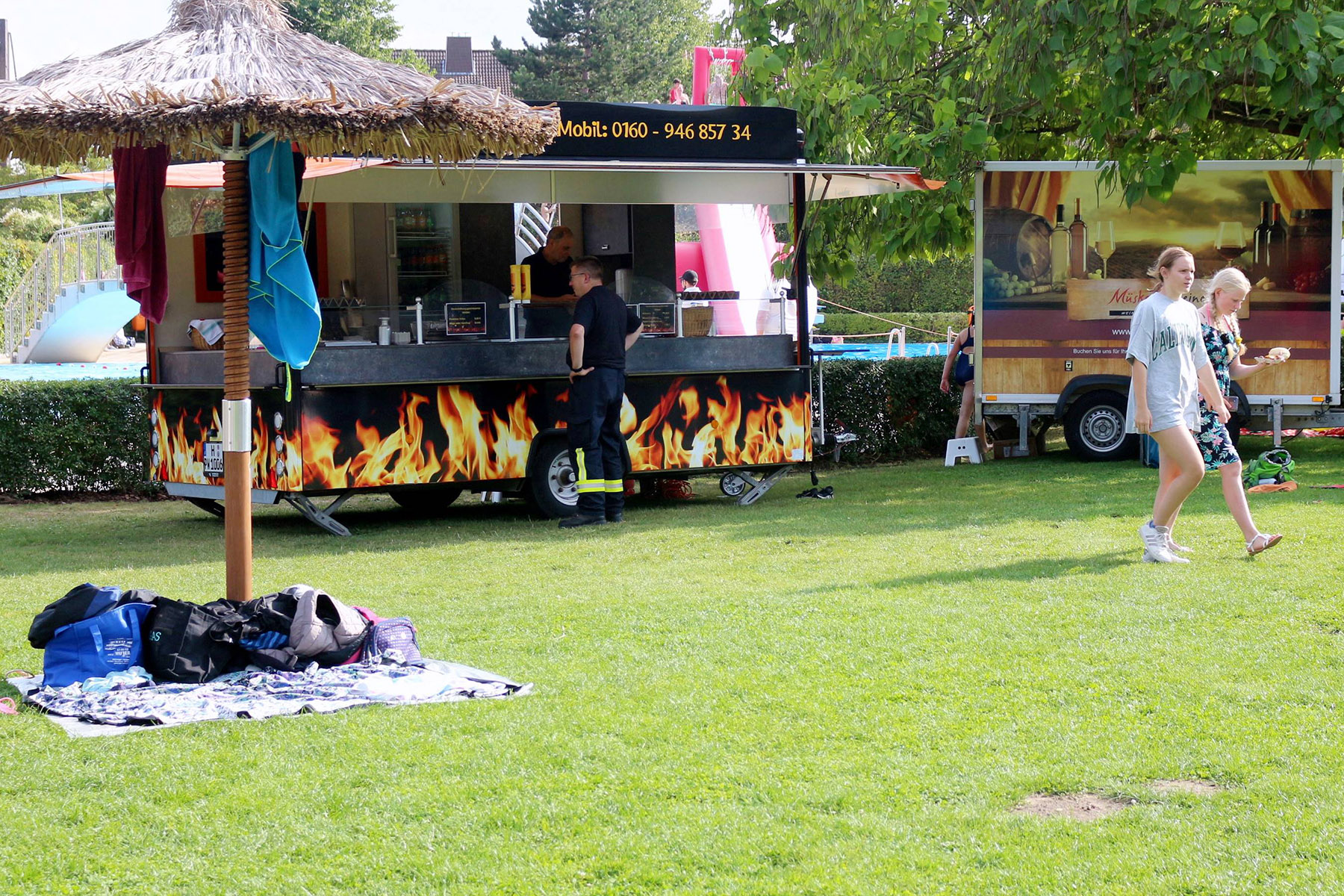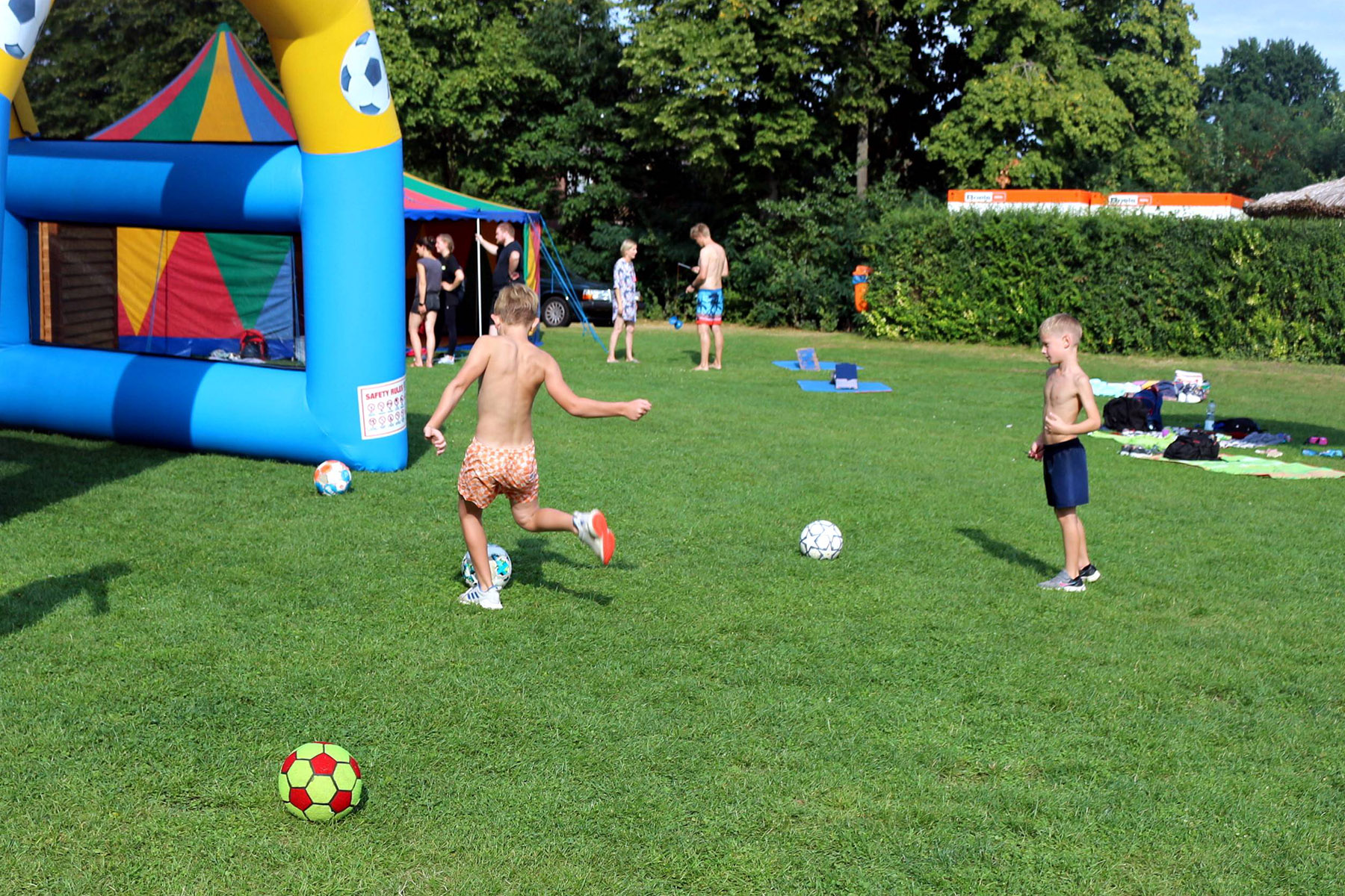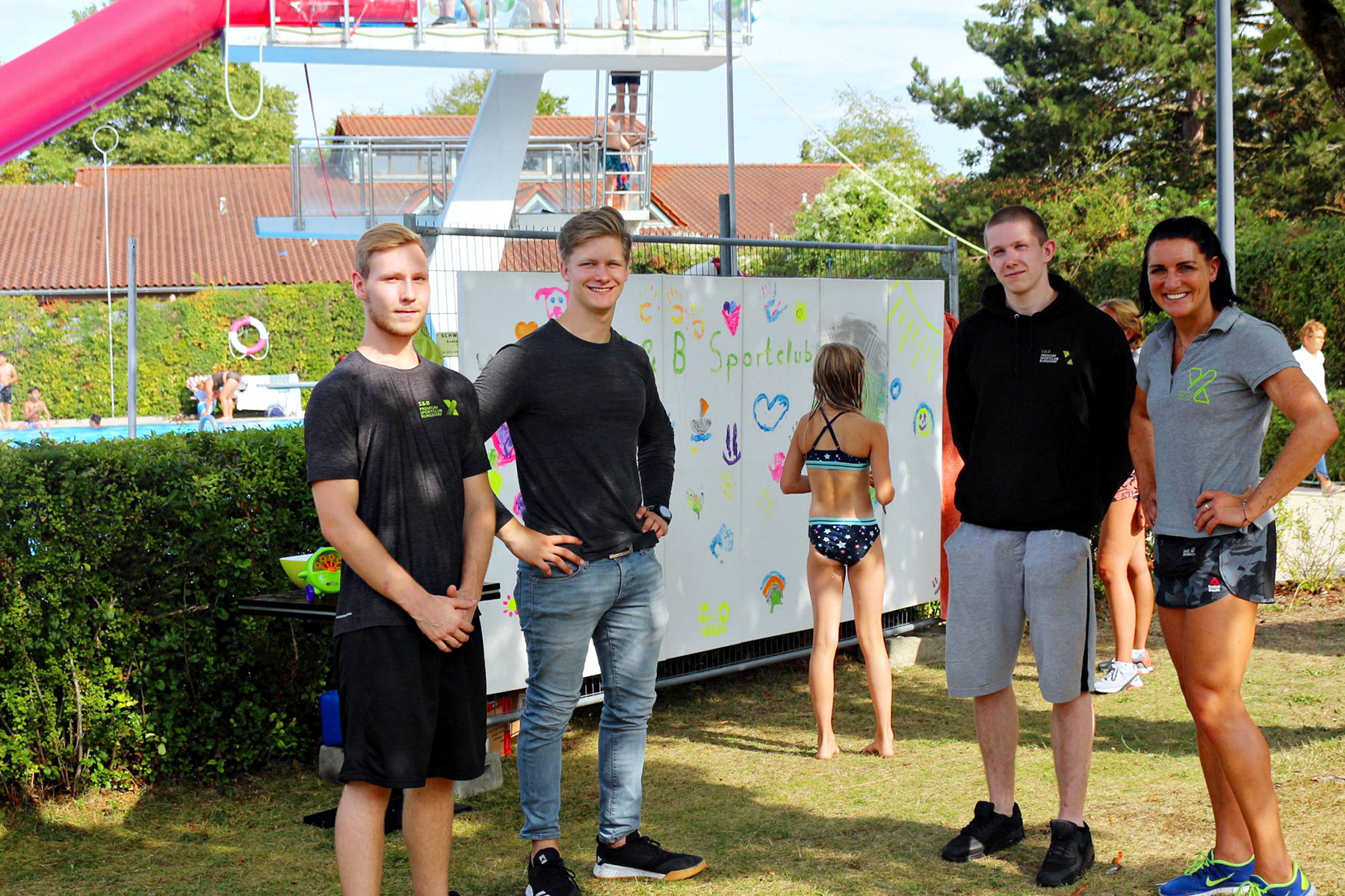 Zum Riesenprogramm gehörte selbstverständlich die Riesenrutsche vom 5-Meter Sprungturm, die Riesenhüpfburg des Jugendrotkreuz und ein Kicker-Turnier, der Kinderzirkus Kritzpritzknuckelmuckeldü des JohnnyB. um Laura Ohlemacher sowie Clown Fidolo, der aus seinem weißen Weidekörbchen kleine Seifenblasen aufsteigen ließ. Darüber hinaus präsentierten sich die Burgdorfer Ortsgruppe der DLRG und die Freiwillige Feuerwehr der Auestadt auf der großen Liegewiese.