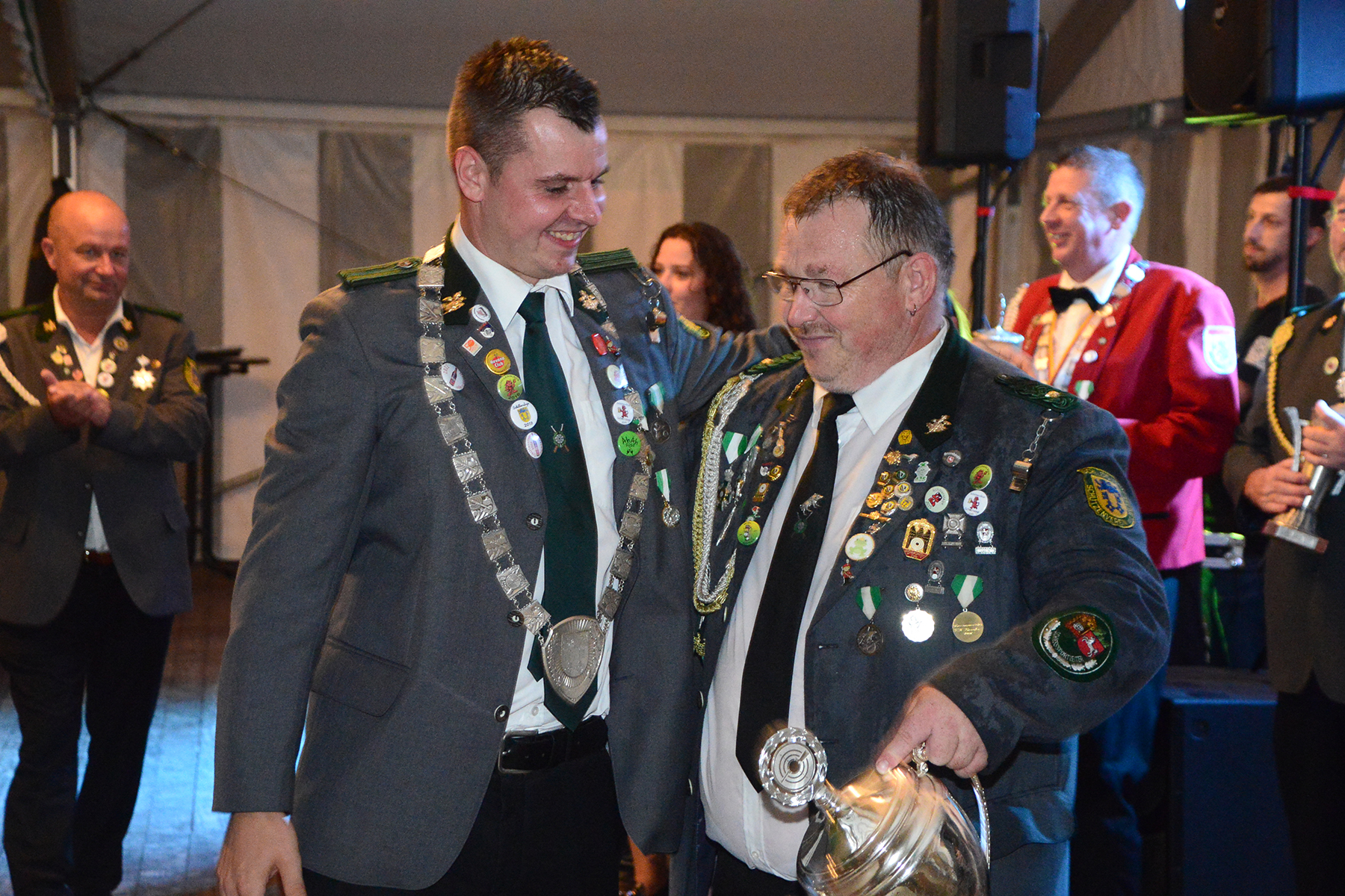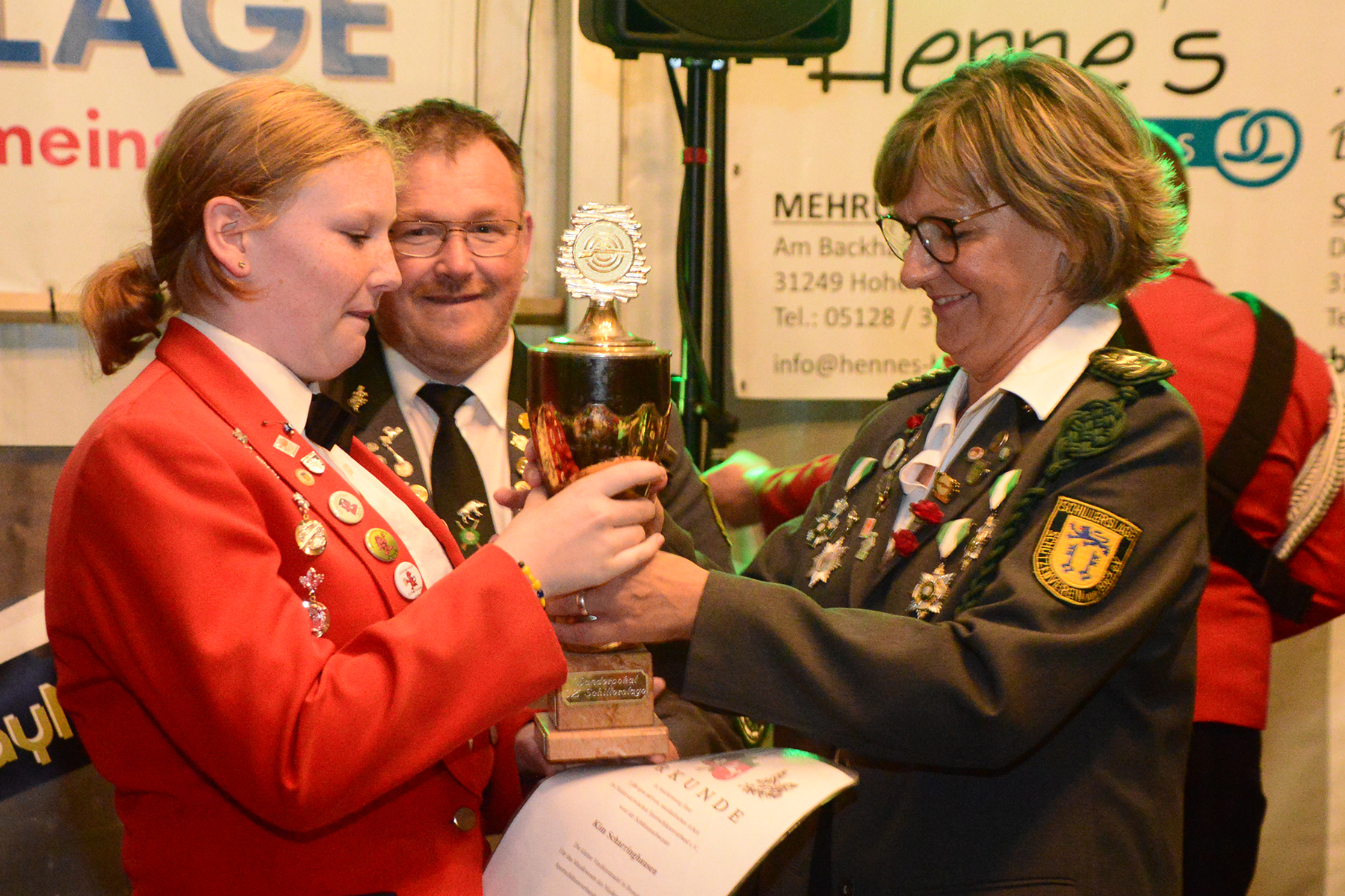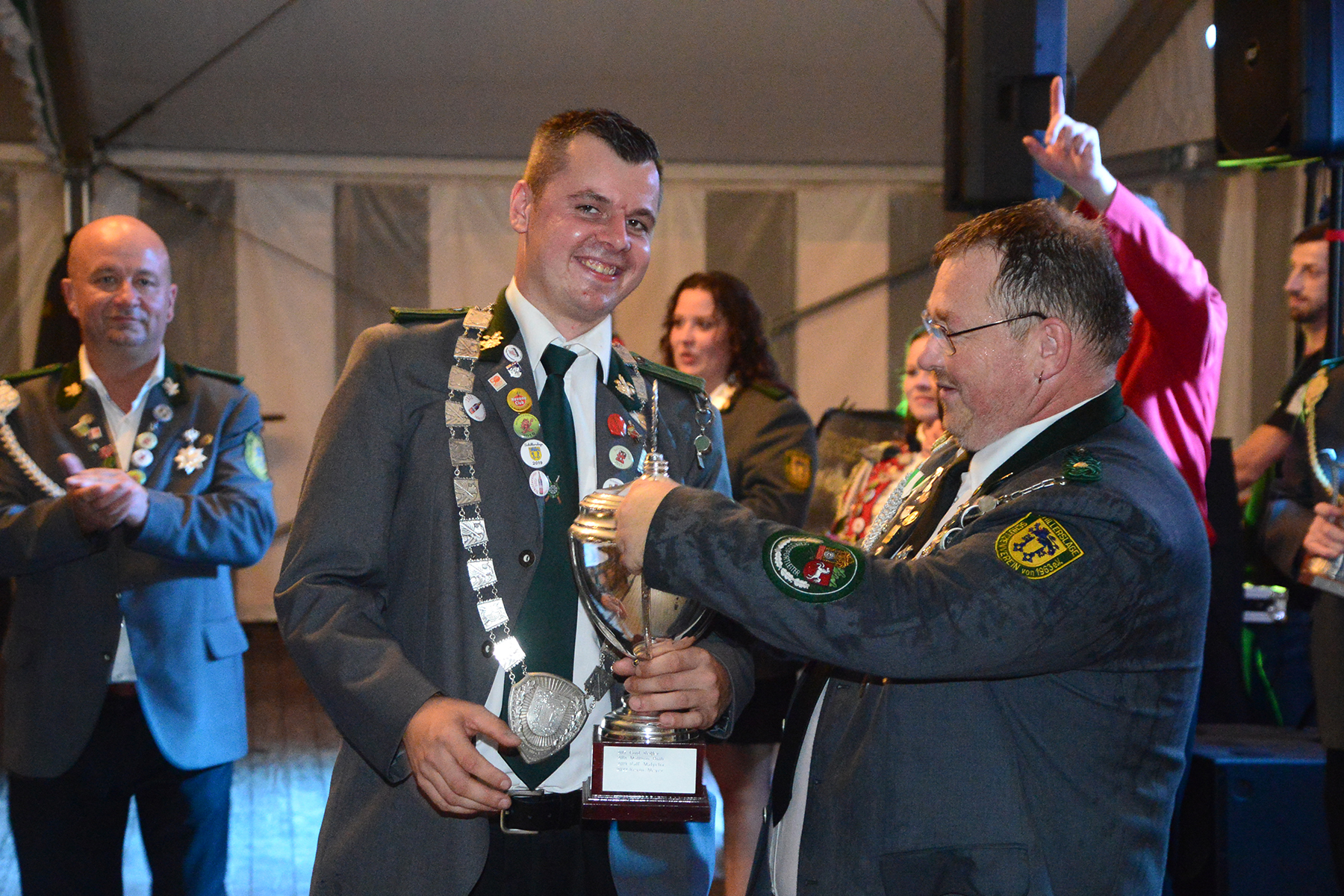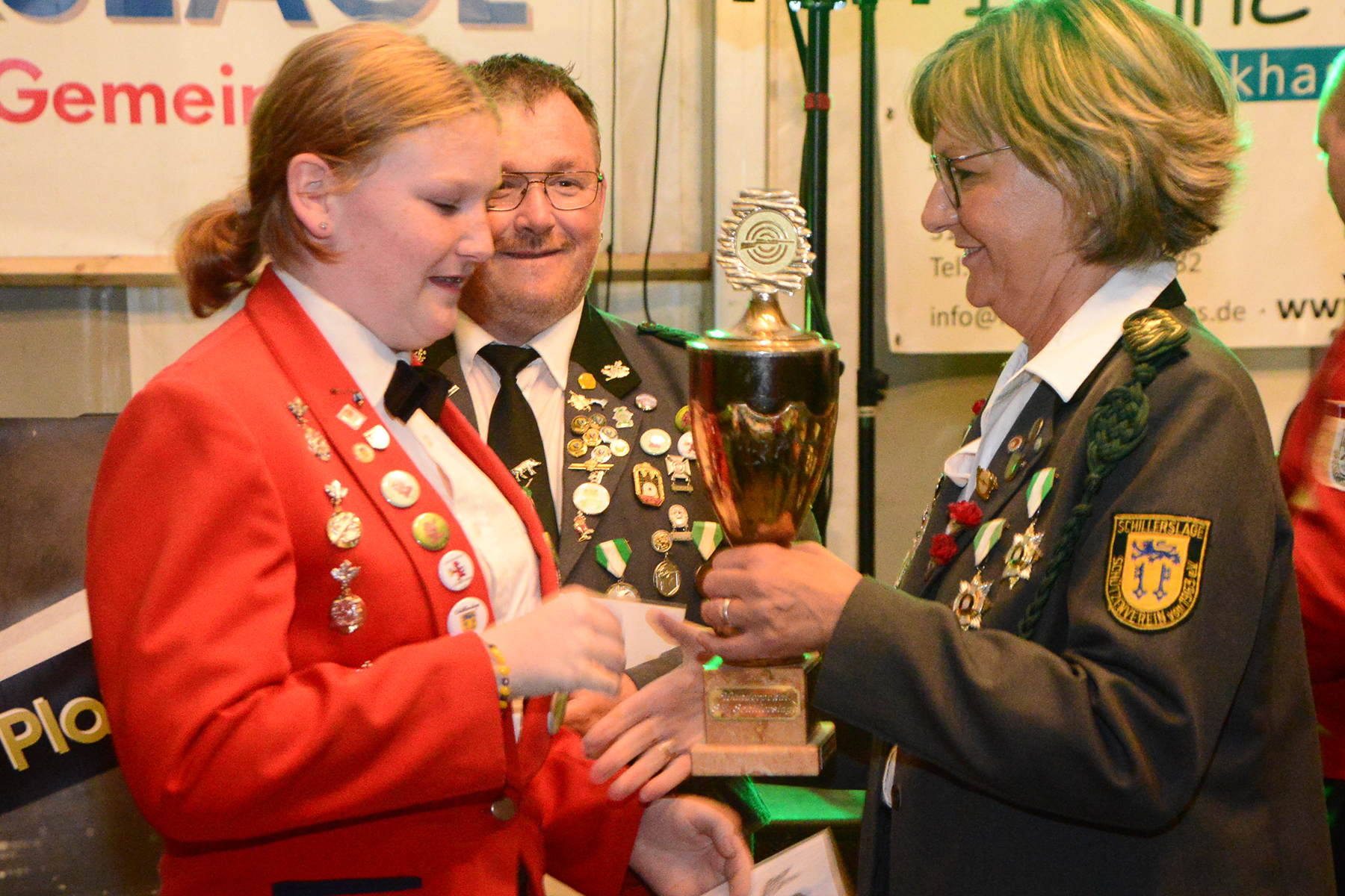 Ehe die neuen Majestäten, die am vergangenen Sonntag bekannt gegeben worden waren, inthronisiert werden konnten, nutzte der Vorstand die Gelegenheit, Dank an Kerstin Huth vom Festausschuss auszusprechen. Weiter wurden der Damenpokal an Katharina Scharringhausen und der Schützenpokal an Jörg Reupke überreicht. Der Spielmannszug hatte in seinen Reihen ebenfalls einen Pokal ausgeschossen: Den Oldiepokal errang Kim Scharringhausen. Die Ehrung des Spielmannszuges mit dem "Pokal der 1000 Möglichkeiten" ging an Tobias Bähr. Zudem ehrten der Verein wie auch der Spielmannszug langjährige Mitglieder.