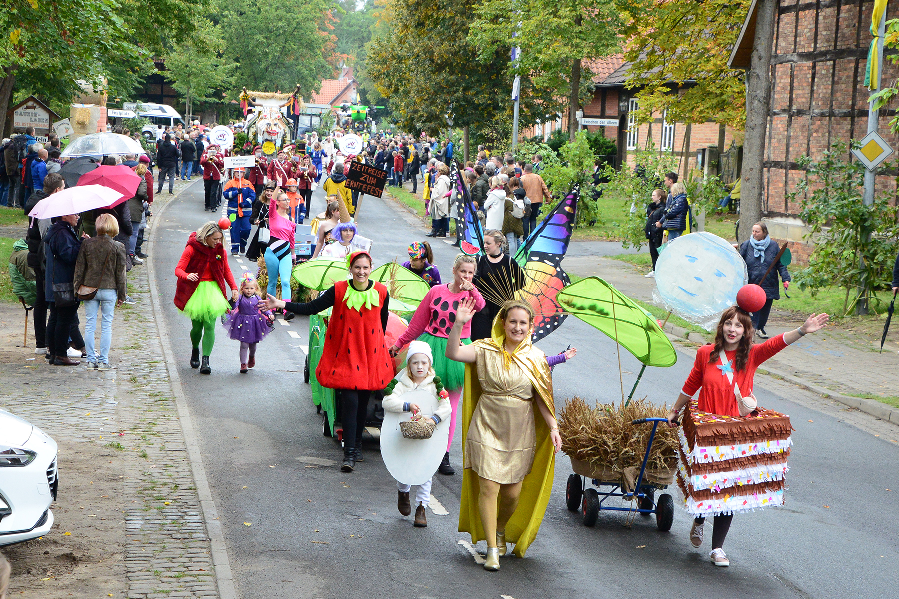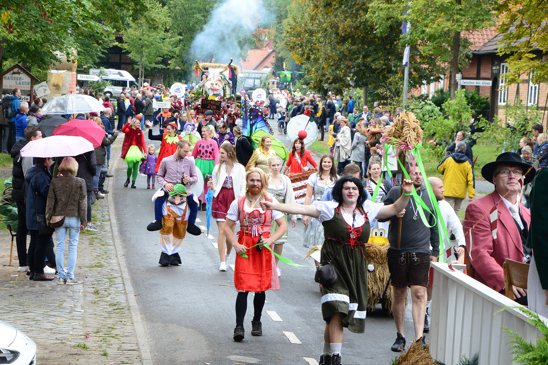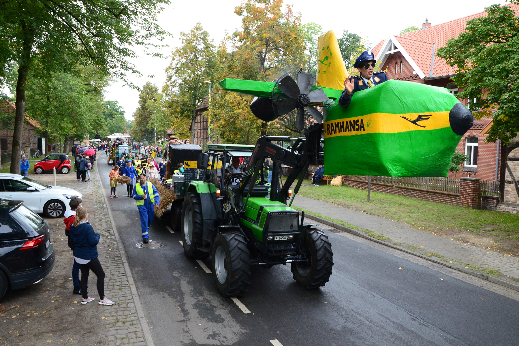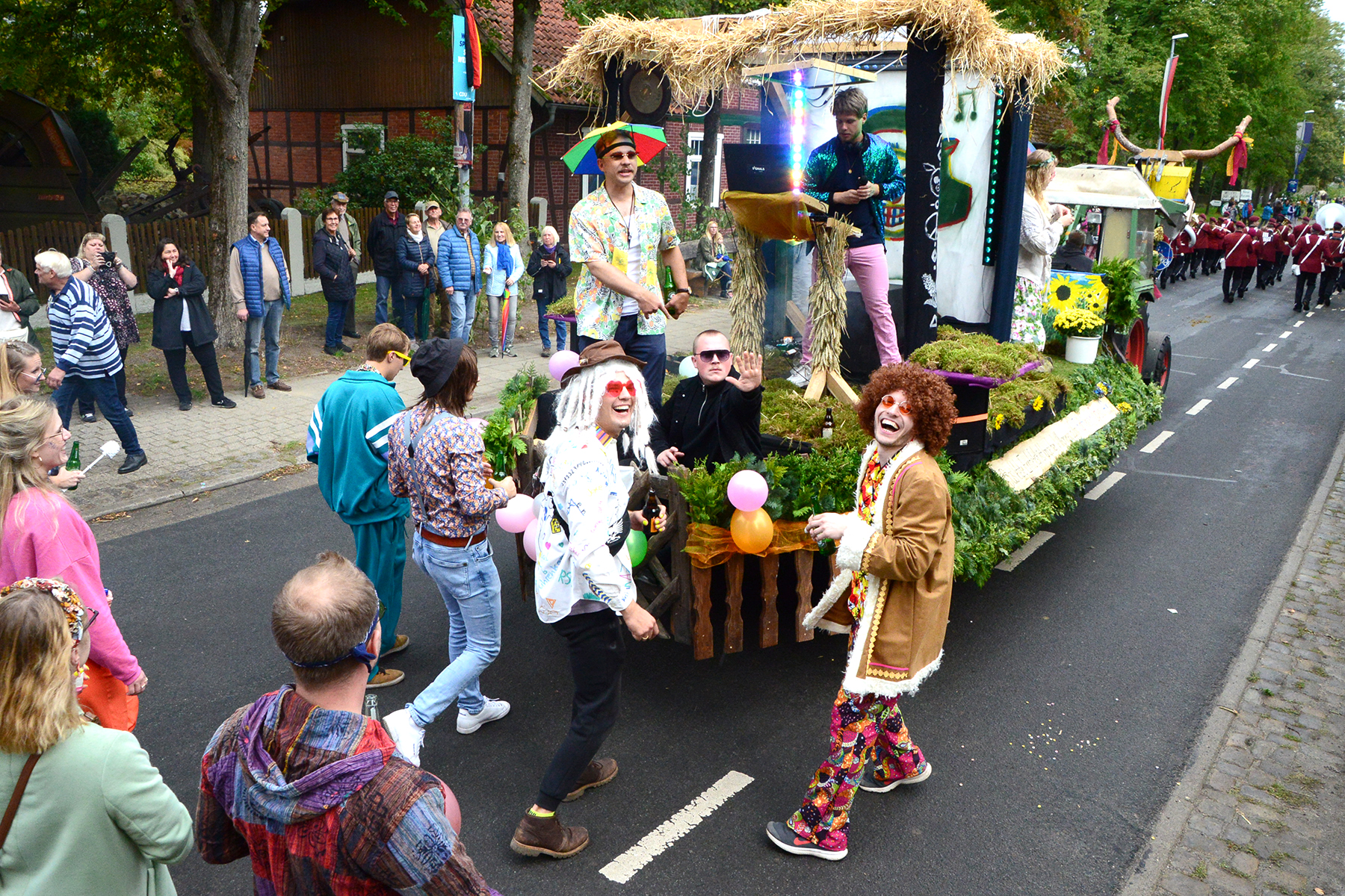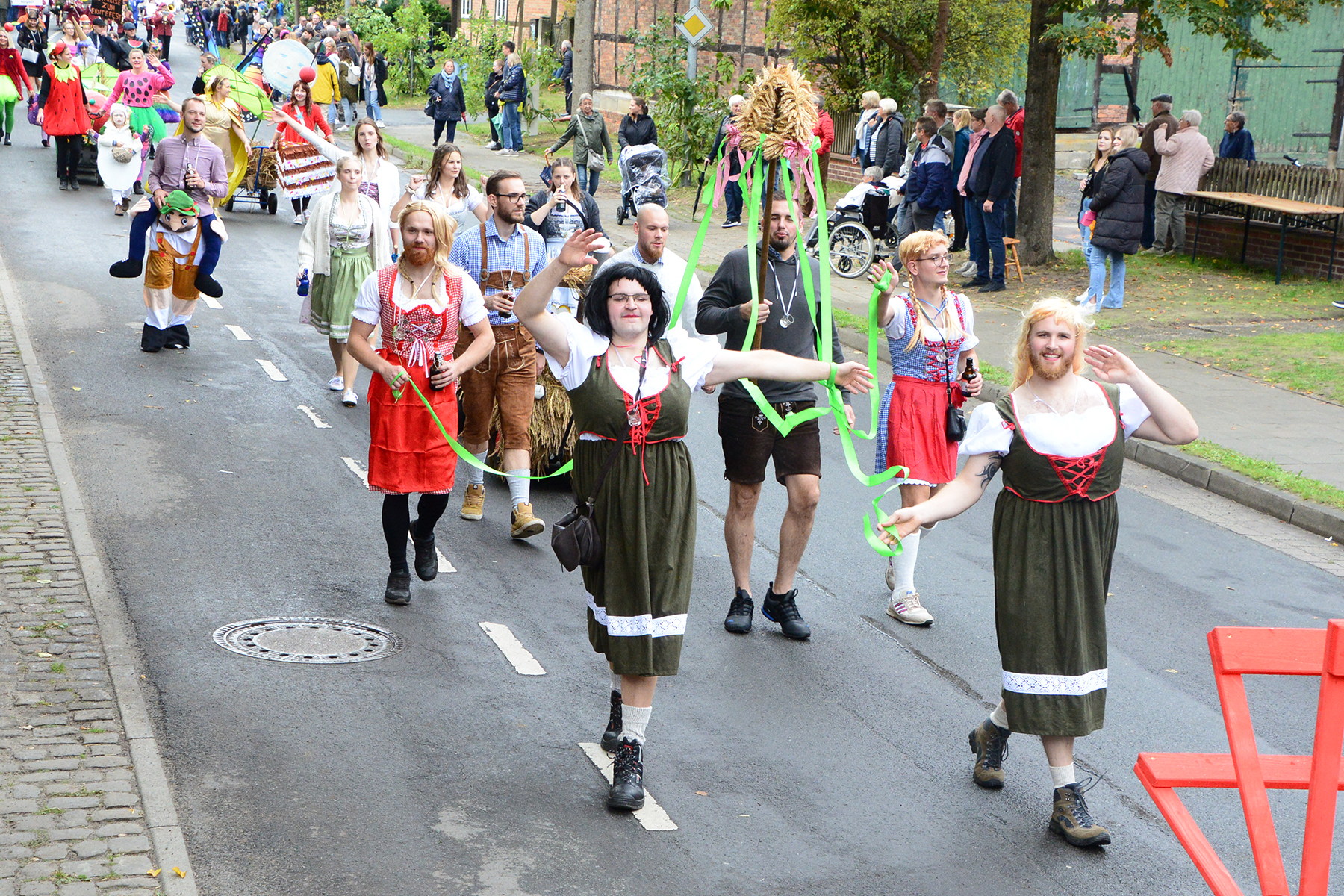 Doch ehe es zur Proklamation des 50. Erntekönigs ging, stand der erste Festumzug des Ramlinger Erntefestes auf dem Programm. Die Erntegruppen hatten sich wieder voll ins Zeug gelegt und in den vergangenen Wochen und Monaten an ihren Wagen und Outfits gefeilt.