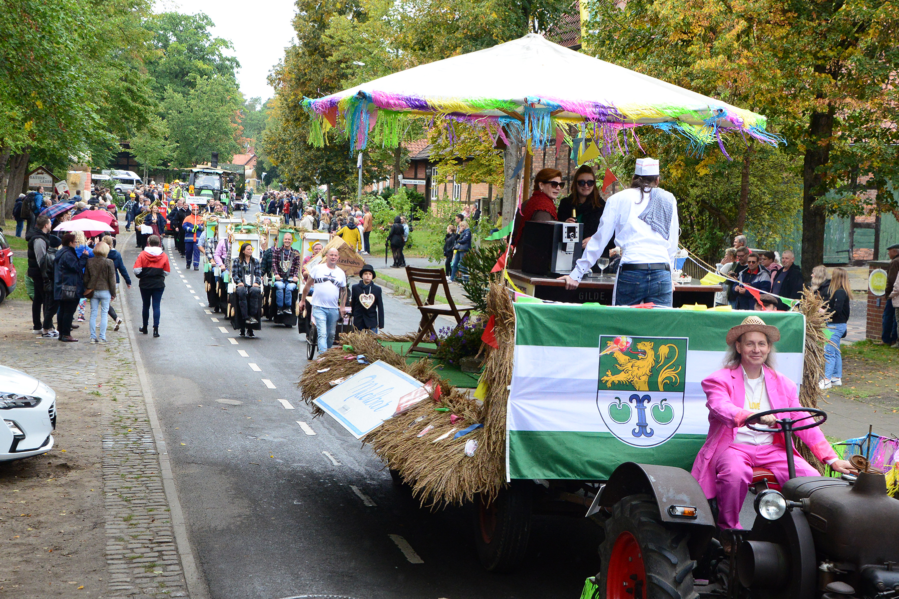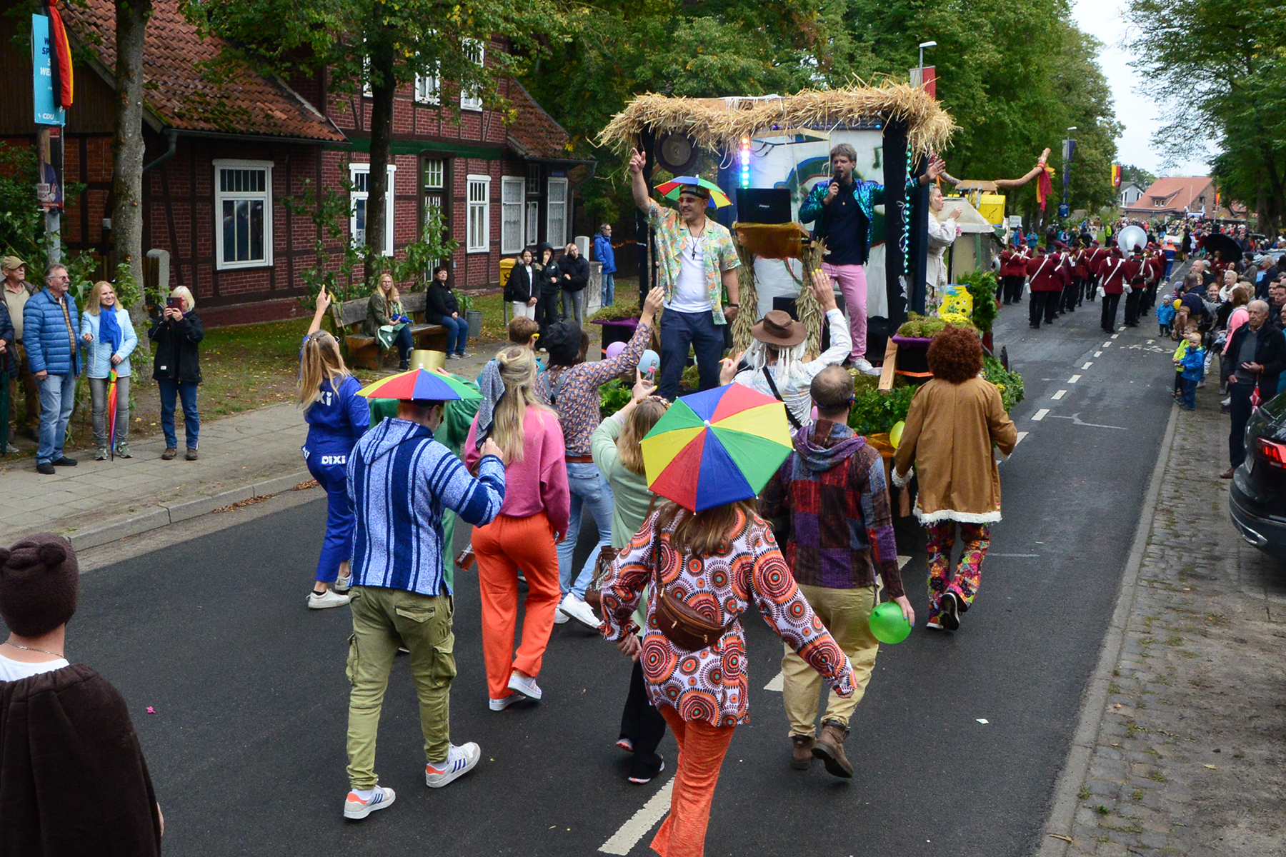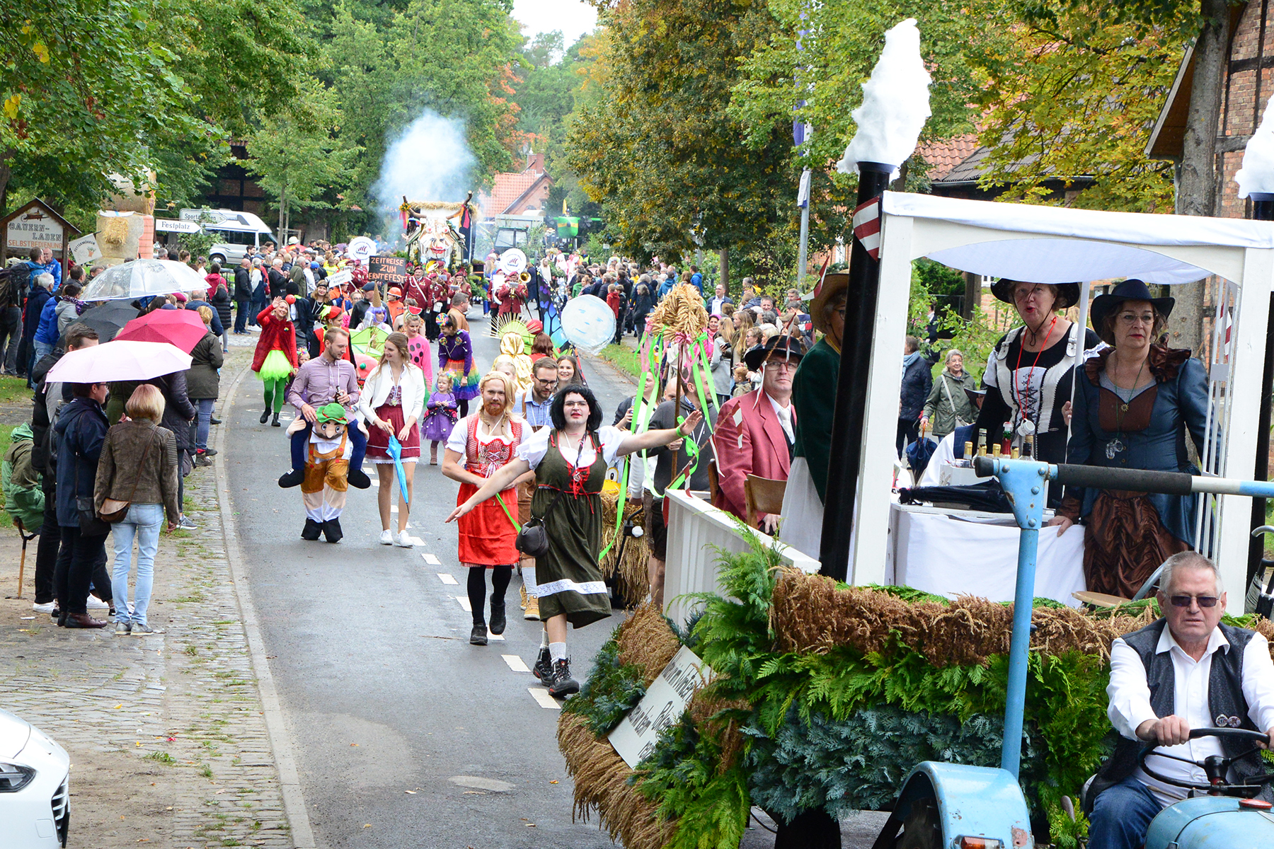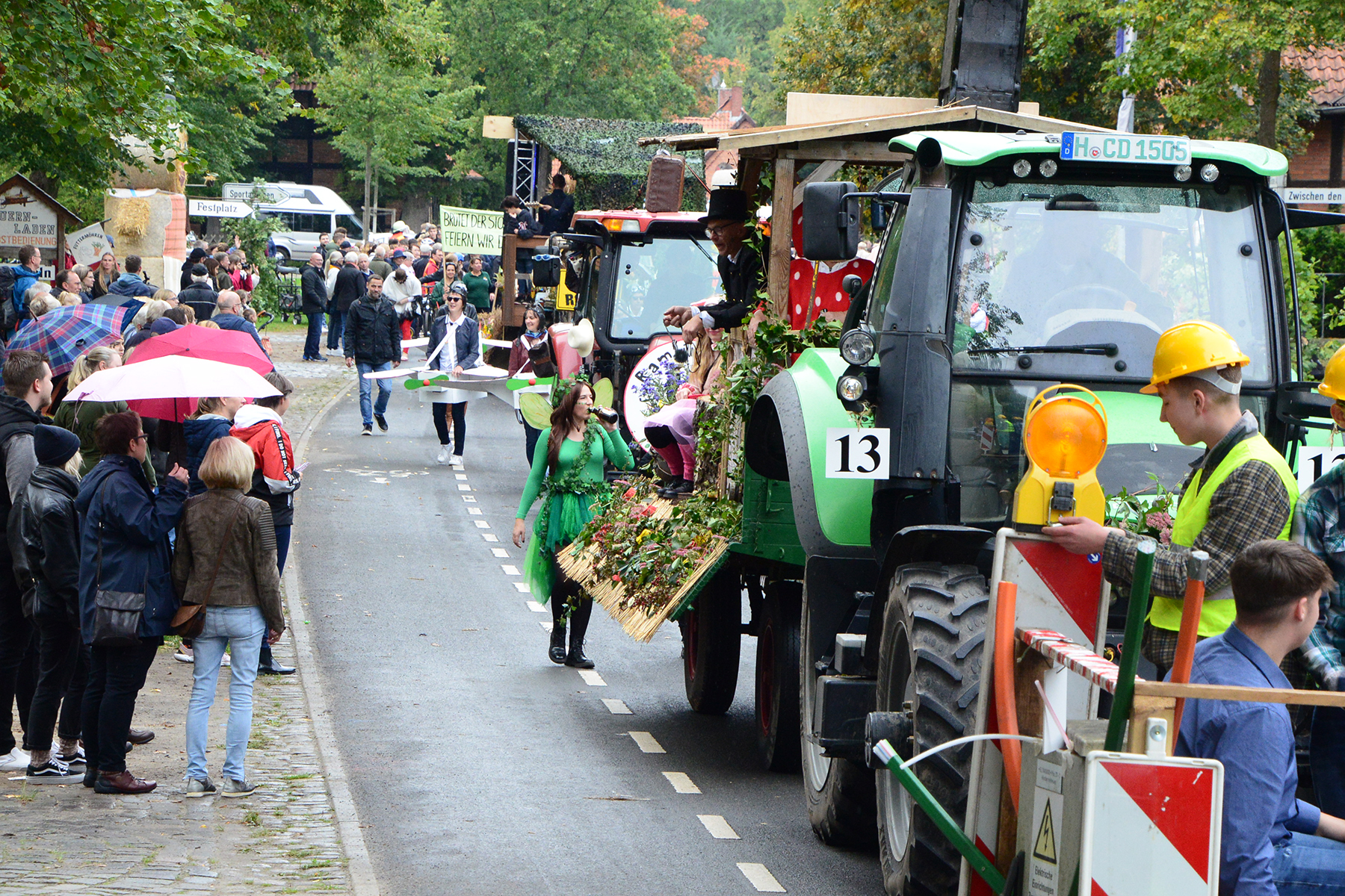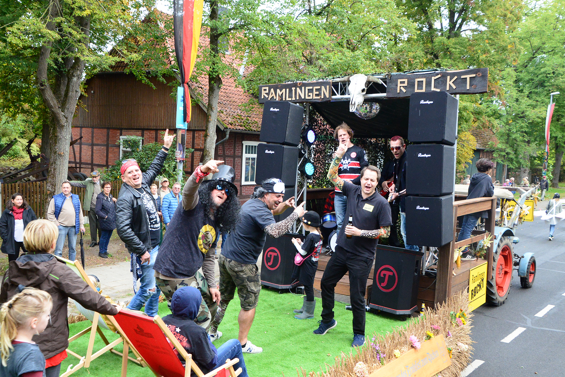Doch ehe es zur Proklamation des 50. Erntekönigs ging, stand der erste Festumzug des Ramlinger Erntefestes auf dem Programm. Die Erntegruppen hatten sich wieder voll ins Zeug gelegt und in den vergangenen Wochen und Monaten an ihren Wagen und Outfits gefeilt.