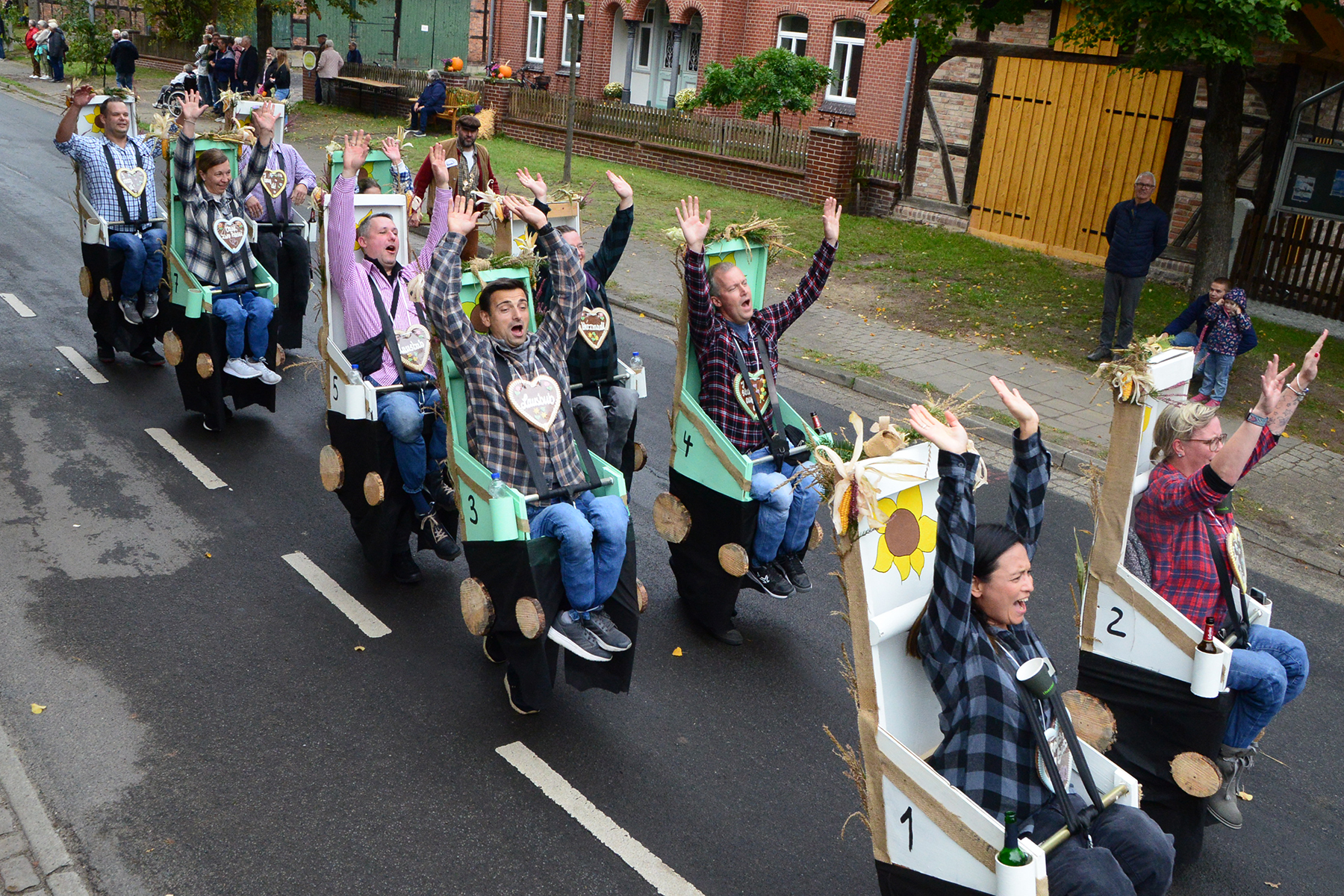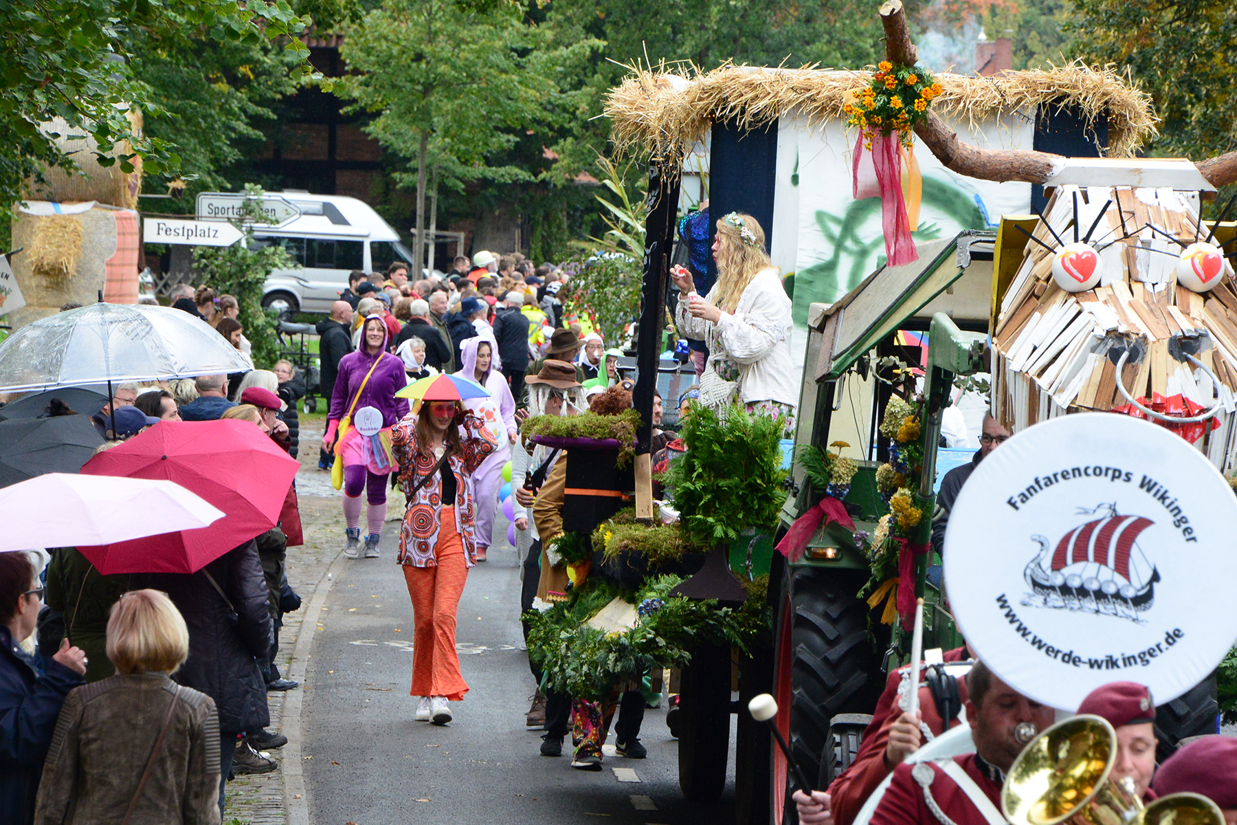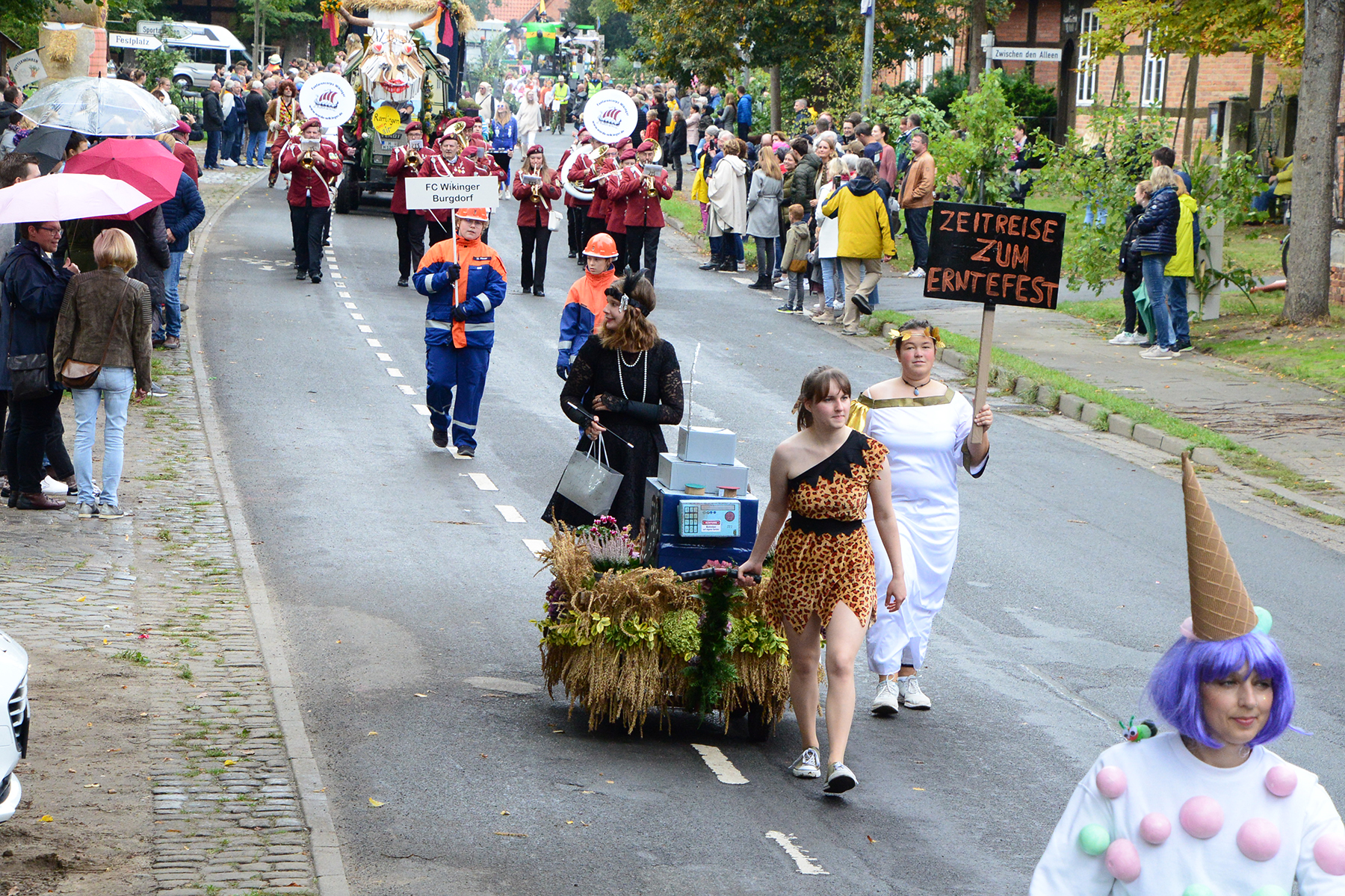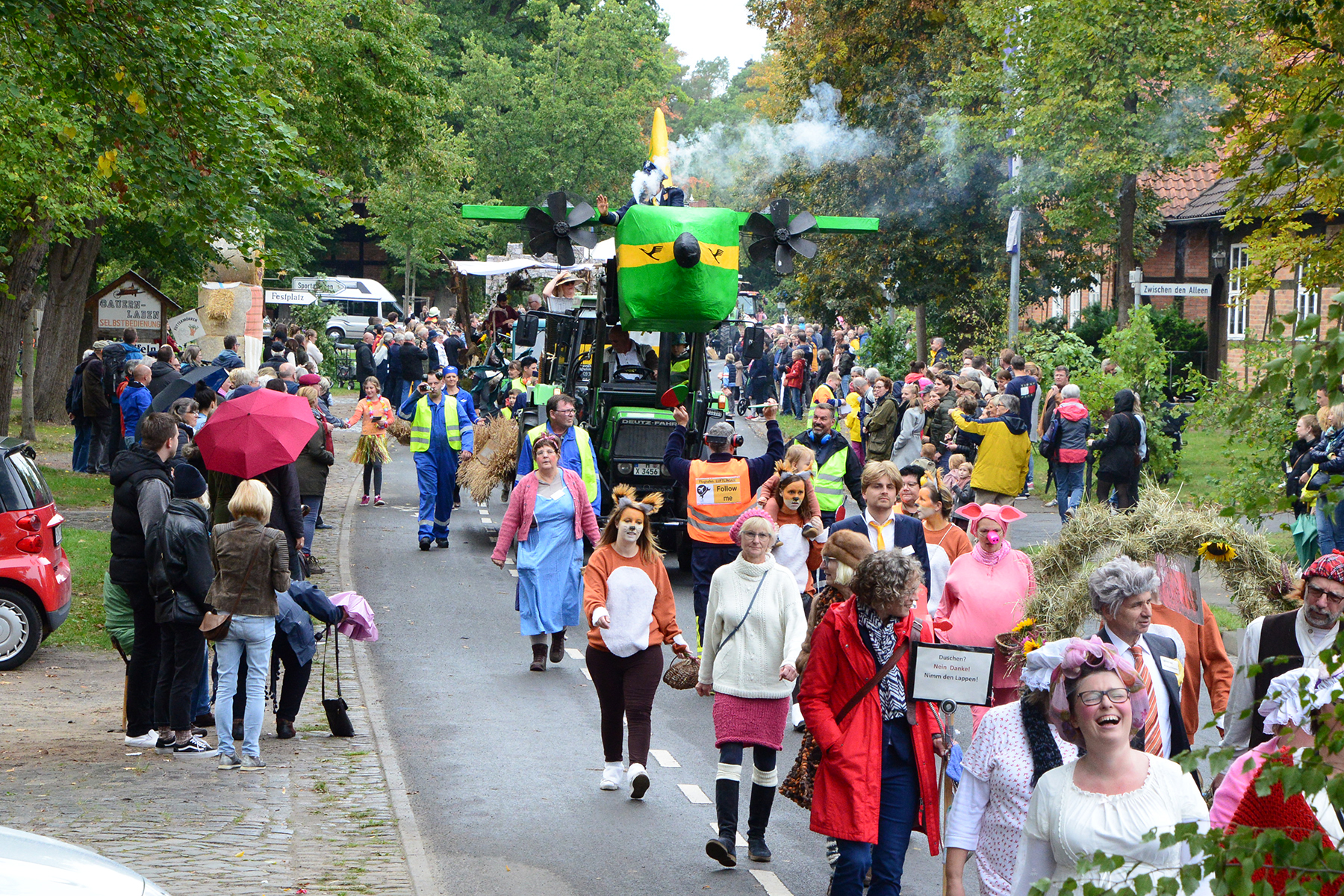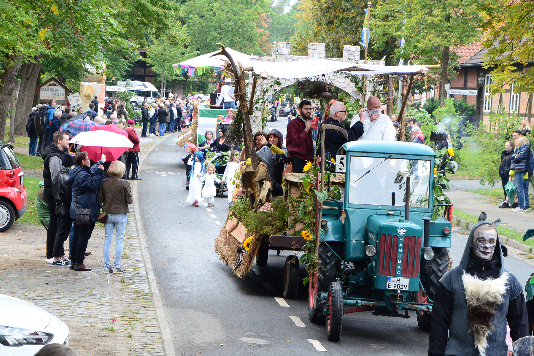 Doch ehe es zur Proklamation des 50. Erntekönigs ging, stand der erste Festumzug des Ramlinger Erntefestes auf dem Programm. Die Erntegruppen hatten sich wieder voll ins Zeug gelegt und in den vergangenen Wochen und Monaten an ihren Wagen und Outfits gefeilt.