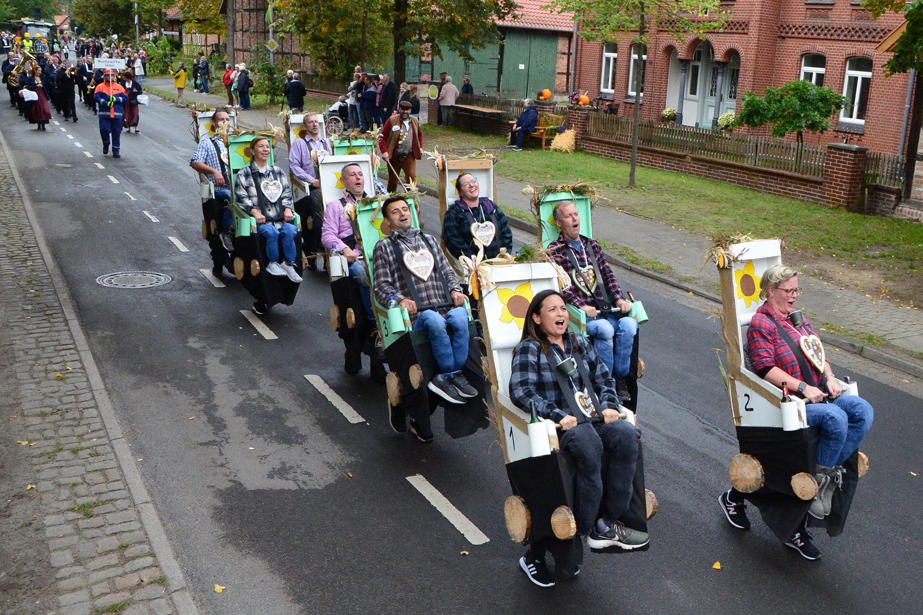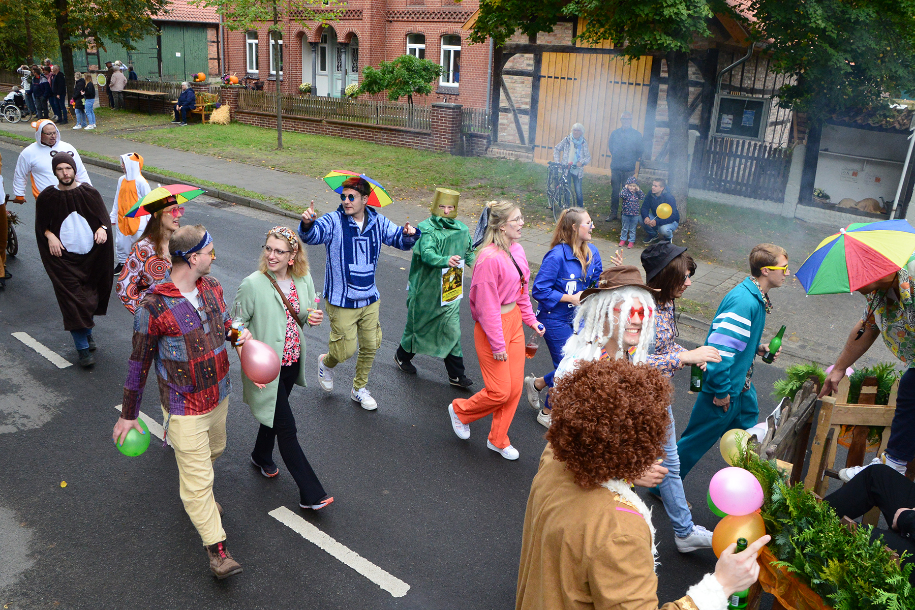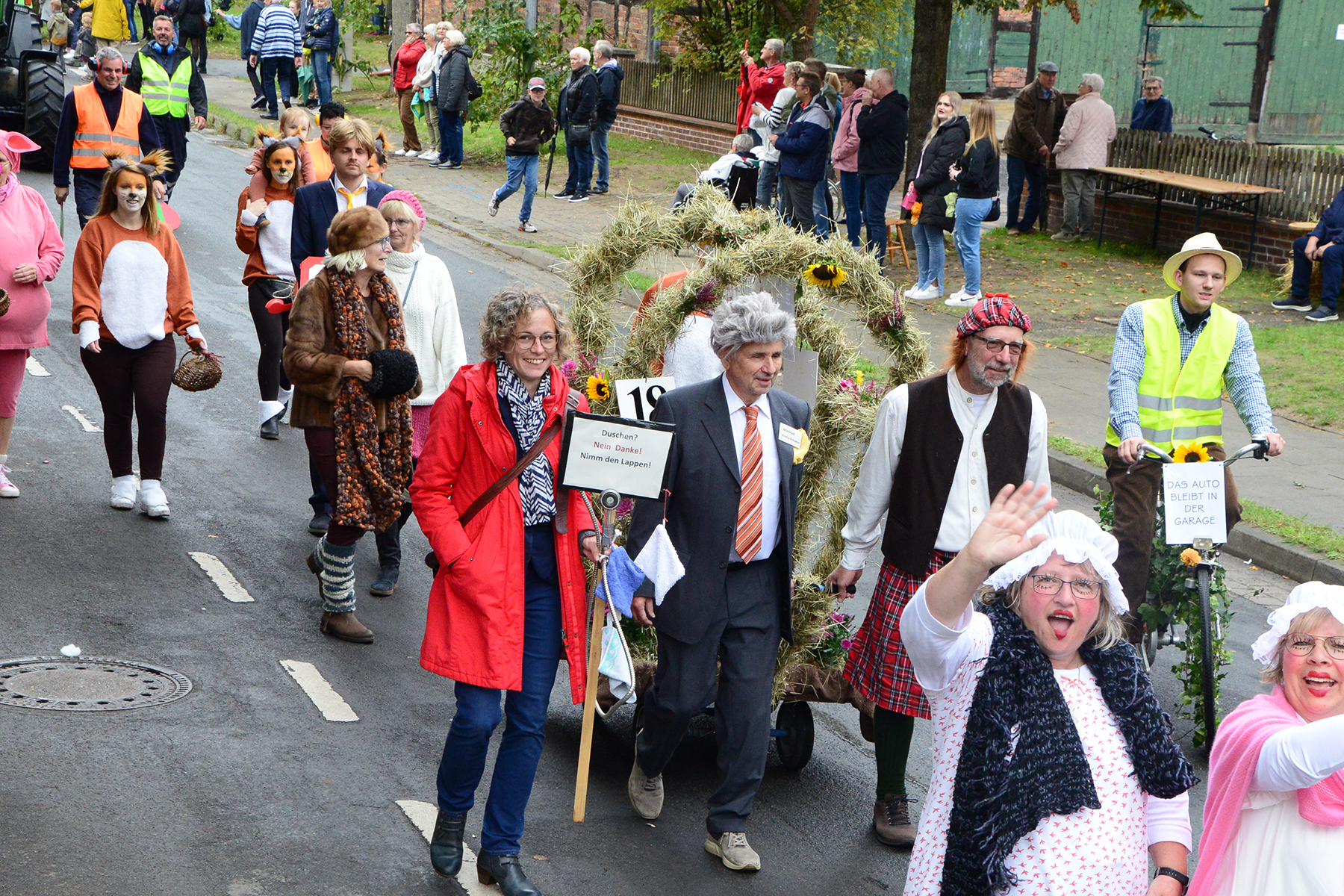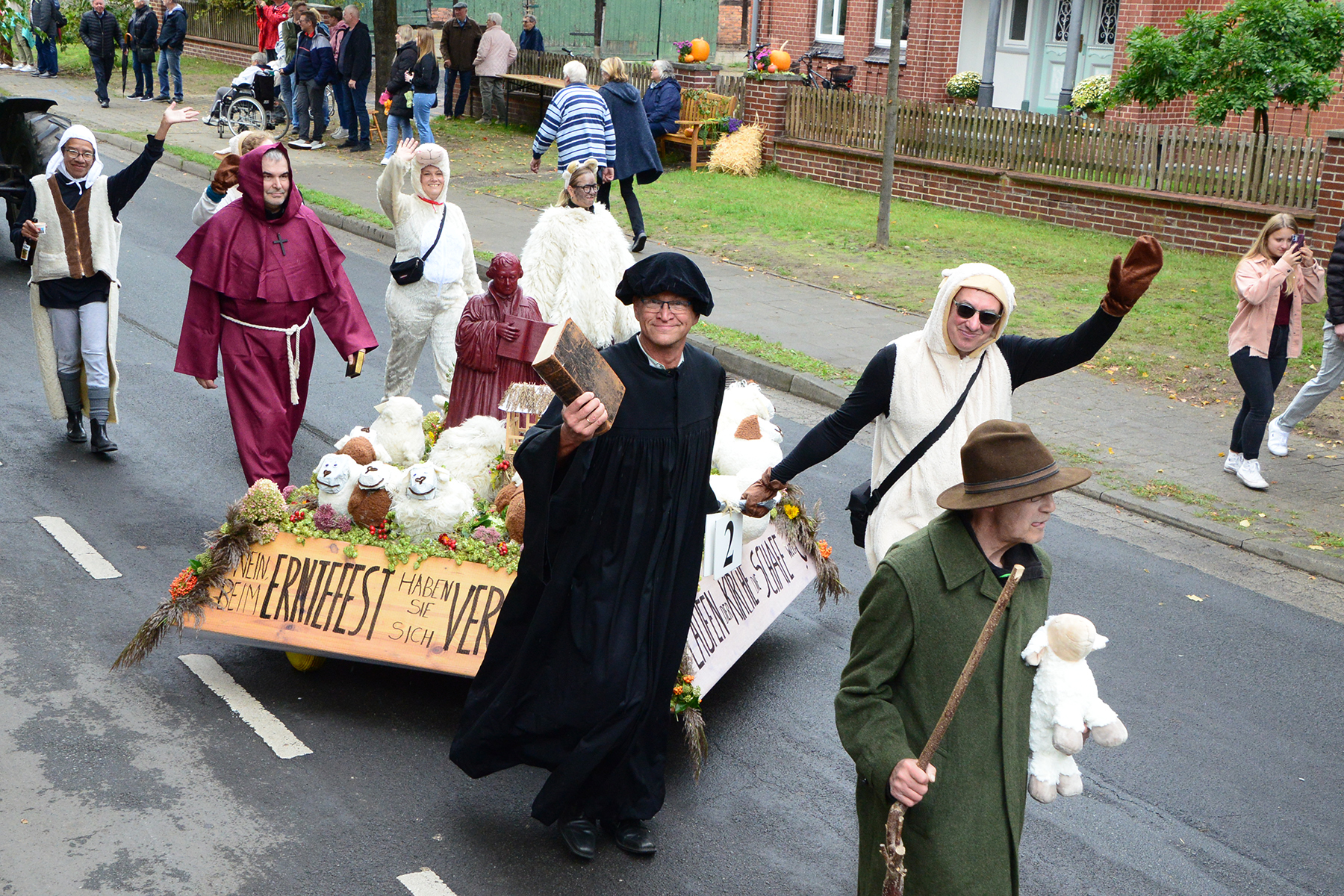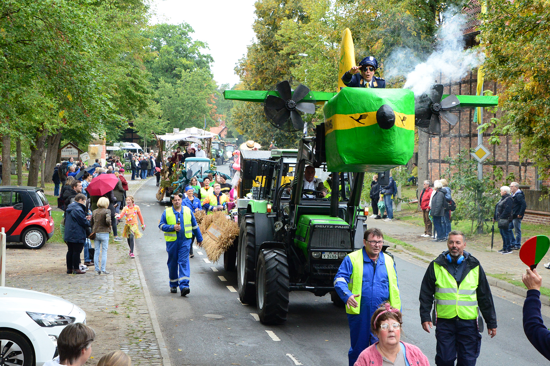Doch ehe es zur Proklamation des 50. Erntekönigs ging, stand der erste Festumzug des Ramlinger Erntefestes auf dem Programm. Die Erntegruppen hatten sich wieder voll ins Zeug gelegt und in den vergangenen Wochen und Monaten an ihren Wagen und Outfits gefeilt.