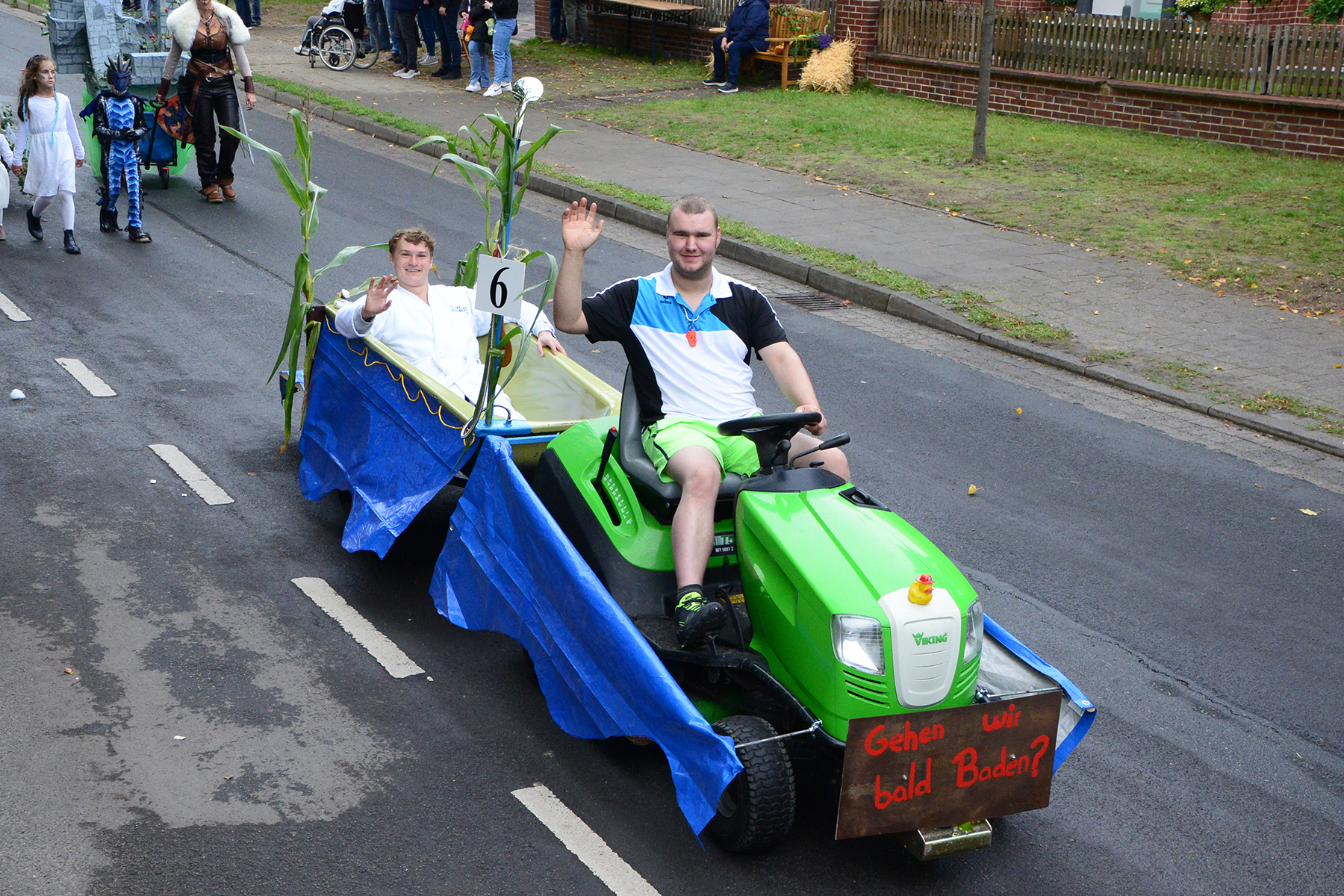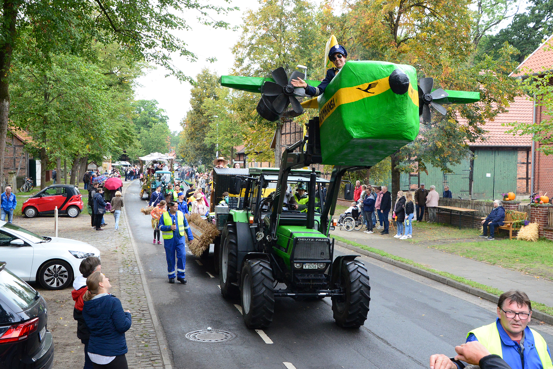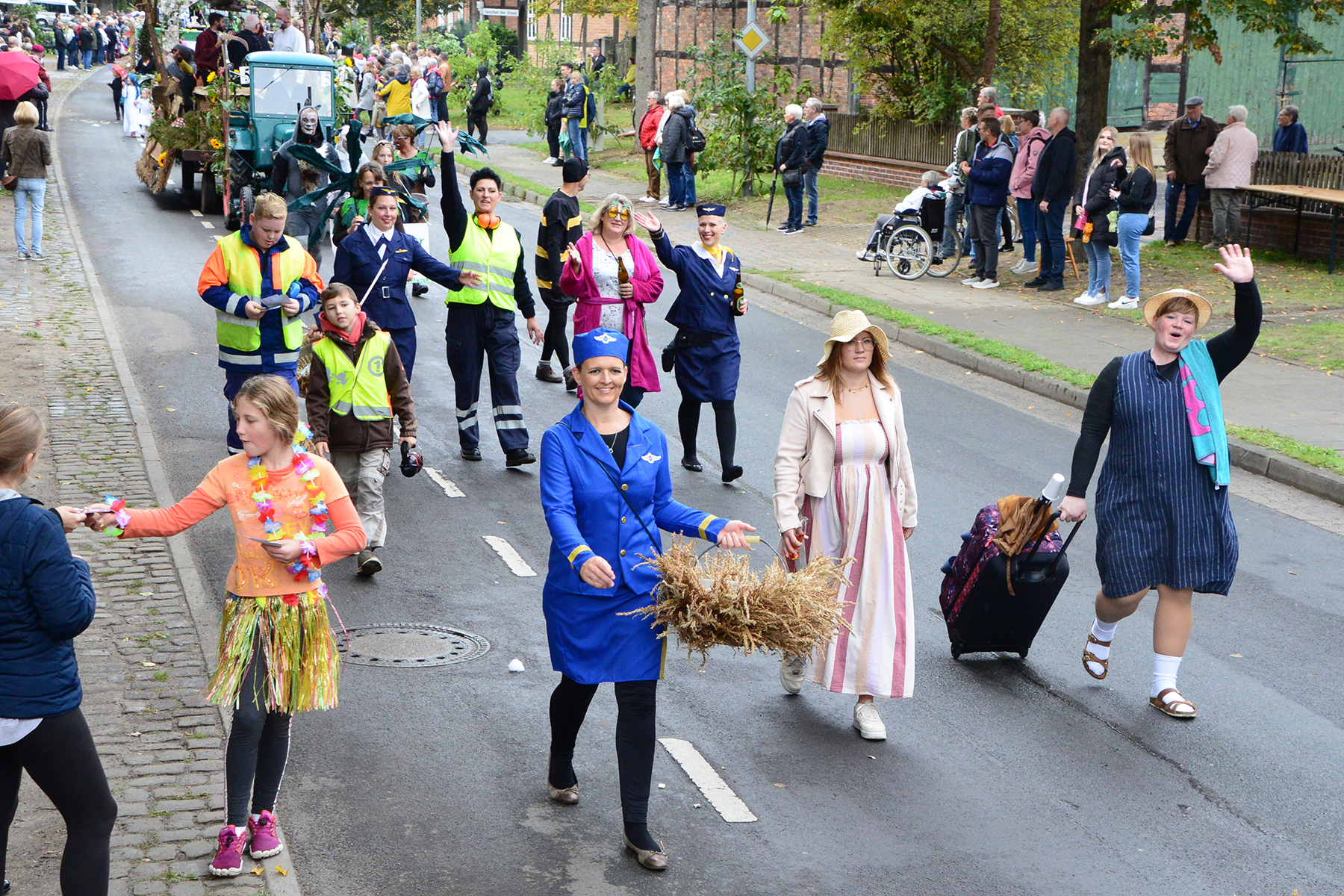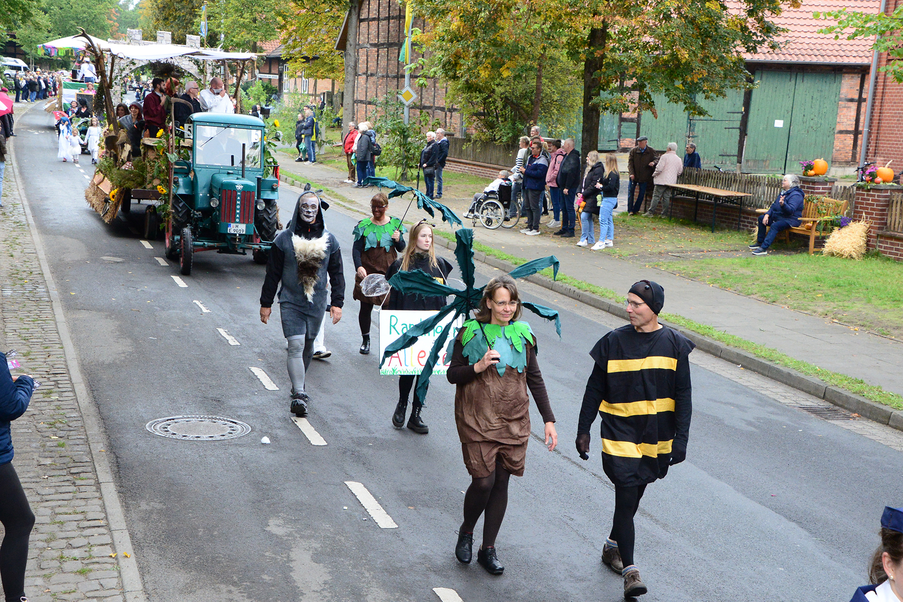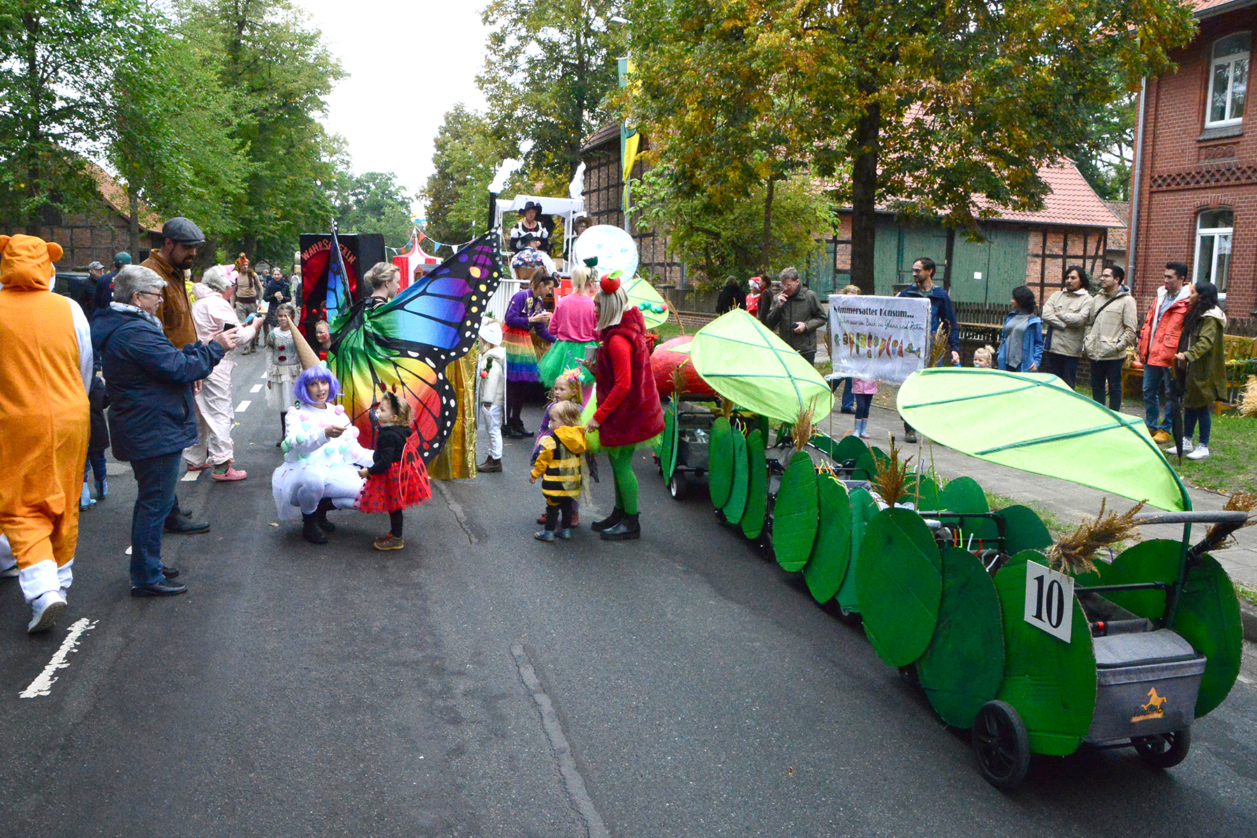 Doch ehe es zur Proklamation des 50. Erntekönigs ging, stand der erste Festumzug des Ramlinger Erntefestes auf dem Programm. Die Erntegruppen hatten sich wieder voll ins Zeug gelegt und in den vergangenen Wochen und Monaten an ihren Wagen und Outfits gefeilt.
