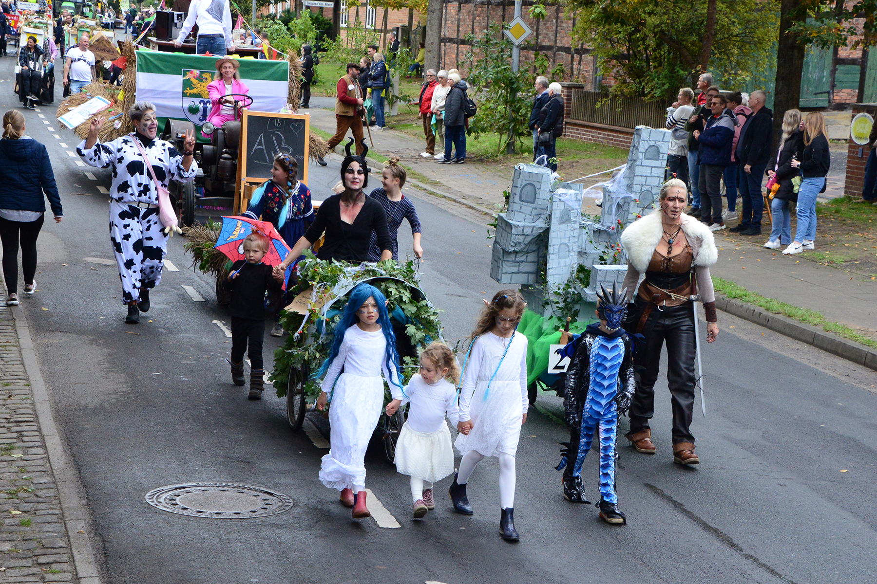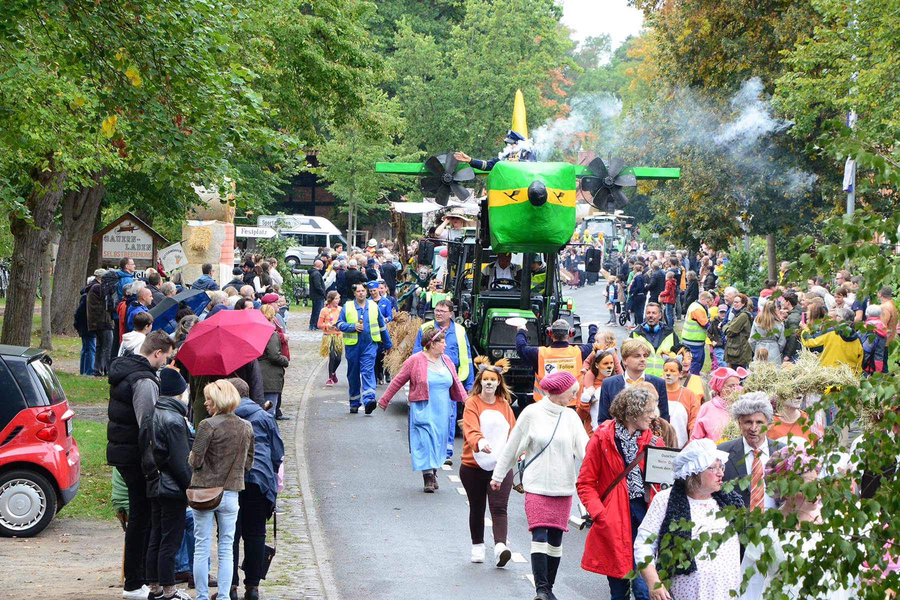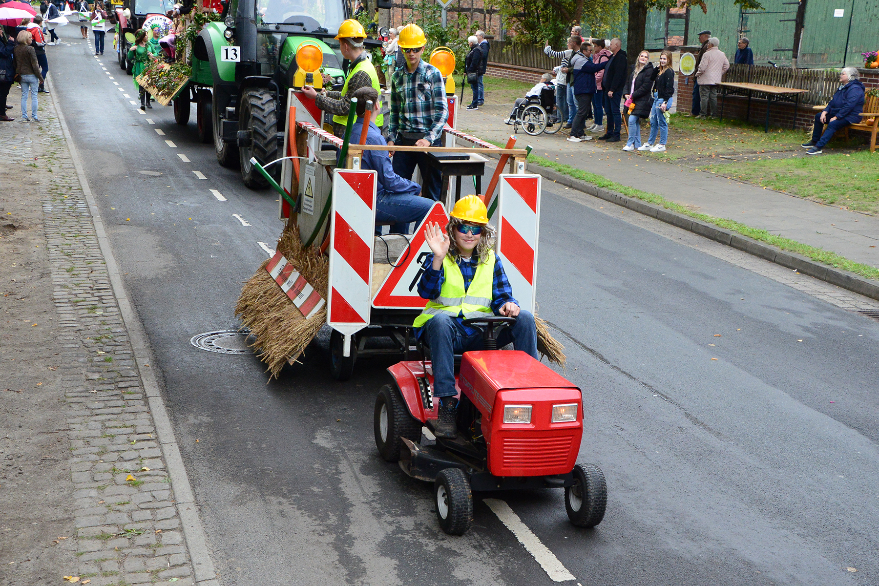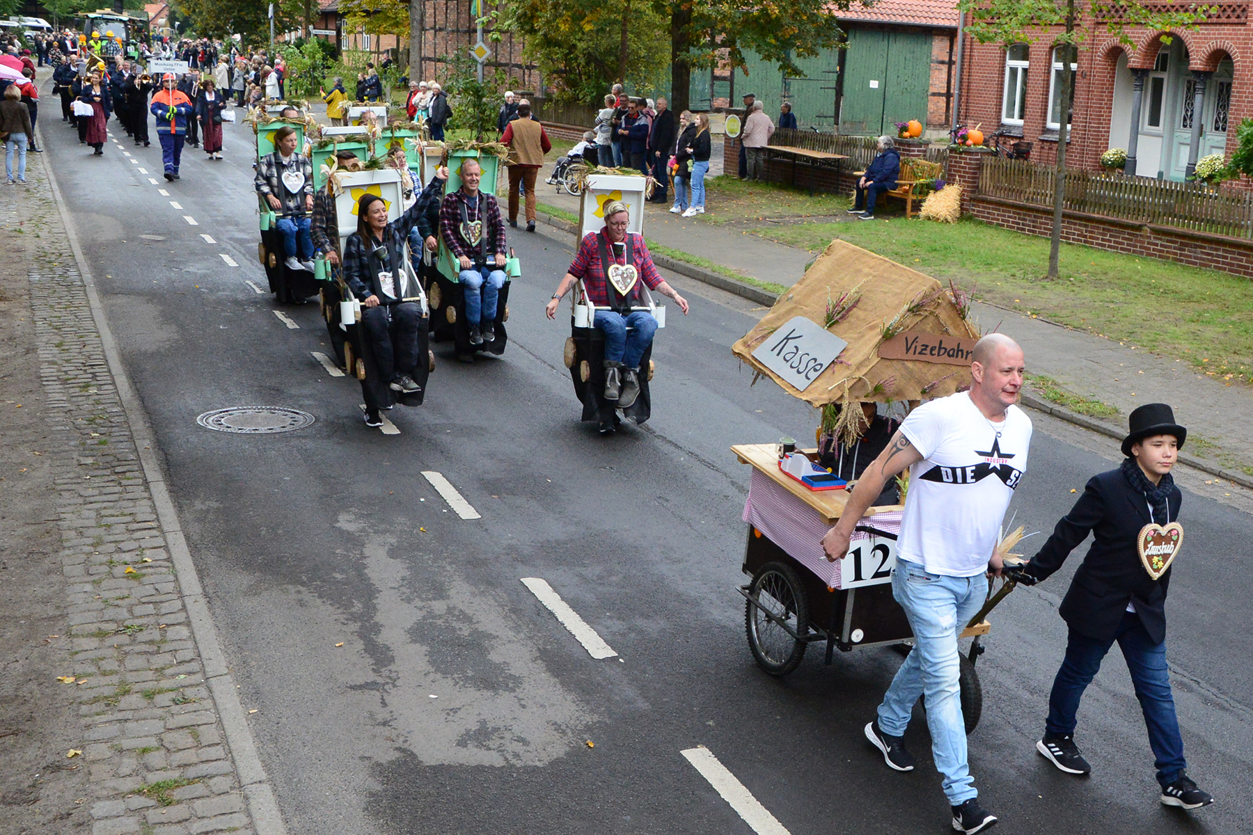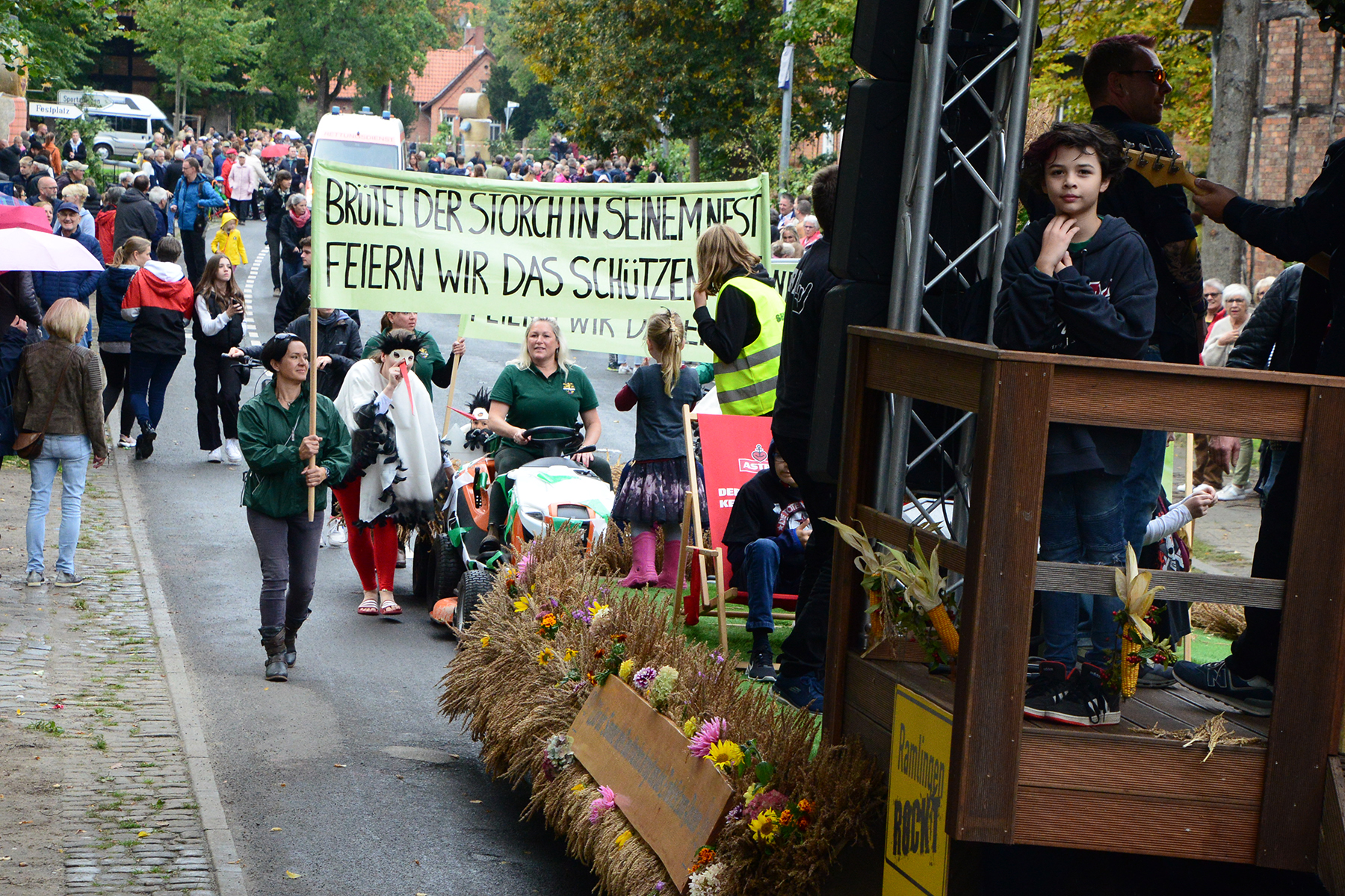 Doch ehe es zur Proklamation des 50. Erntekönigs ging, stand der erste Festumzug des Ramlinger Erntefestes auf dem Programm. Die Erntegruppen hatten sich wieder voll ins Zeug gelegt und in den vergangenen Wochen und Monaten an ihren Wagen und Outfits gefeilt.