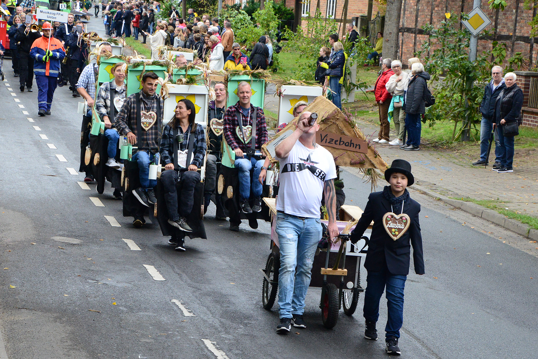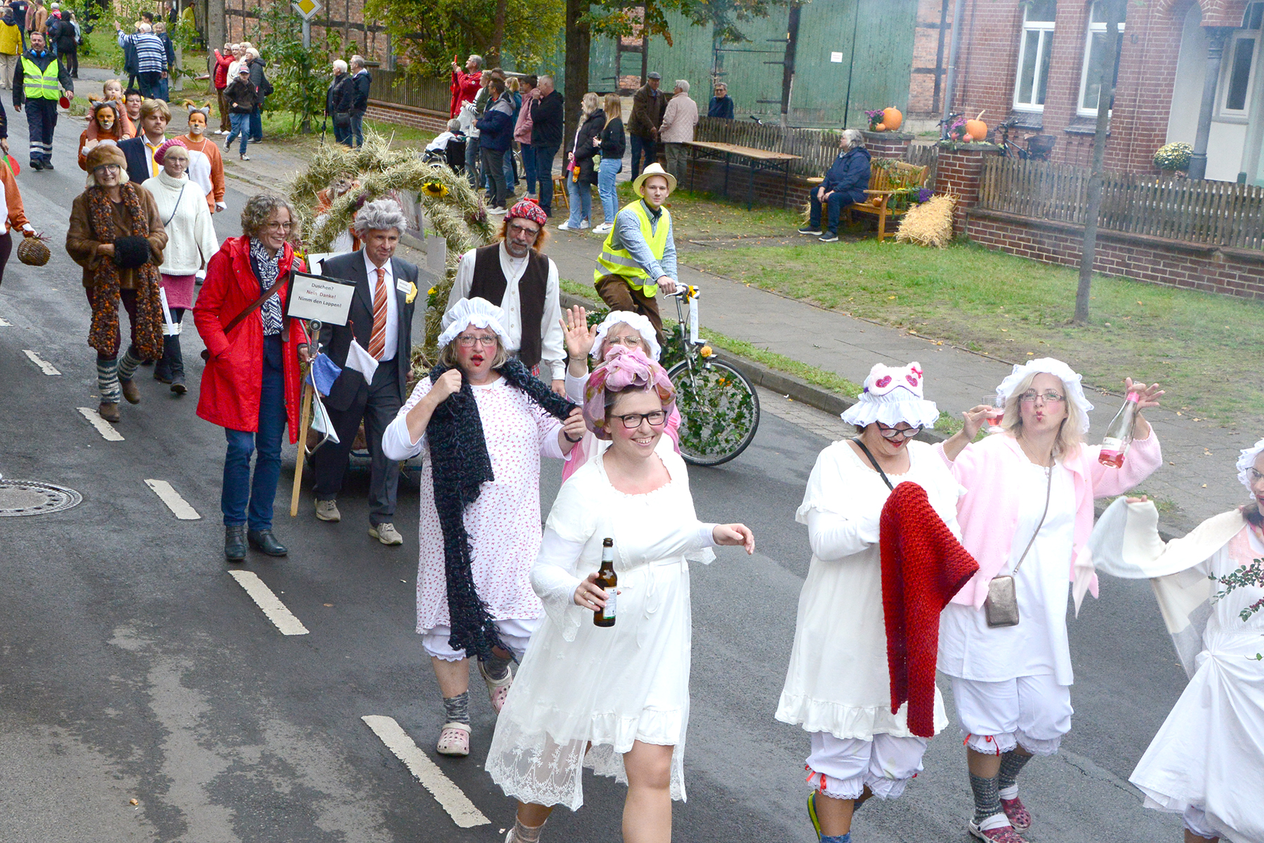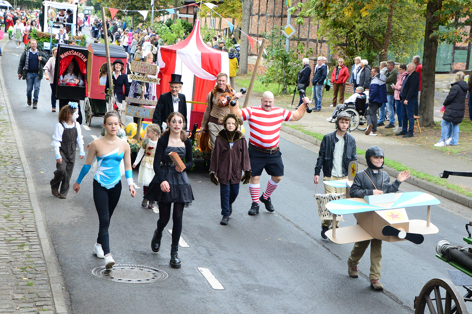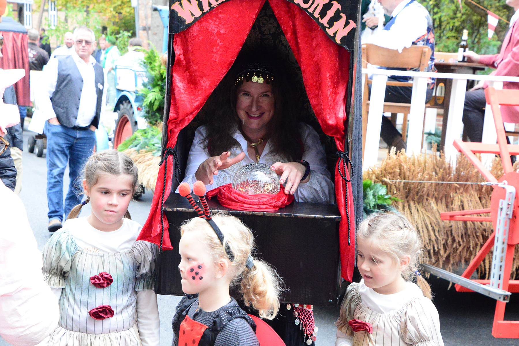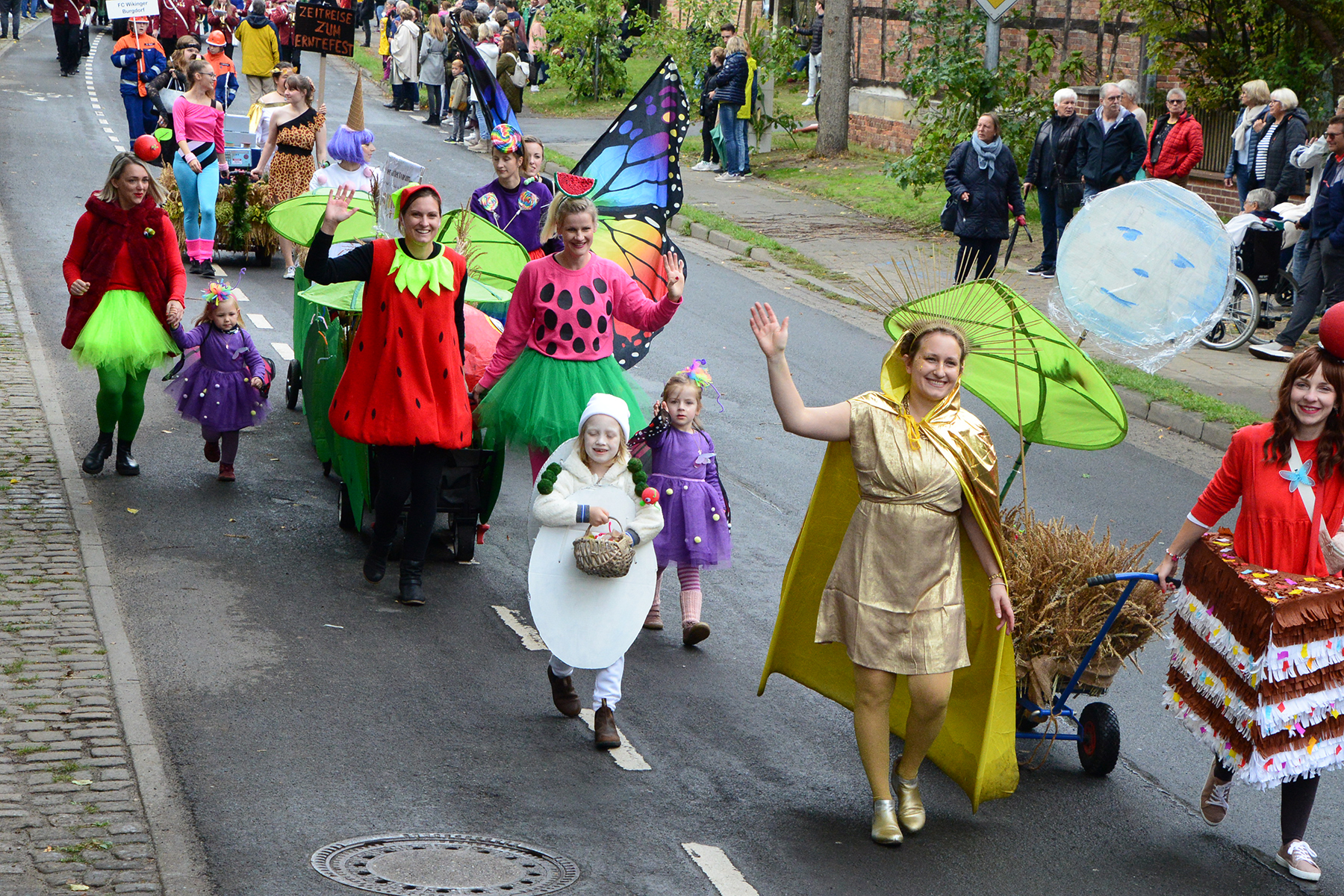Doch ehe es zur Proklamation des 50. Erntekönigs ging, stand der erste Festumzug des Ramlinger Erntefestes auf dem Programm. Die Erntegruppen hatten sich wieder voll ins Zeug gelegt und in den vergangenen Wochen und Monaten an ihren Wagen und Outfits gefeilt.