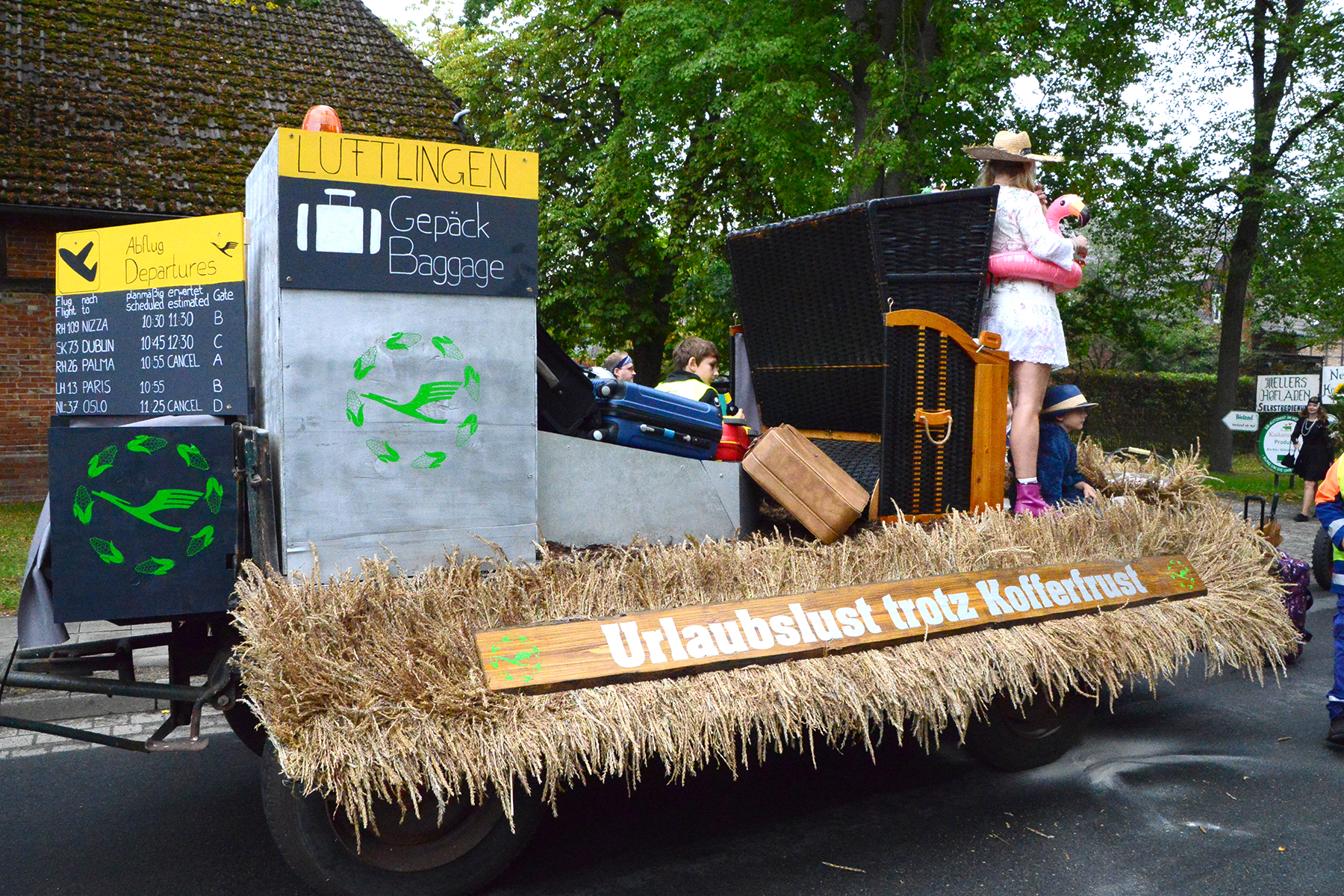 Aber auch das Chaos an den Flughäfen hielt Einzug in den Festzug. "Urlaubslust trotz Kofferfrust" heiß es am Flughafen "Luftlingen" der "Ramhansa". Es war nicht die einzige Fluggesellschaft: Ebenso landete "RamlingAir" mit Koffern und Servicewagen im Festumzug.