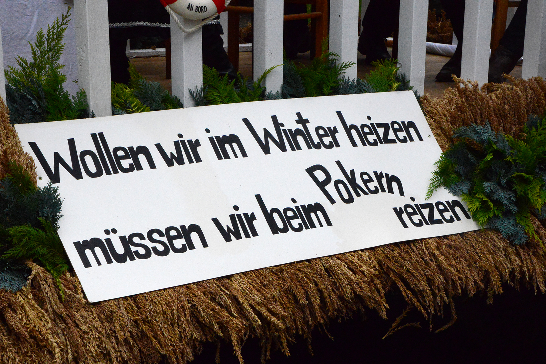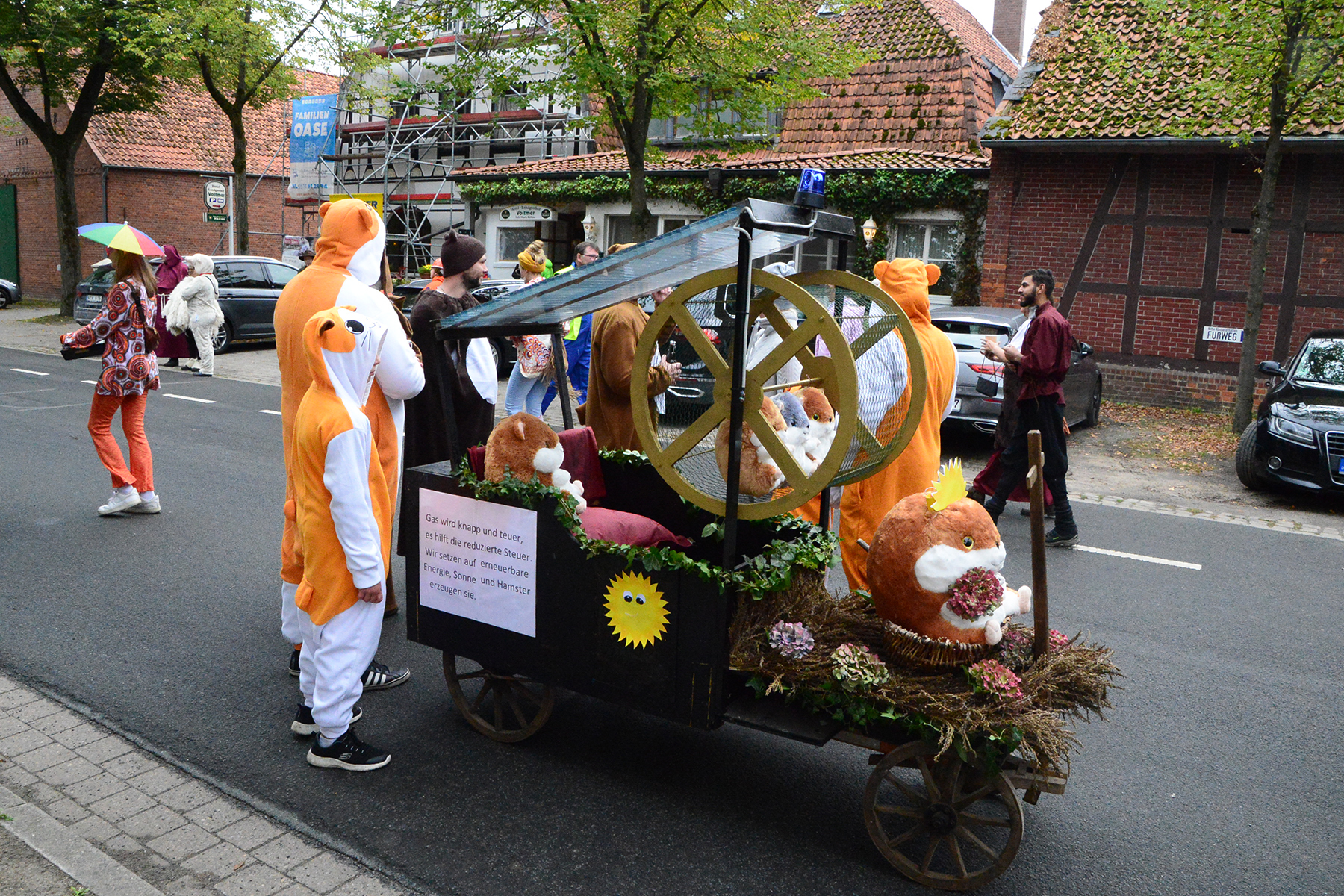 Die Energiekrise stand klar im Vordergrund der Mottowagen. So wurden innovative Ideen wie Hamsterräder als Stromerzeuger oder aber in Energie verwandelte Hasenköttel vorgestellt. "Kleinvieh macht auch Mist" hieß es am Wagen der "HASPROM". Die Raupe Nimmersatt zeigte: "Nimmersatter Konsum…führt nur im Buch zu Glanz und Ruhm". Wer`s gewagter mag: Man kann sich die Kosten für die Energie auch erspielen: "Wollen wir im Winter heizen, müssen wir beim Pokern reizen" stand an einem Wagen. Die Ramlinger Sparfüchse gaben den Tipp: "Duschen? Nein danke. Nimm den Lappen"