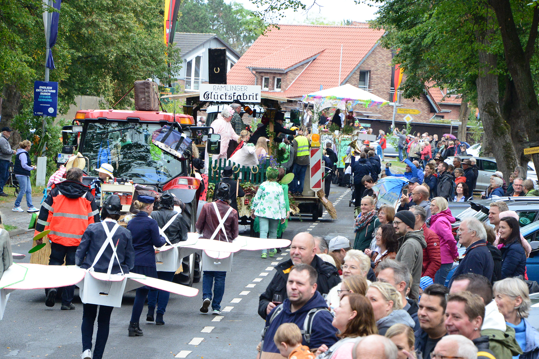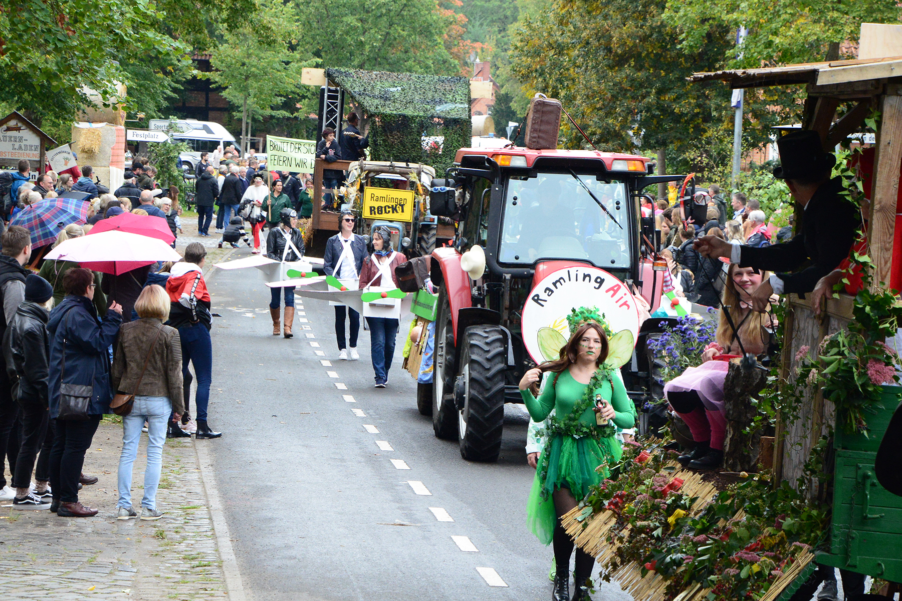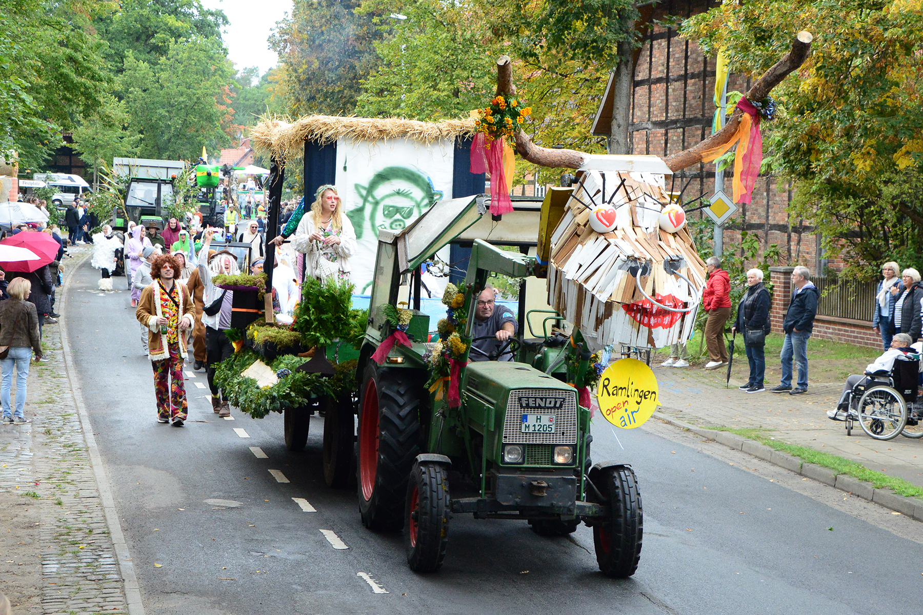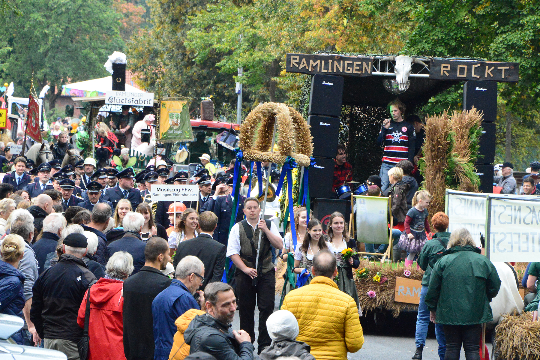 Lars Hogrefe von der Ramlinger Dorfgemeinschaft war vor dem Umzug überrascht von dem Aufmarsch der Gruppen: "Mit so vielen hatte ich dann doch nicht gerechnet", sagte er beim Aufstellen auf der Grünen Allee. Anschließend ging es, angeführt von der Erntekrone, getragen durch Dominik Schlumbohm, und den Erntemädchen, unter der Begleitung der Feuerwehrmusikzüge aus Ramlingen-Ehlershausen und Uetze sowie dem Fanfarencorps "Wikinger" Burgdorf durch den Ort.