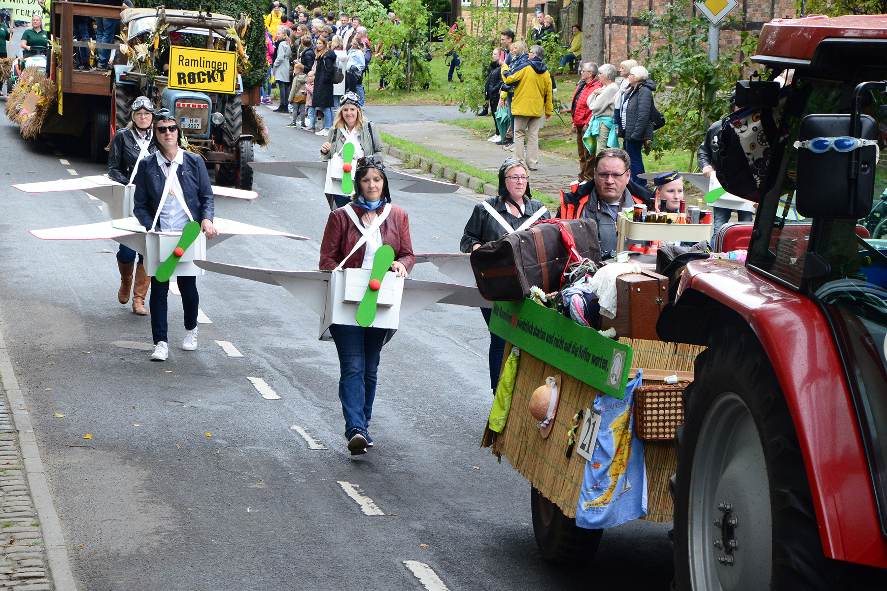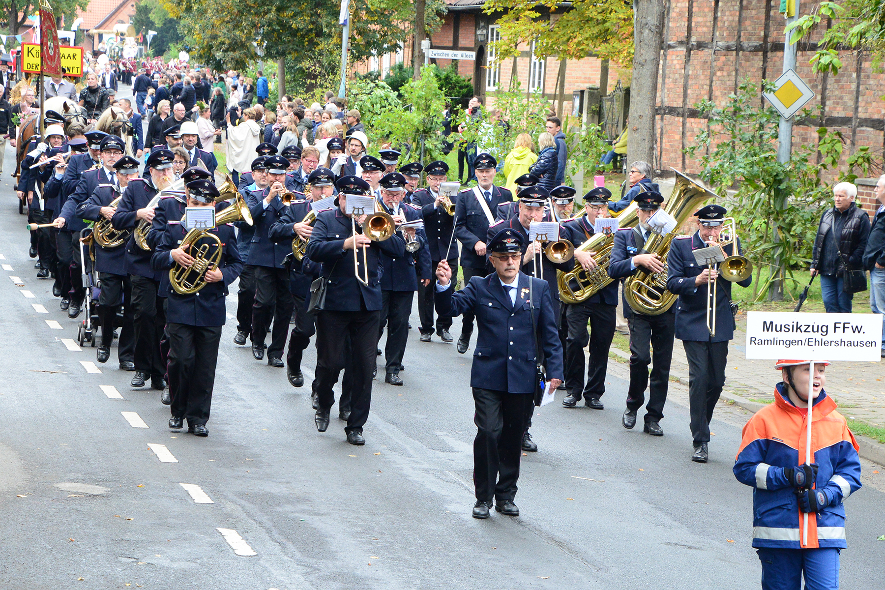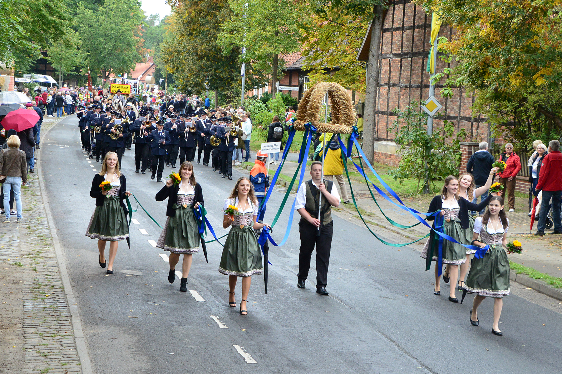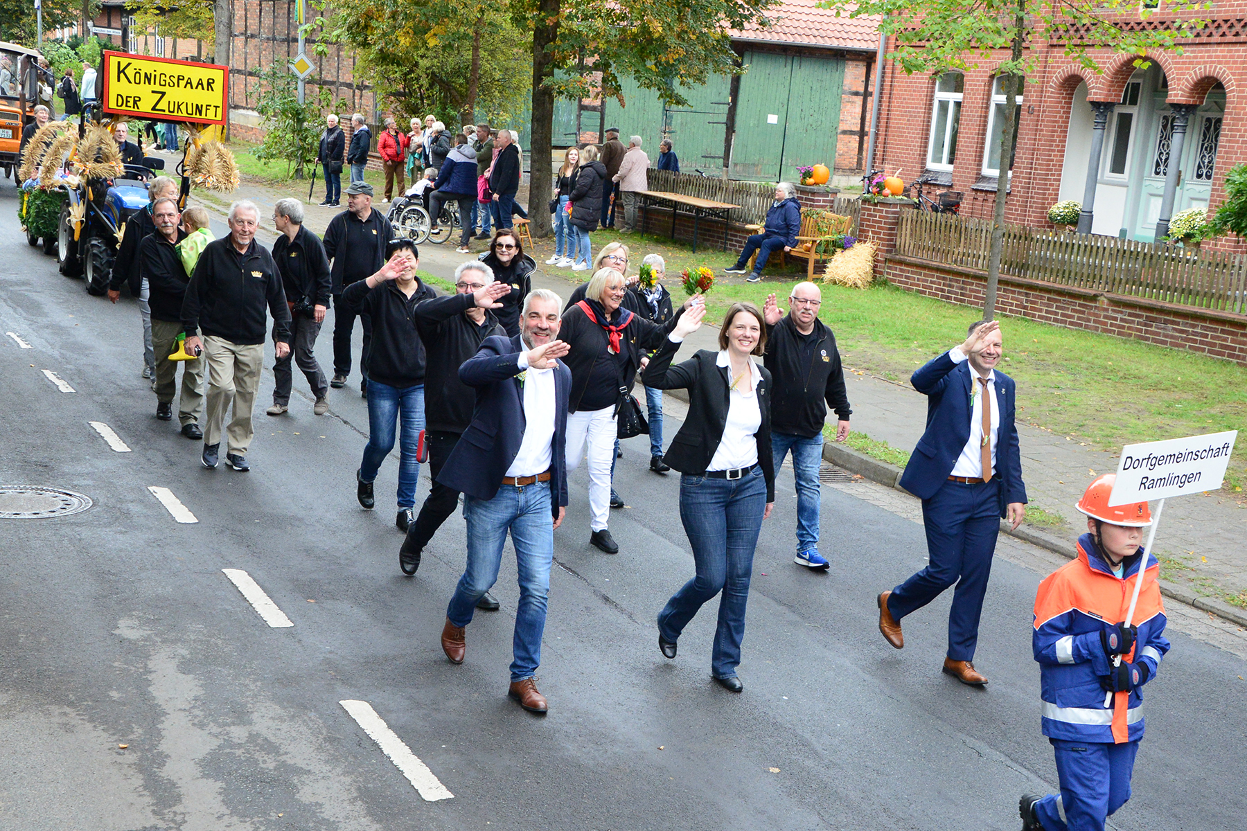 Lars Hogrefe von der Ramlinger Dorfgemeinschaft war vor dem Umzug überrascht von dem Aufmarsch der Gruppen: "Mit so vielen hatte ich dann doch nicht gerechnet", sagte er beim Aufstellen auf der Grünen Allee. Anschließend ging es, angeführt von der Erntekrone, getragen durch Dominik Schlumbohm, und den Erntemädchen, unter der Begleitung der Feuerwehrmusikzüge aus Ramlingen-Ehlershausen und Uetze sowie dem Fanfarencorps "Wikinger" Burgdorf durch den Ort.