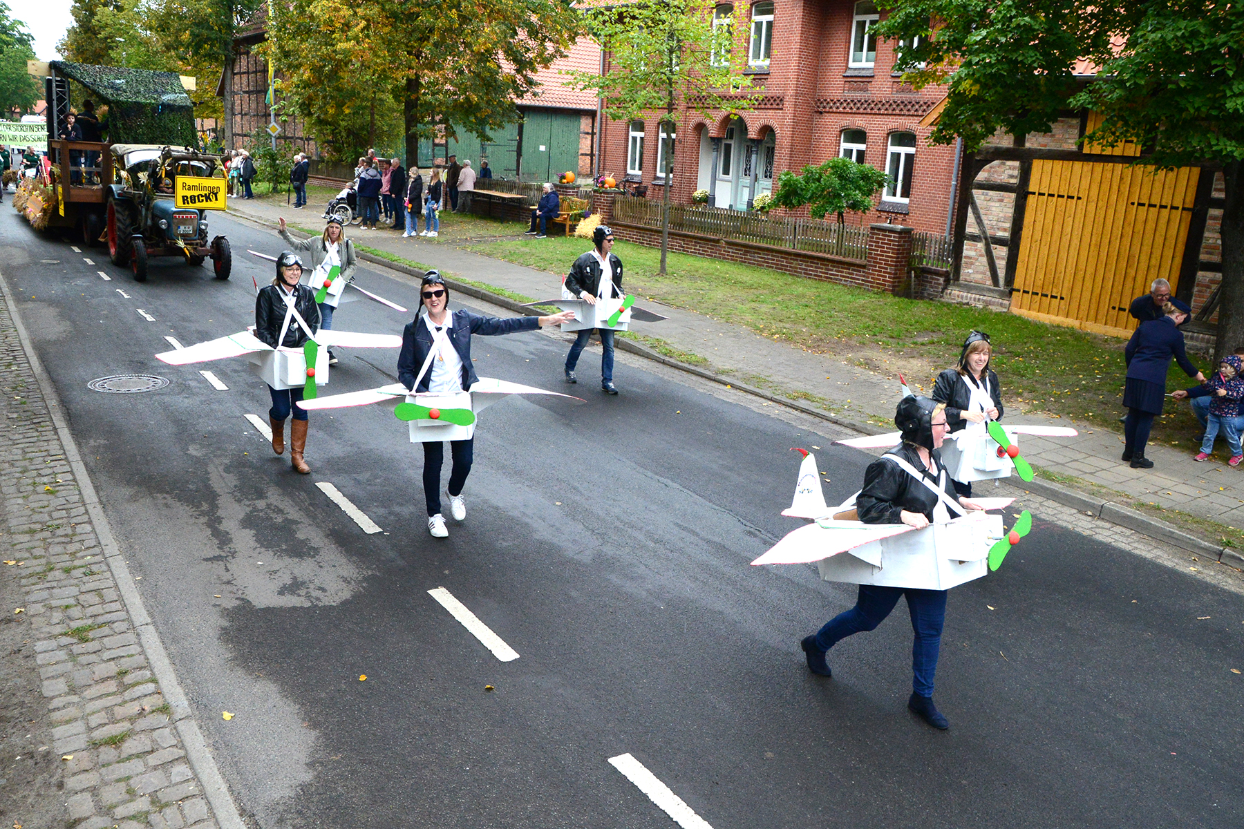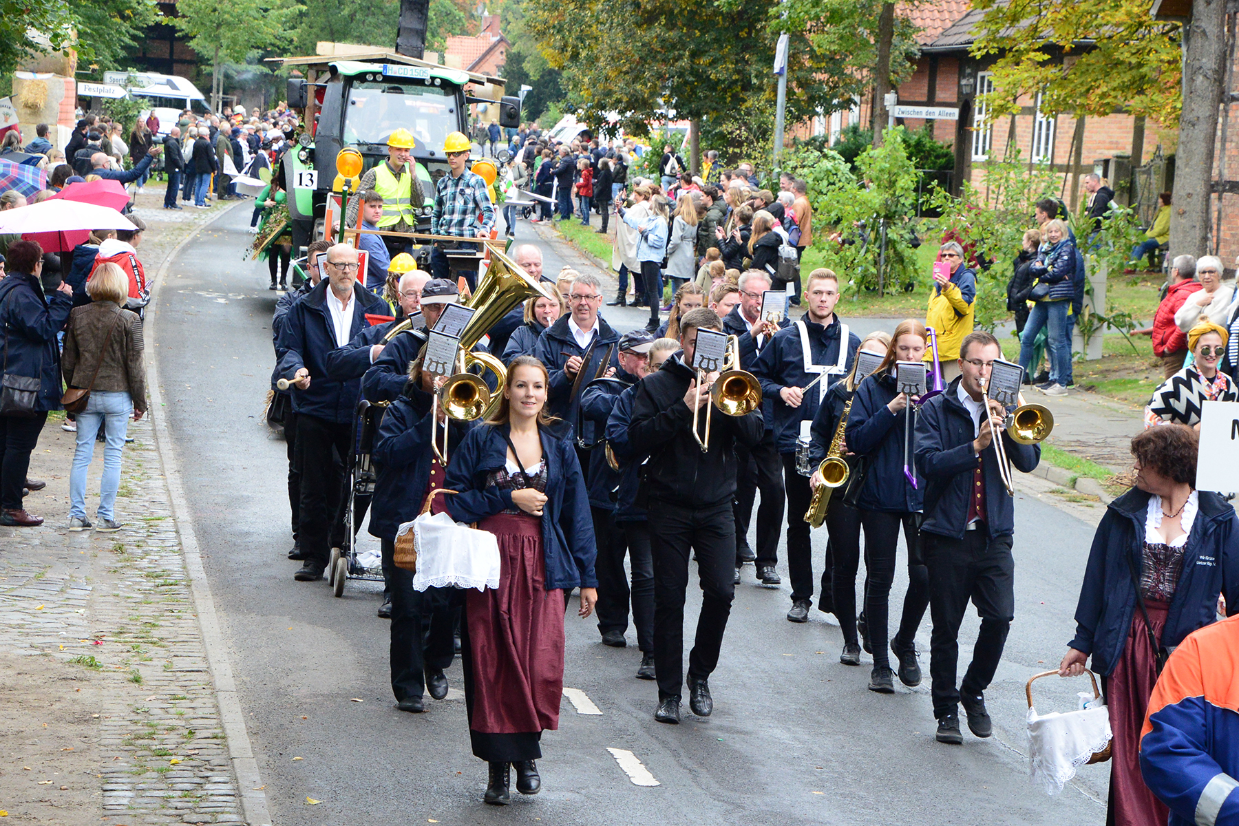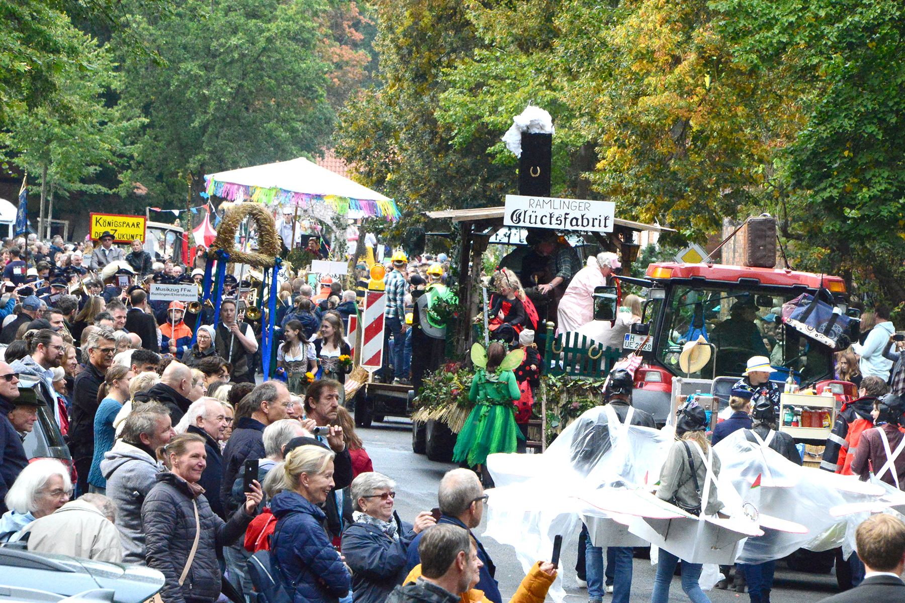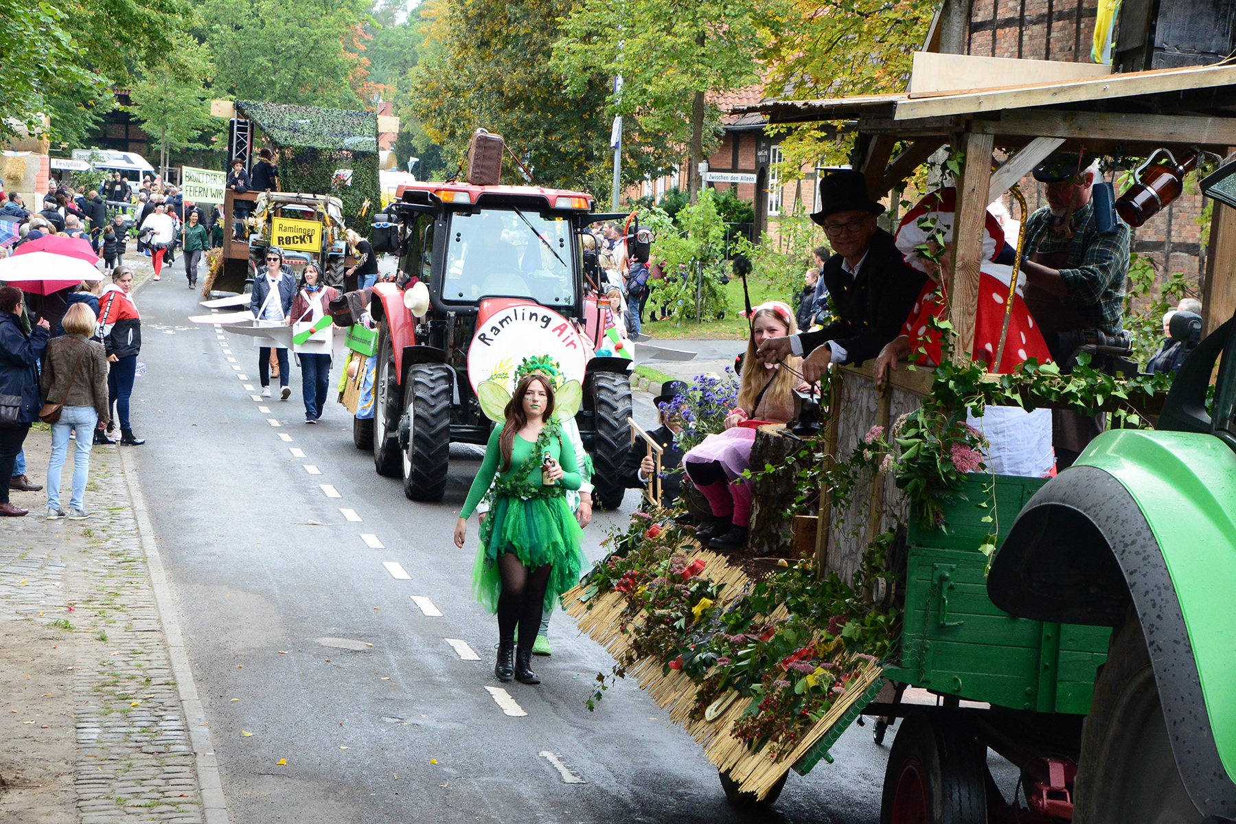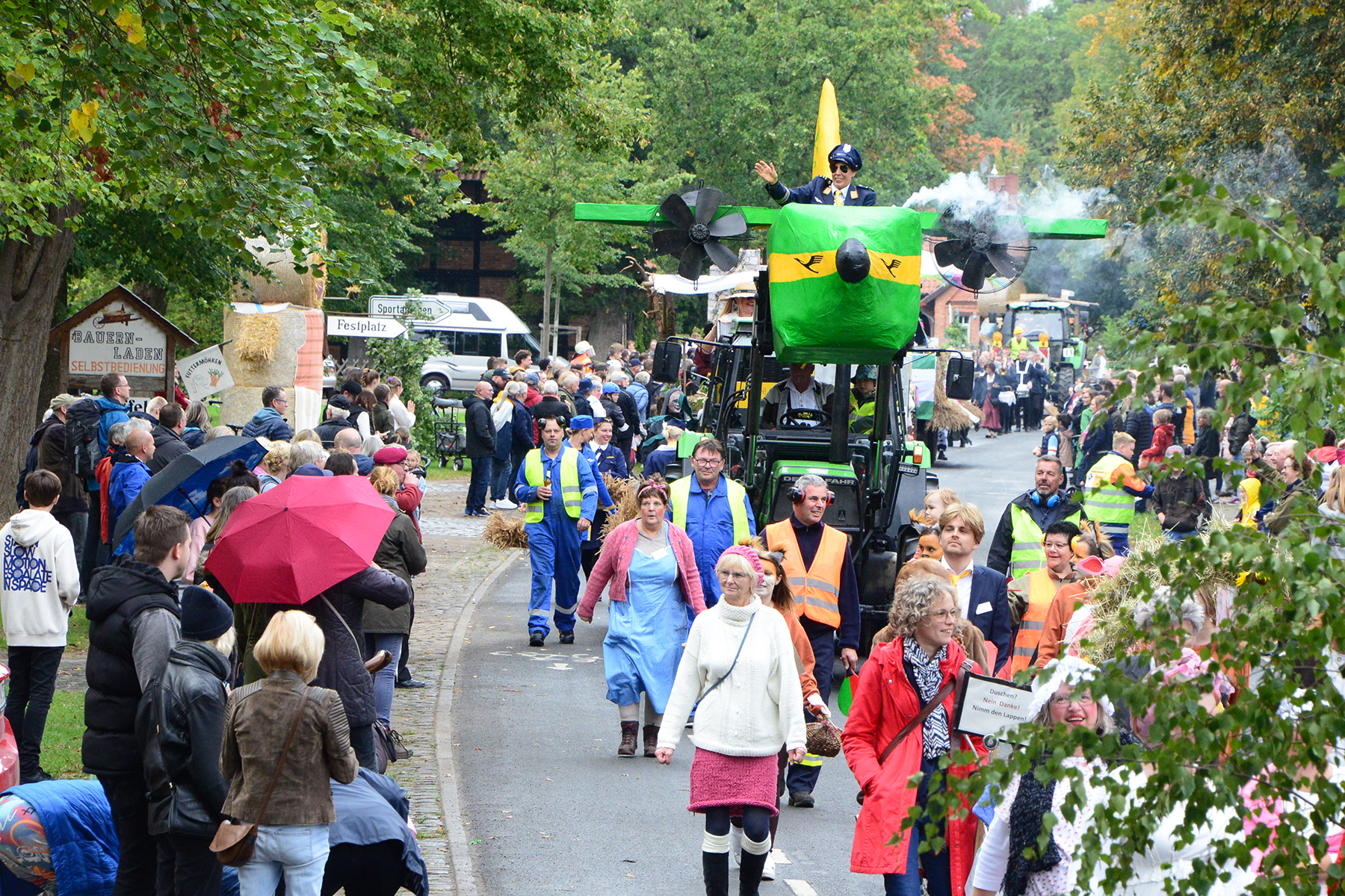 Lars Hogrefe von der Ramlinger Dorfgemeinschaft war vor dem Umzug überrascht von dem Aufmarsch der Gruppen: "Mit so vielen hatte ich dann doch nicht gerechnet", sagte er beim Aufstellen auf der Grünen Allee. Anschließend ging es, angeführt von der Erntekrone, getragen durch Dominik Schlumbohm, und den Erntemädchen, unter der Begleitung der Feuerwehrmusikzüge aus Ramlingen-Ehlershausen und Uetze sowie dem Fanfarencorps "Wikinger" Burgdorf durch den Ort.