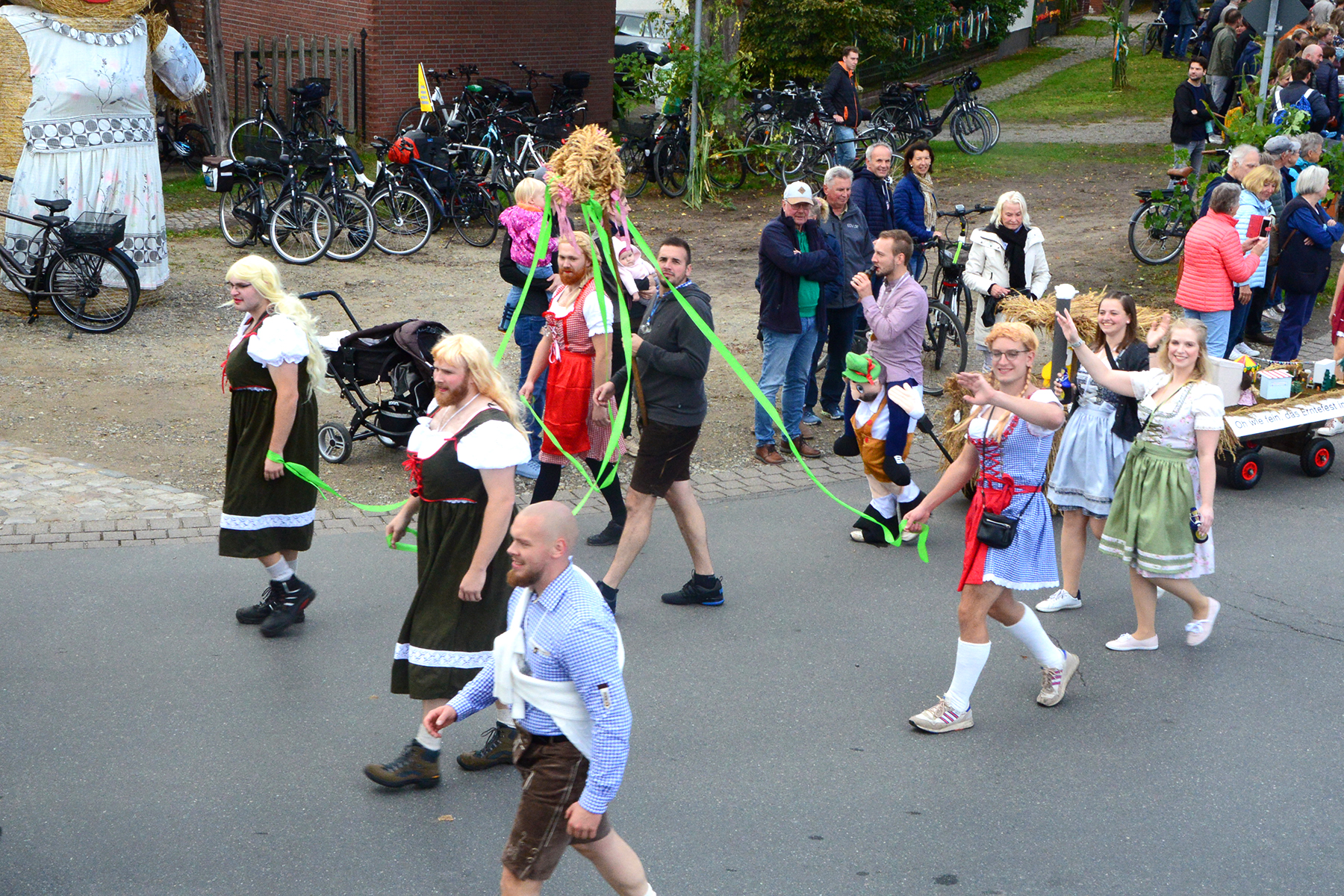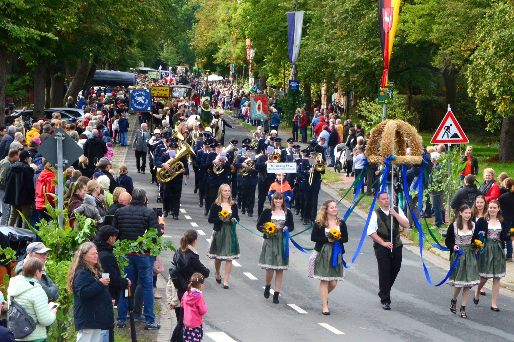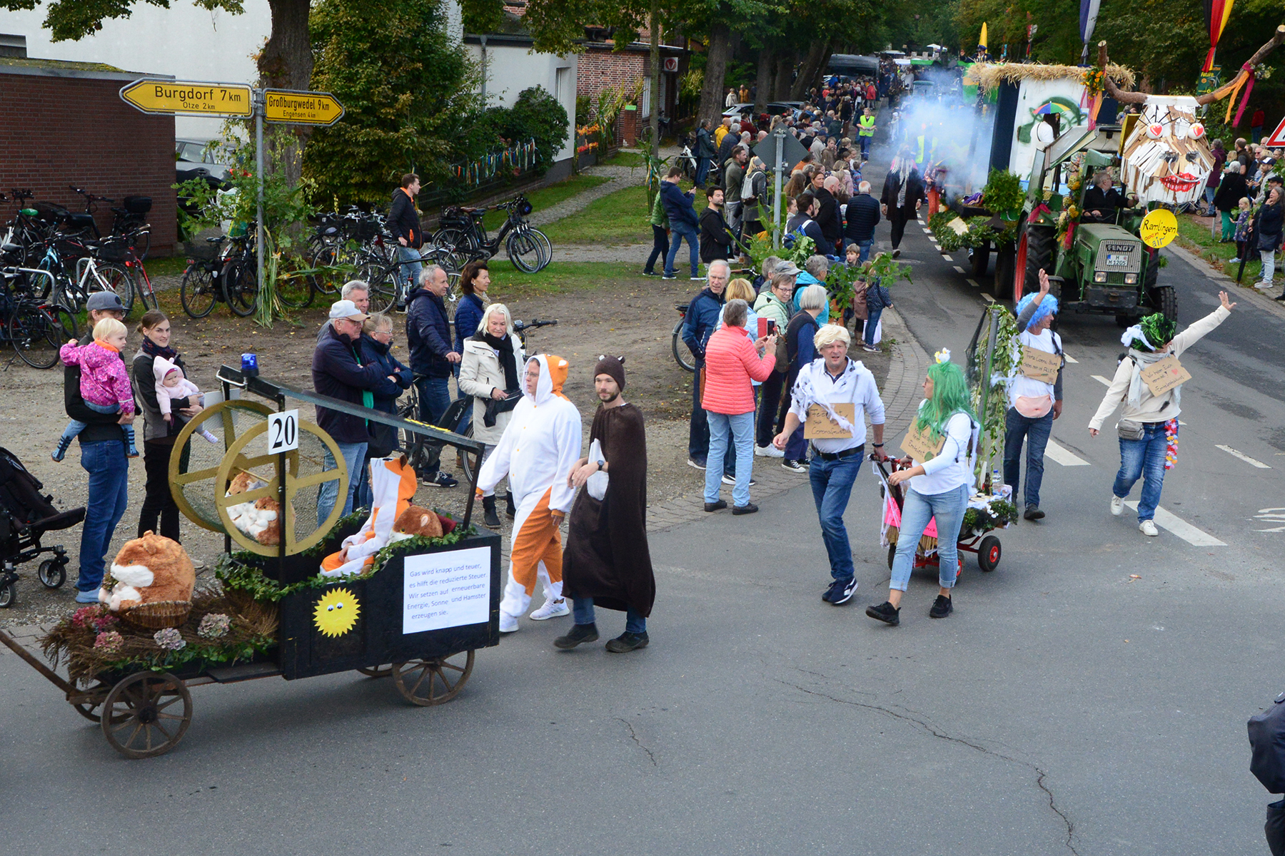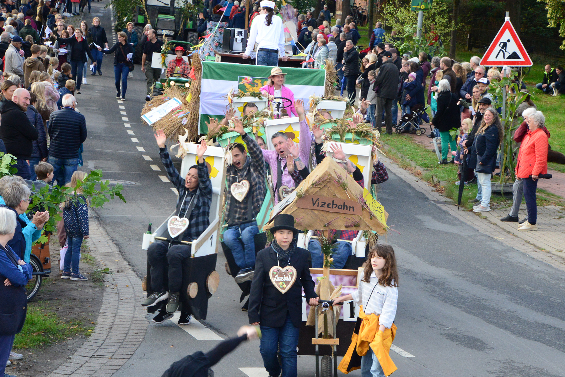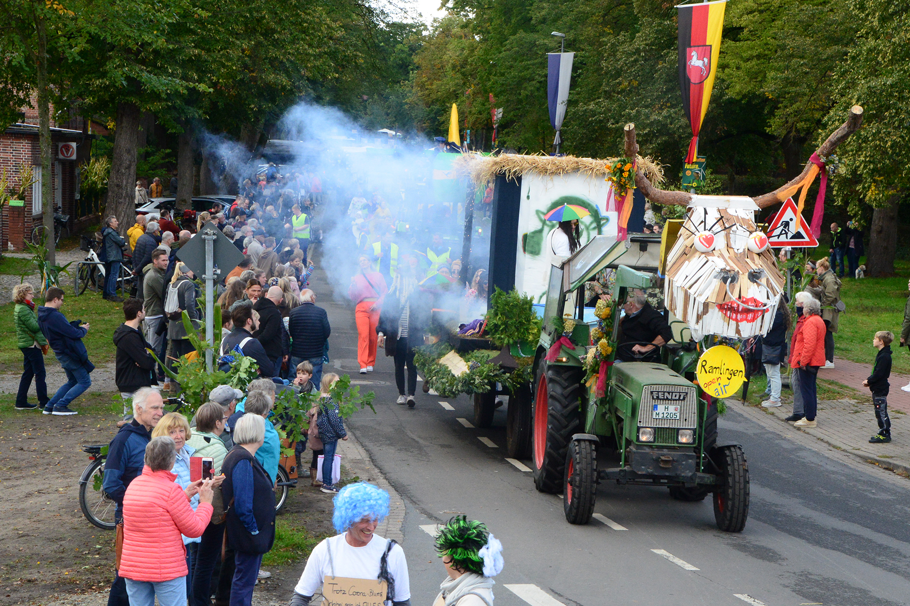 26 Gruppen nahmen im Jahr 1 nach der Corona-Pause am Umzug teil. Diese untergliederten sich in 9 große Wagen und 17 Fußgruppen. "Wir hätten niemals mit so vielen Gruppen nach der Corona-Pandemie gerechnet", so Manfred Meyer von der Ramlinger Dorfgemeinschaft. Die Dorfgemeinschaft besteht aus acht Mitgliedern, die sich für die Ausrichtung des Erntefestes verantwortlich zeigt. Doch sie müssen nicht alles allein organisieren: Durch die Mitbewohner des Ortes erfahren sie eine große Unterstützung. Sei es beim Aufbauen der Erntepuppen und dem Erstellen der Erntekronen zwei Wochen vor dem Fest, beim Schmücken des Festzeltes oder aber dem Kuchenverkauf im Festzelt nach dem Festumzug am Sonntag: Unzählige Ehrenamtliche sind ein Garant für beste Rahmenbedingungen.