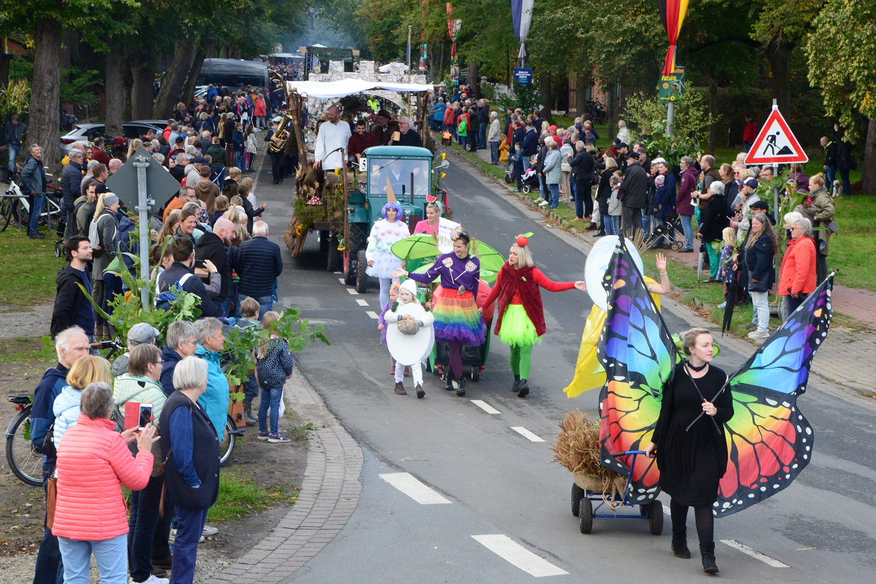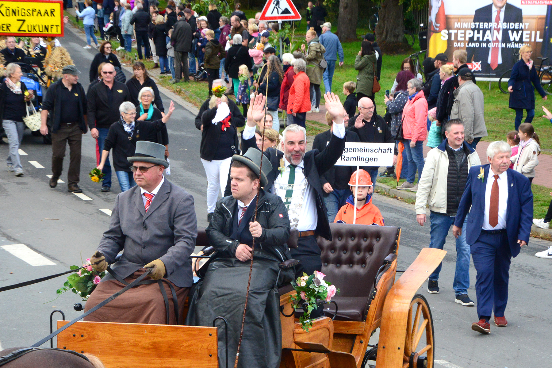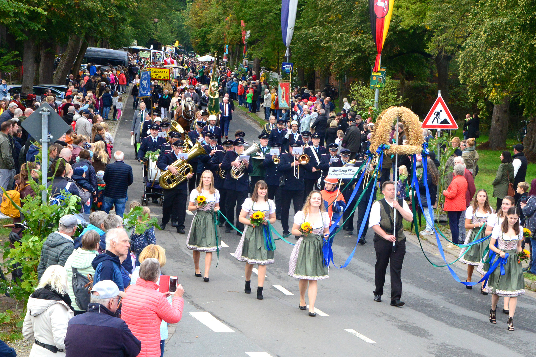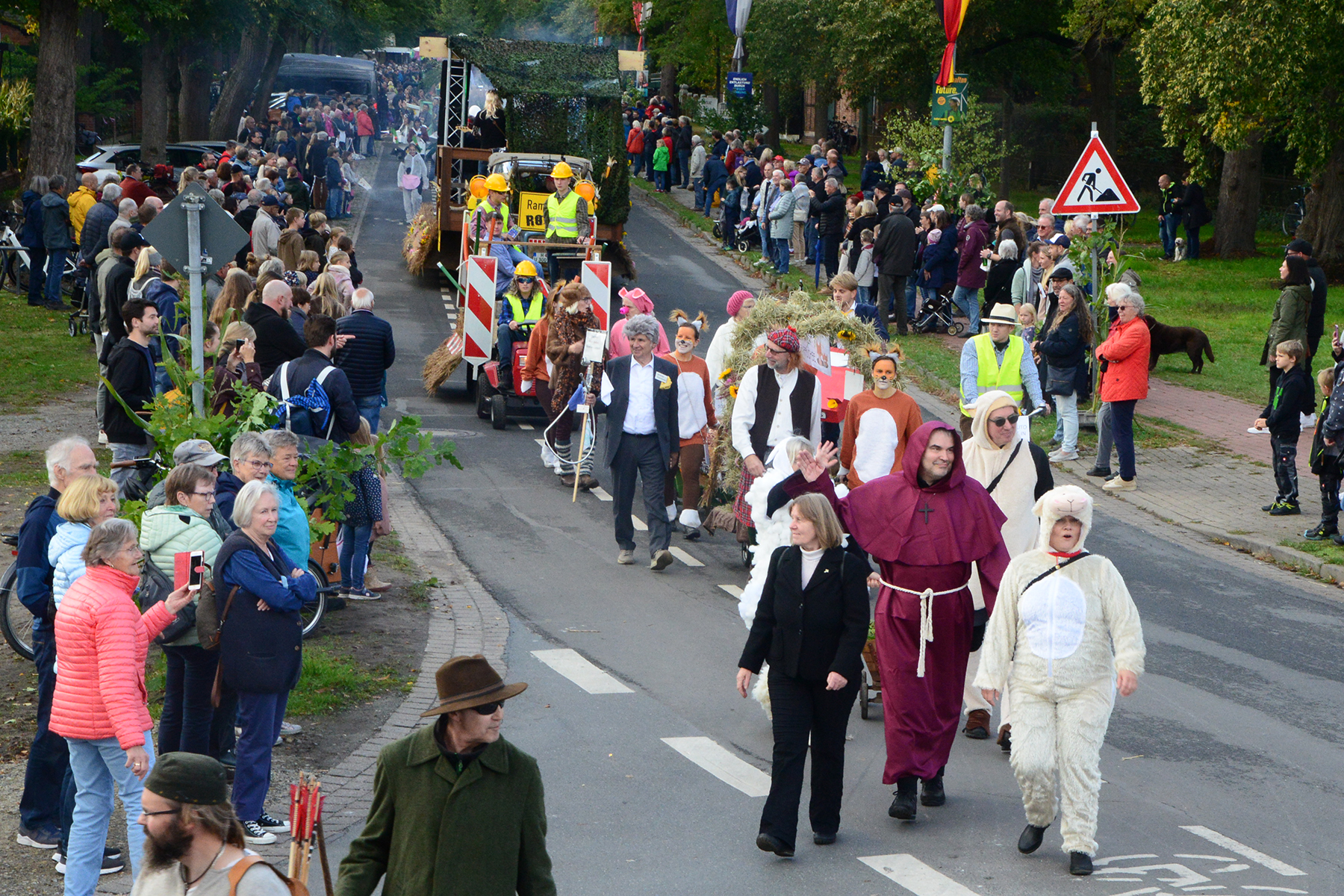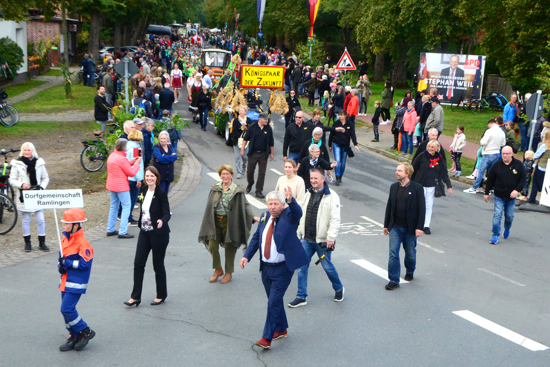 26 Gruppen nahmen im Jahr 1 nach der Corona-Pause am Umzug teil. Diese untergliederten sich in 9 große Wagen und 17 Fußgruppen. "Wir hätten niemals mit so vielen Gruppen nach der Corona-Pandemie gerechnet", so Manfred Meyer von der Ramlinger Dorfgemeinschaft. Die Dorfgemeinschaft besteht aus acht Mitgliedern, die sich für die Ausrichtung des Erntefestes verantwortlich zeigt. Doch sie müssen nicht alles allein organisieren: Durch die Mitbewohner des Ortes erfahren sie eine große Unterstützung. Sei es beim Aufbauen der Erntepuppen und dem Erstellen der Erntekronen zwei Wochen vor dem Fest, beim Schmücken des Festzeltes oder aber dem Kuchenverkauf im Festzelt nach dem Festumzug am Sonntag: Unzählige Ehrenamtliche sind ein Garant für beste Rahmenbedingungen.