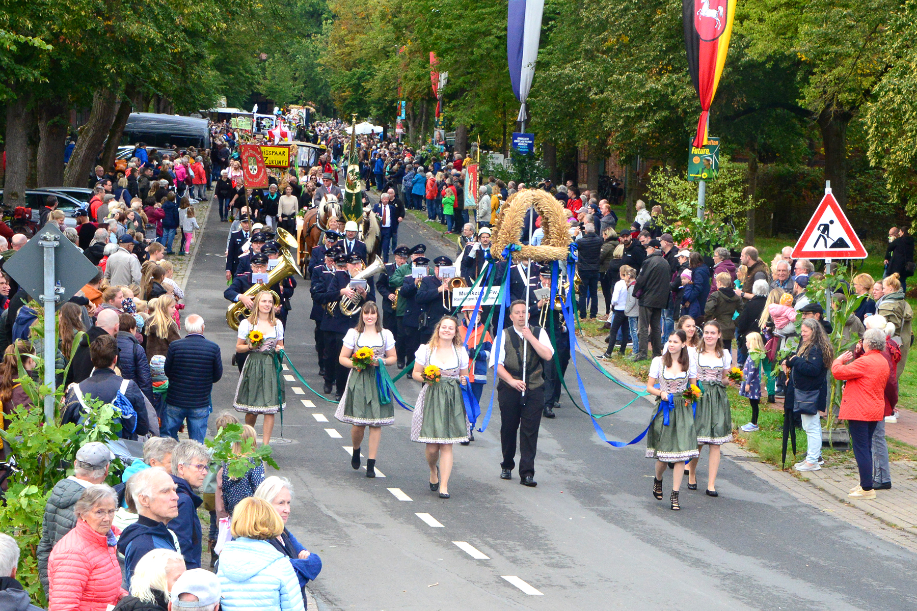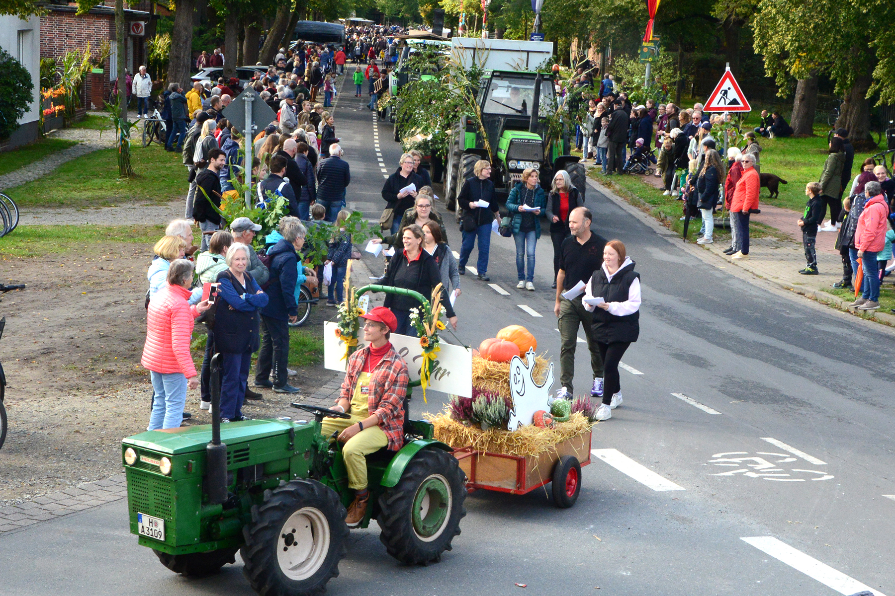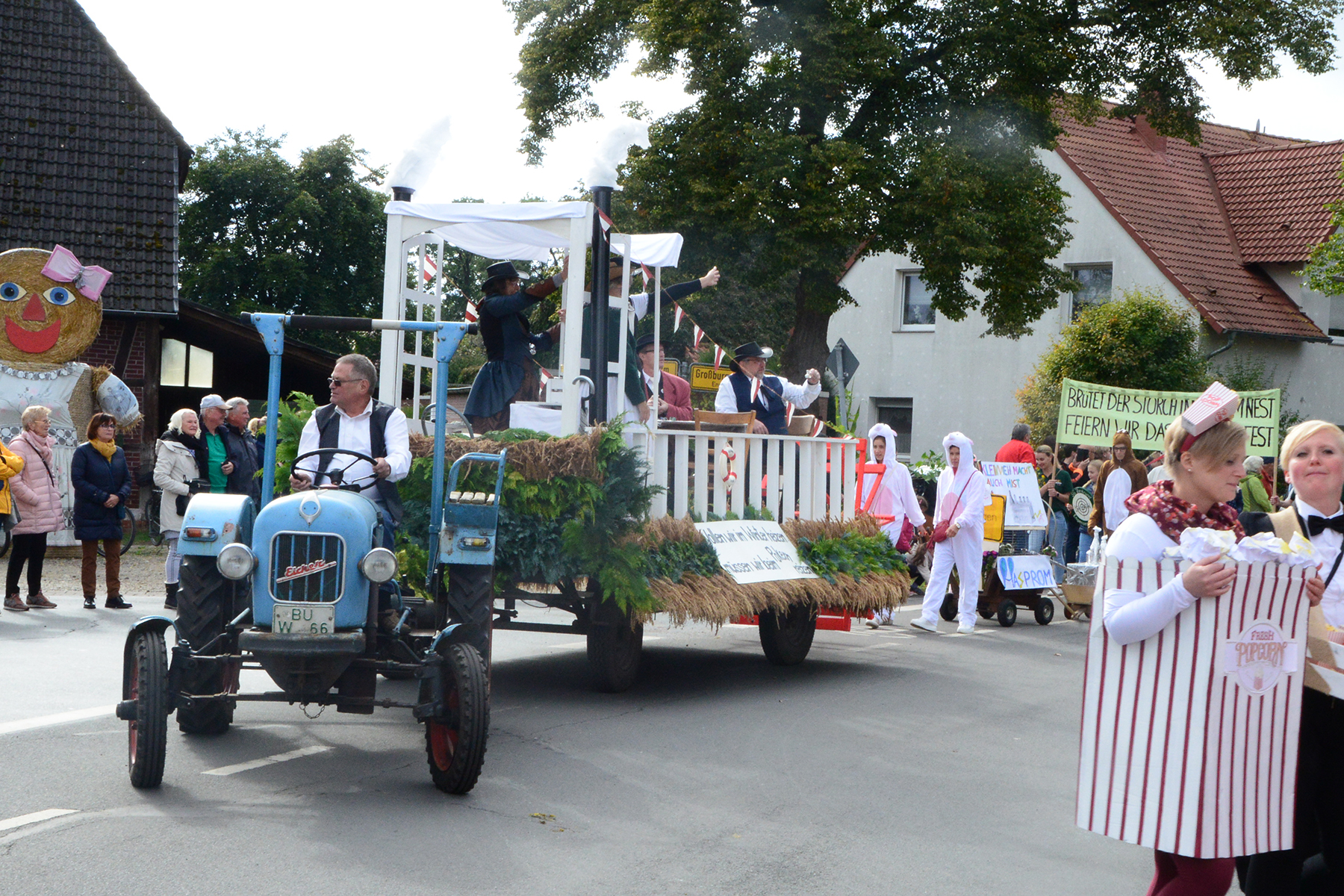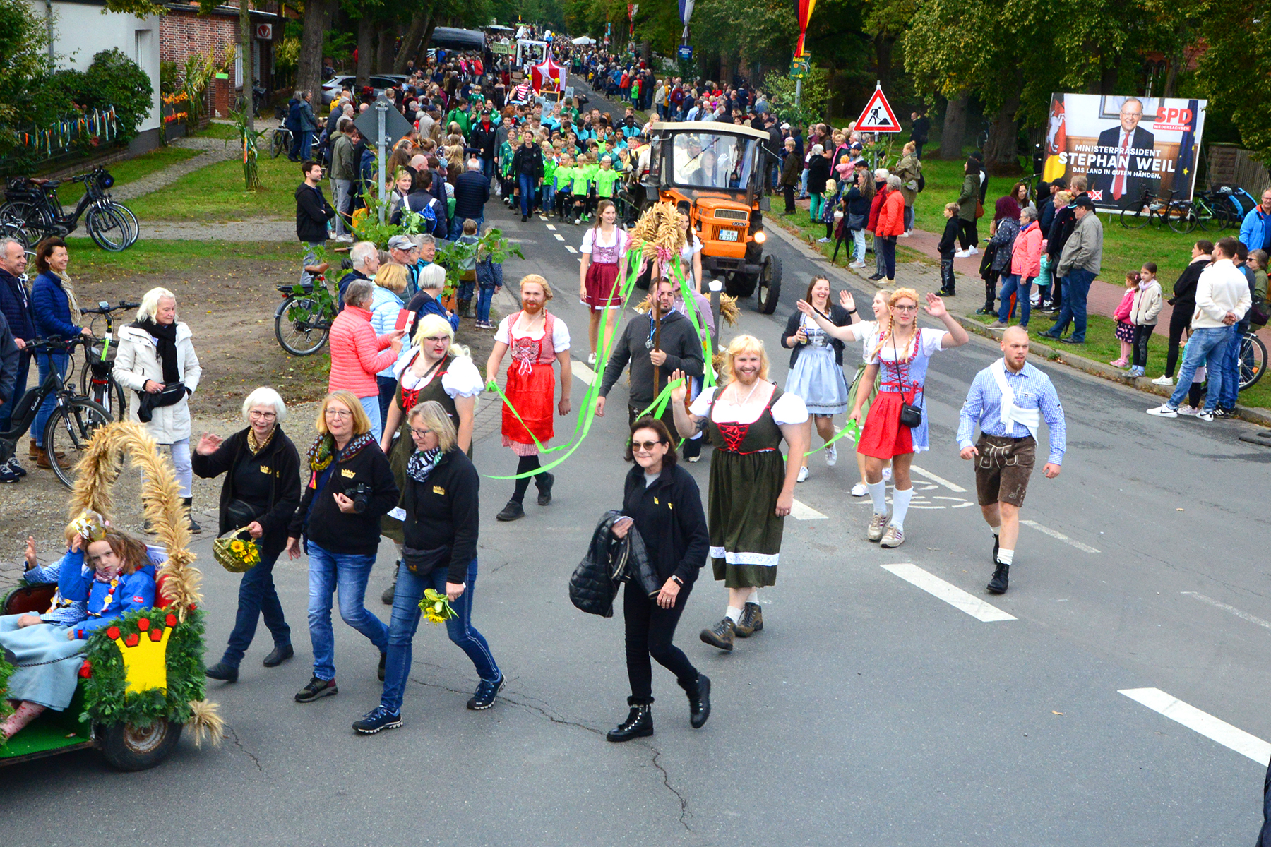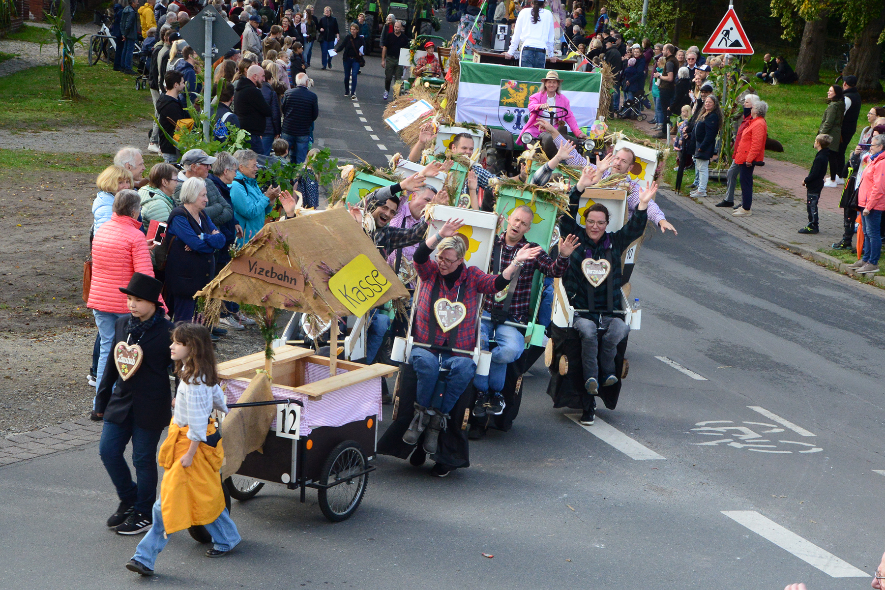 26 Gruppen nahmen im Jahr 1 nach der Corona-Pause am Umzug teil. Diese untergliederten sich in 9 große Wagen und 17 Fußgruppen. "Wir hätten niemals mit so vielen Gruppen nach der Corona-Pandemie gerechnet", so Manfred Meyer von der Ramlinger Dorfgemeinschaft. Die Dorfgemeinschaft besteht aus acht Mitgliedern, die sich für die Ausrichtung des Erntefestes verantwortlich zeigt. Doch sie müssen nicht alles allein organisieren: Durch die Mitbewohner des Ortes erfahren sie eine große Unterstützung. Sei es beim Aufbauen der Erntepuppen und dem Erstellen der Erntekronen zwei Wochen vor dem Fest, beim Schmücken des Festzeltes oder aber dem Kuchenverkauf im Festzelt nach dem Festumzug am Sonntag: Unzählige Ehrenamtliche sind ein Garant für beste Rahmenbedingungen.