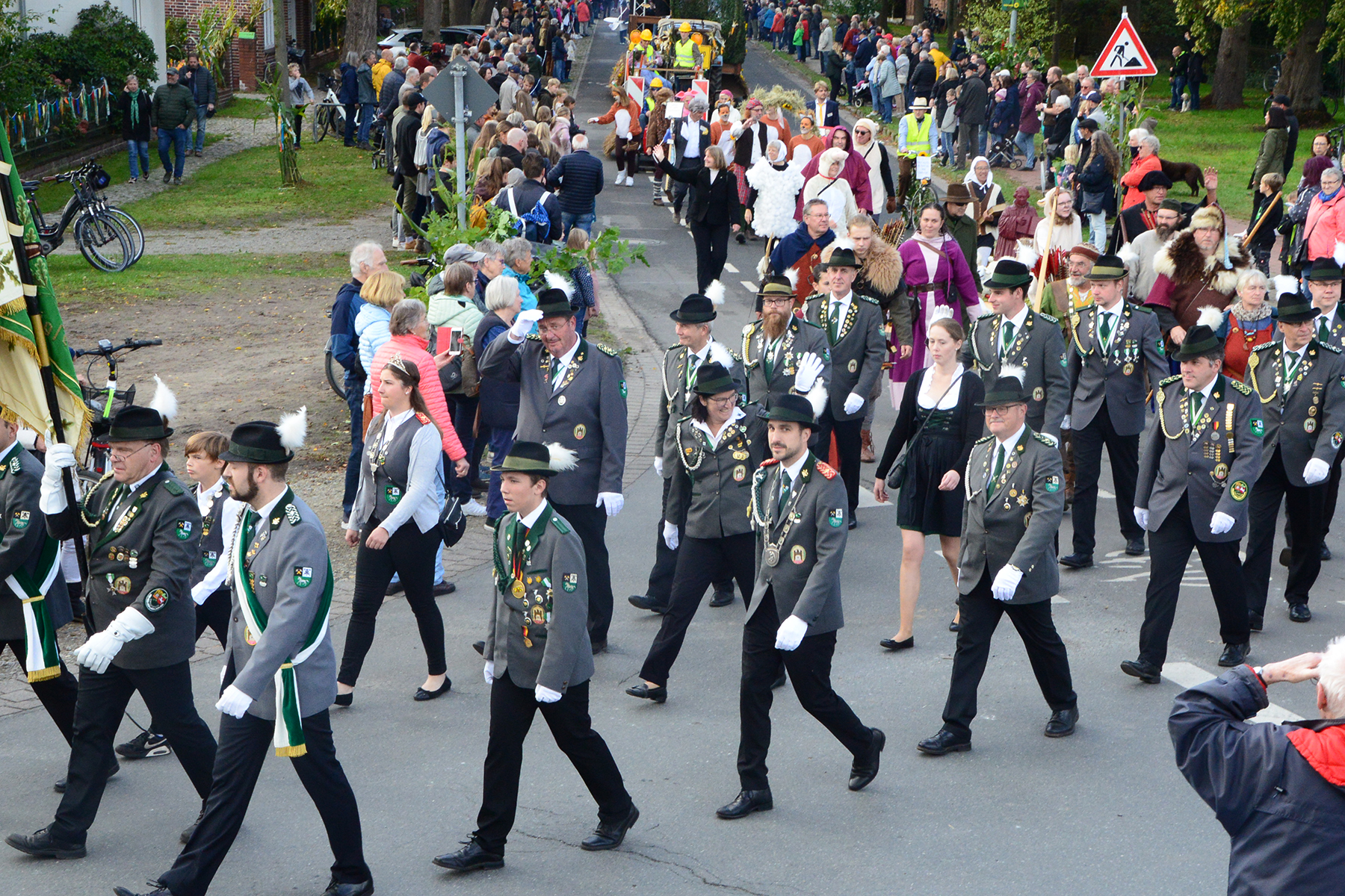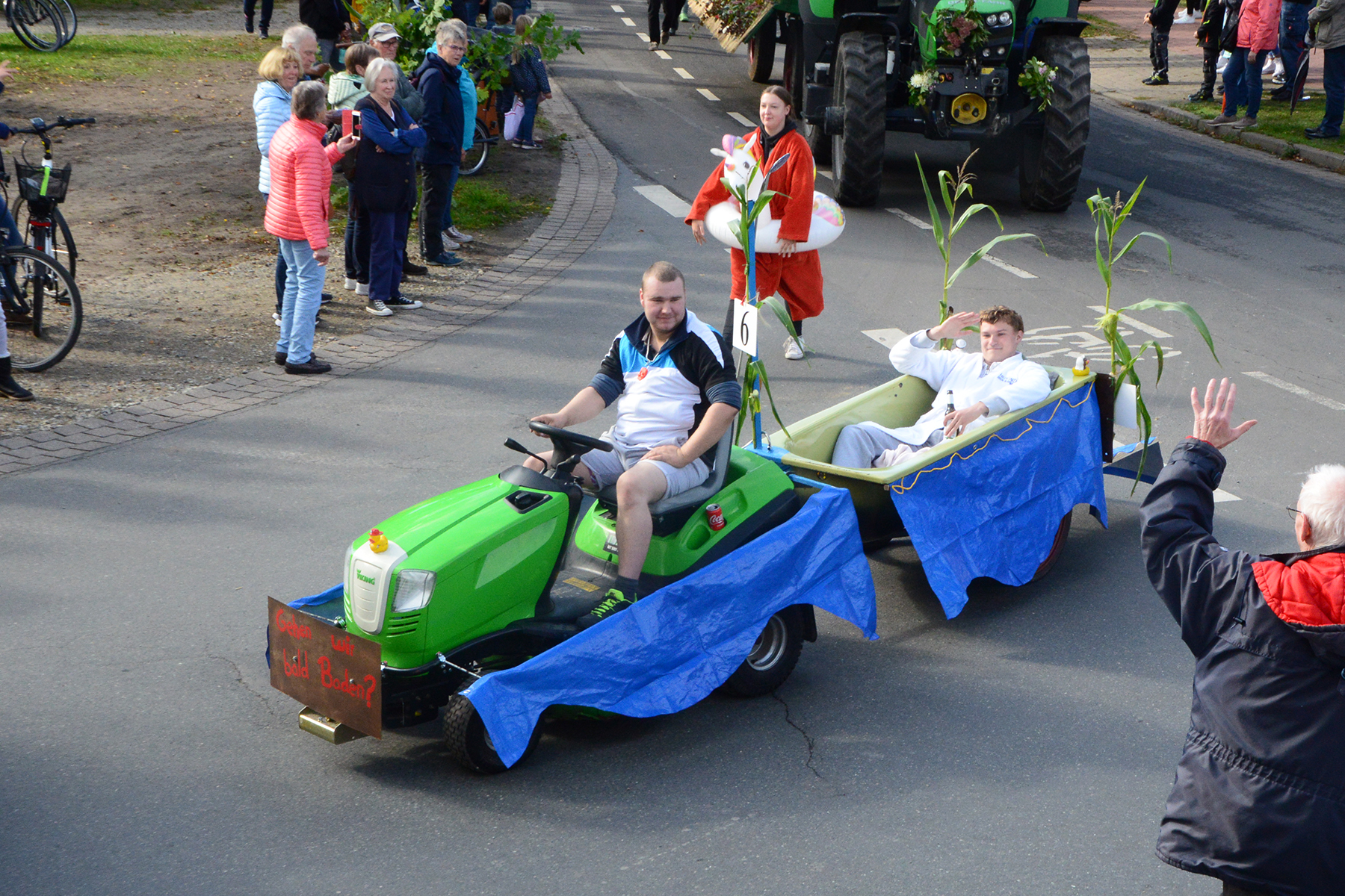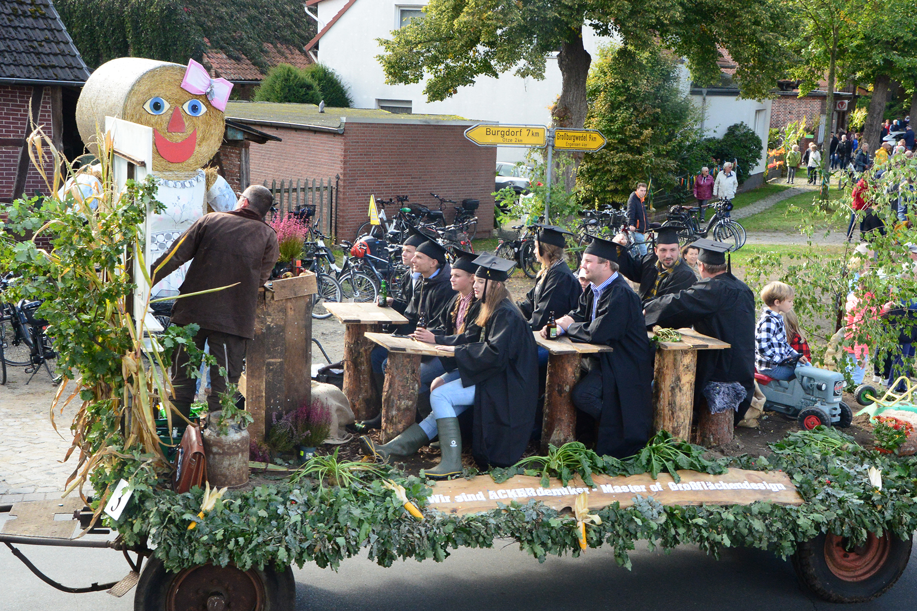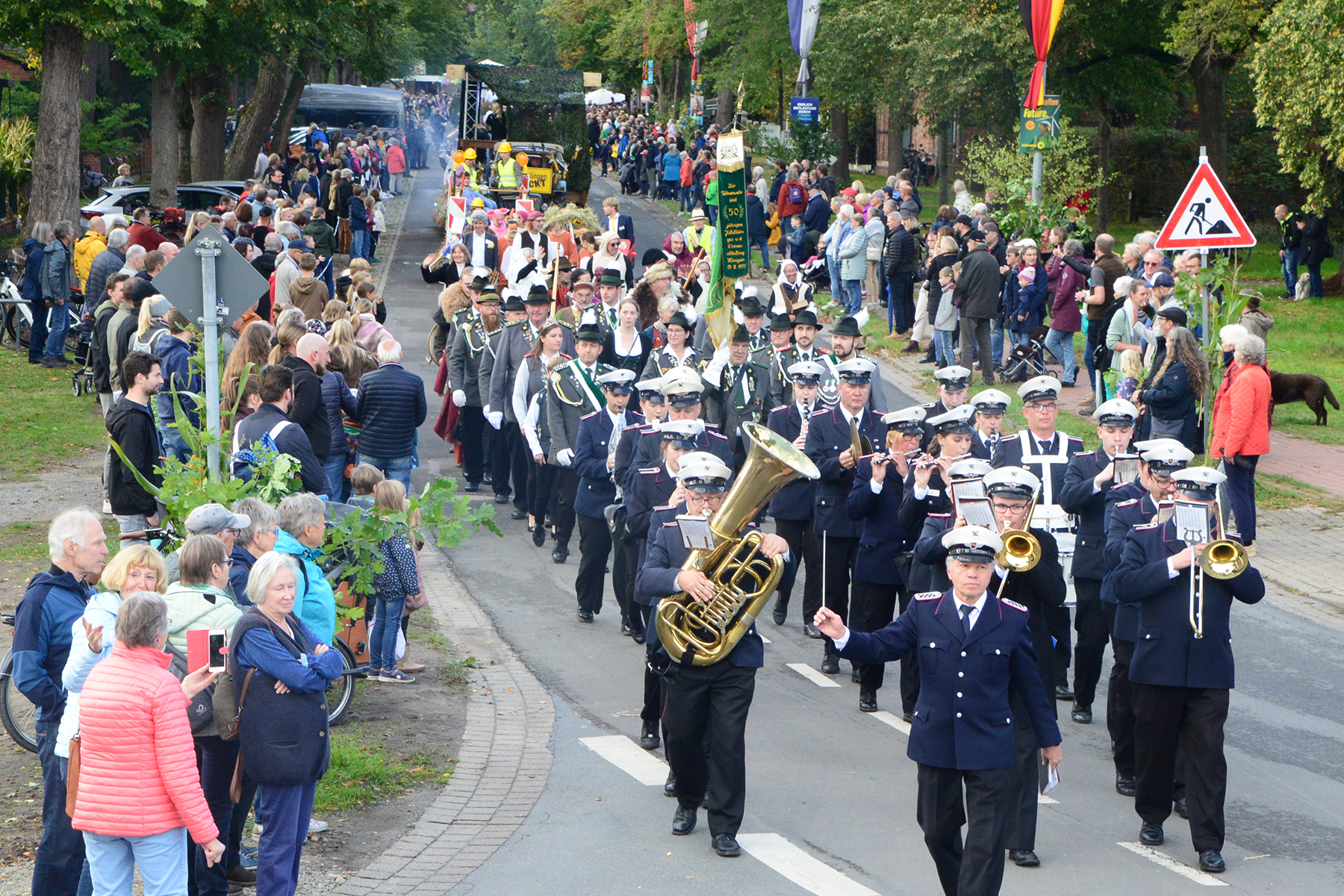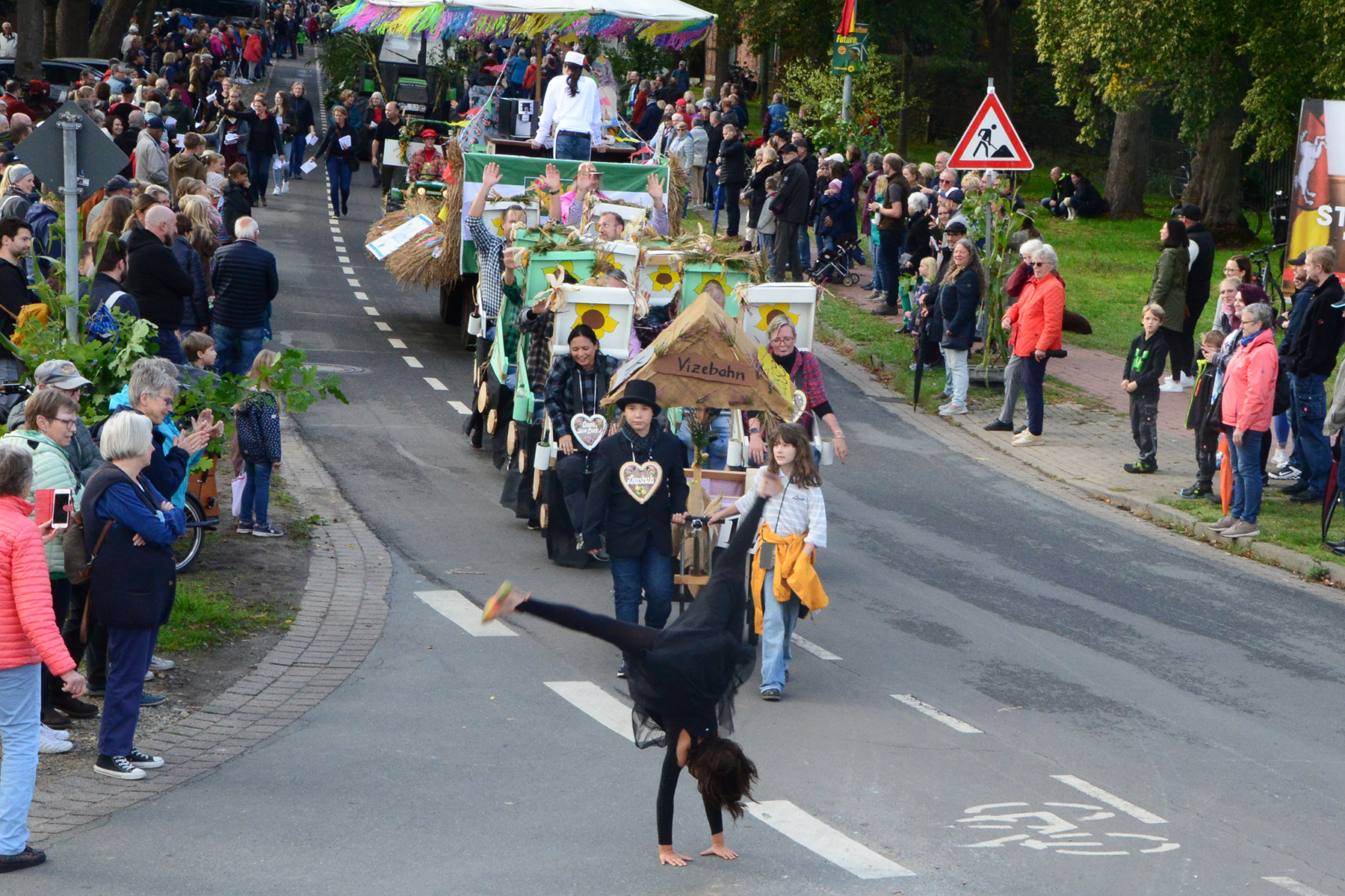 26 Gruppen nahmen im Jahr 1 nach der Corona-Pause am Umzug teil. Diese untergliederten sich in 9 große Wagen und 17 Fußgruppen. "Wir hätten niemals mit so vielen Gruppen nach der Corona-Pandemie gerechnet", so Manfred Meyer von der Ramlinger Dorfgemeinschaft. Die Dorfgemeinschaft besteht aus acht Mitgliedern, die sich für die Ausrichtung des Erntefestes verantwortlich zeigt. Doch sie müssen nicht alles allein organisieren: Durch die Mitbewohner des Ortes erfahren sie eine große Unterstützung. Sei es beim Aufbauen der Erntepuppen und dem Erstellen der Erntekronen zwei Wochen vor dem Fest, beim Schmücken des Festzeltes oder aber dem Kuchenverkauf im Festzelt nach dem Festumzug am Sonntag: Unzählige Ehrenamtliche sind ein Garant für beste Rahmenbedingungen.