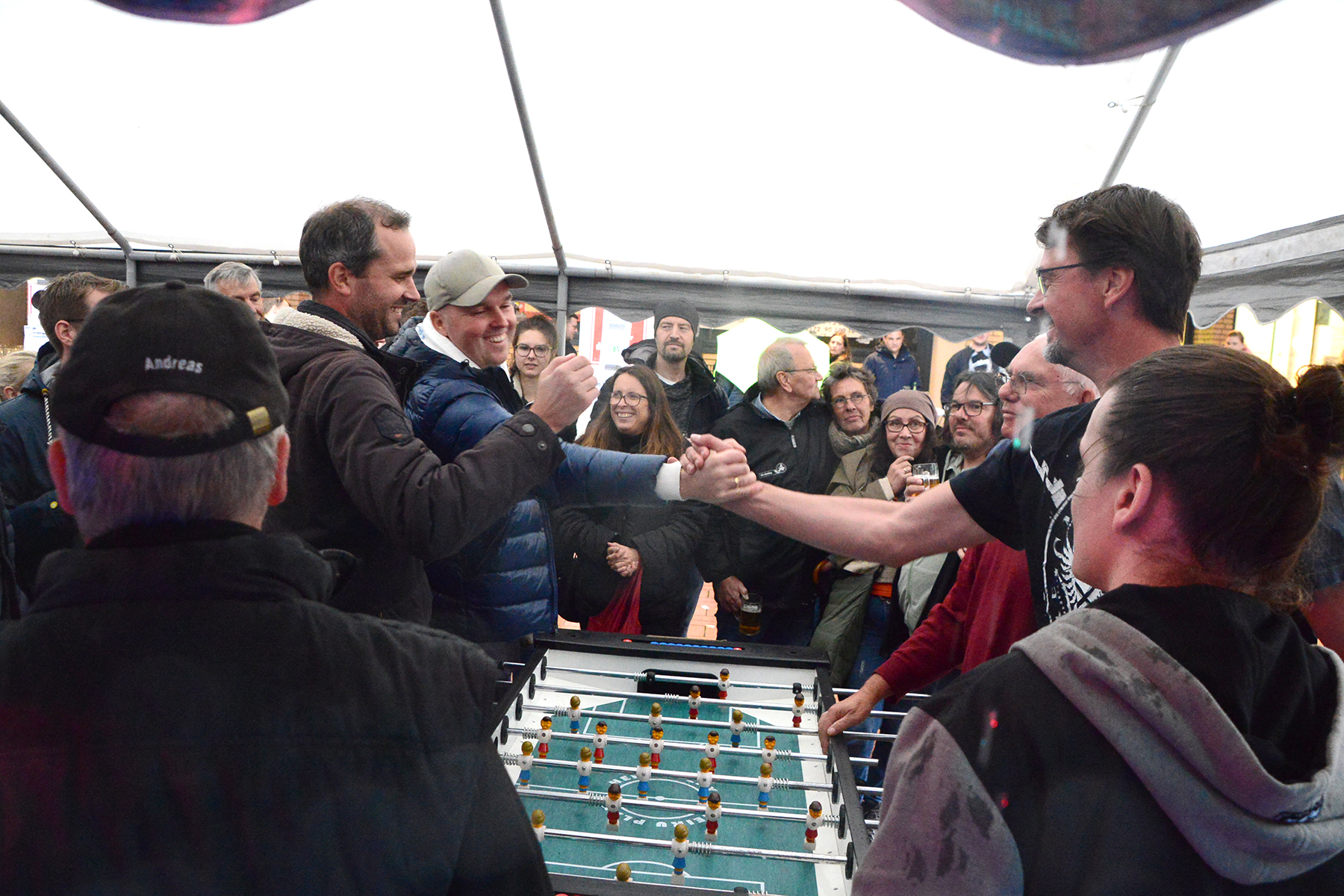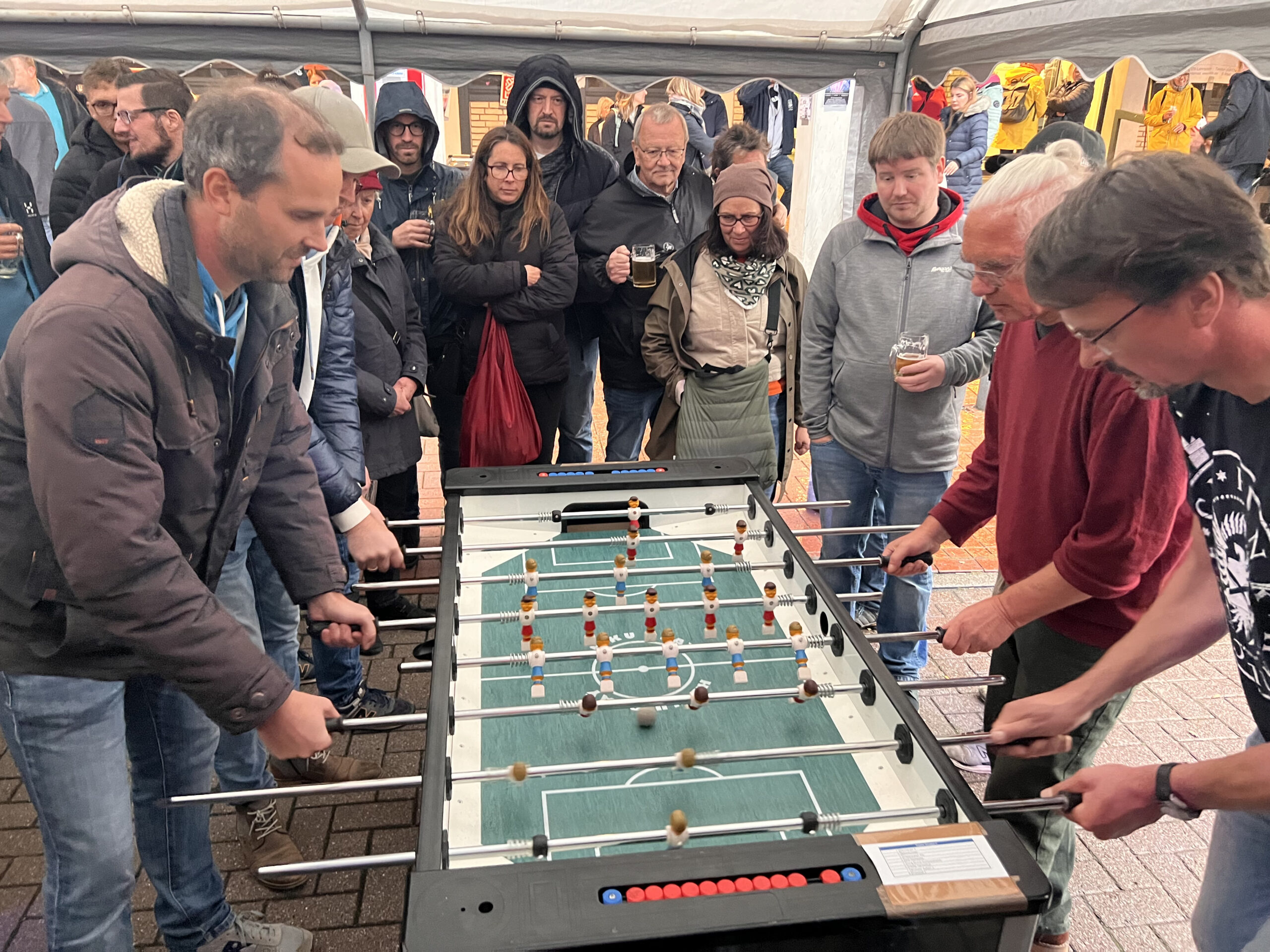Am heutigen Sonnabend, 2. Oktober 2022, stand der Fußball im Vordergrund an der Bühne der Junggesellencorporation von 1648 zu Burgdorf. Es ging dabei aber nicht um den großen Fußball, sondern um die kleineren Exemplare: An vier Kickertischen traten die Teams an, um den Sieger zu ermitteln.
