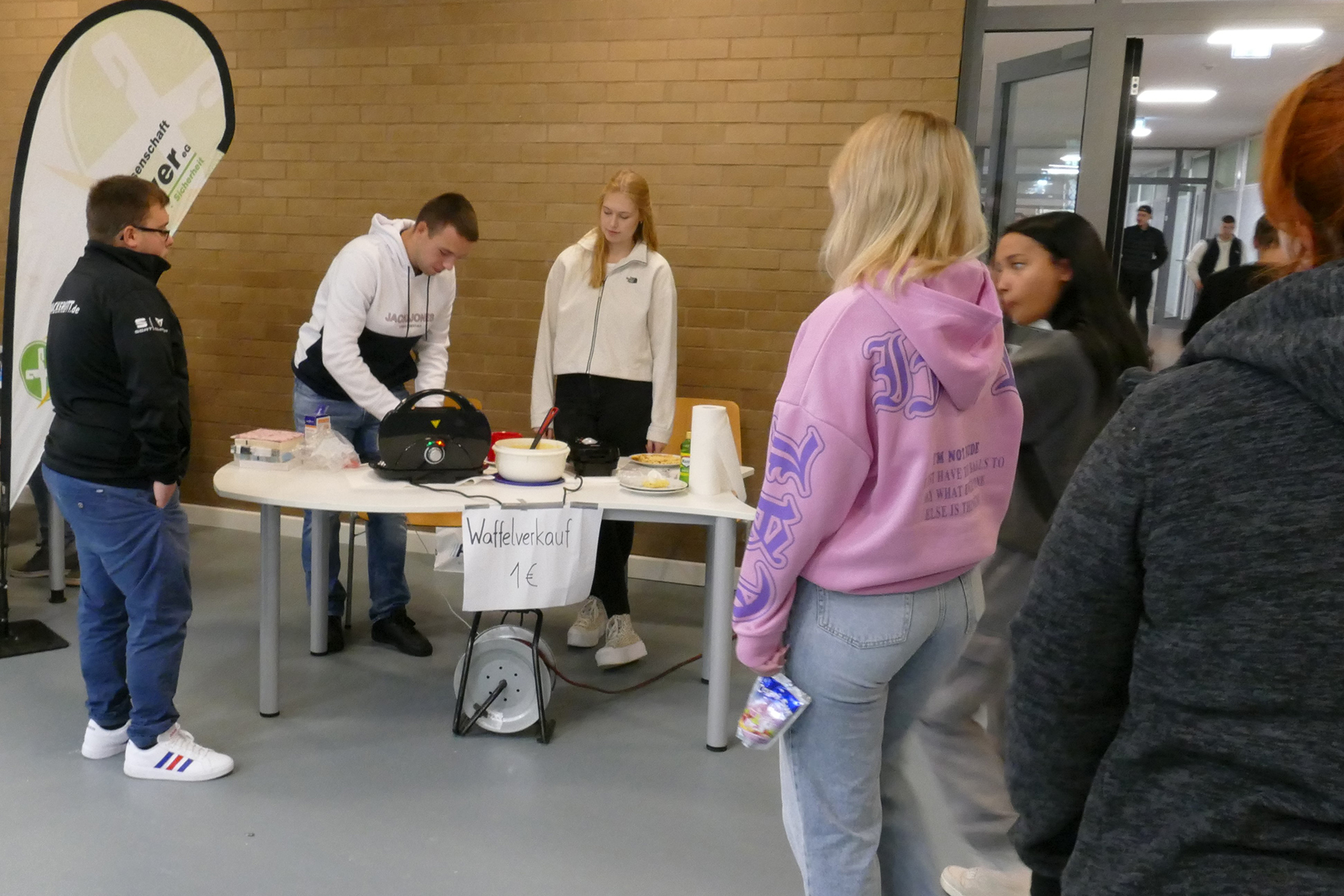 "Die gute Stimmung, die bei allen Beteiligten sehr deutlich wahrzunehmen war, kam bestimmt auch von den angenehmen und einladenden Düften des Waffelstandes. Die Idee dazu kam von den Azubis selbst. Süße Wolken zogen durch den Raum, die Schlange beim Verkauf war lang, die Freude über dieses Angebot groß", teitl die BBS mit.