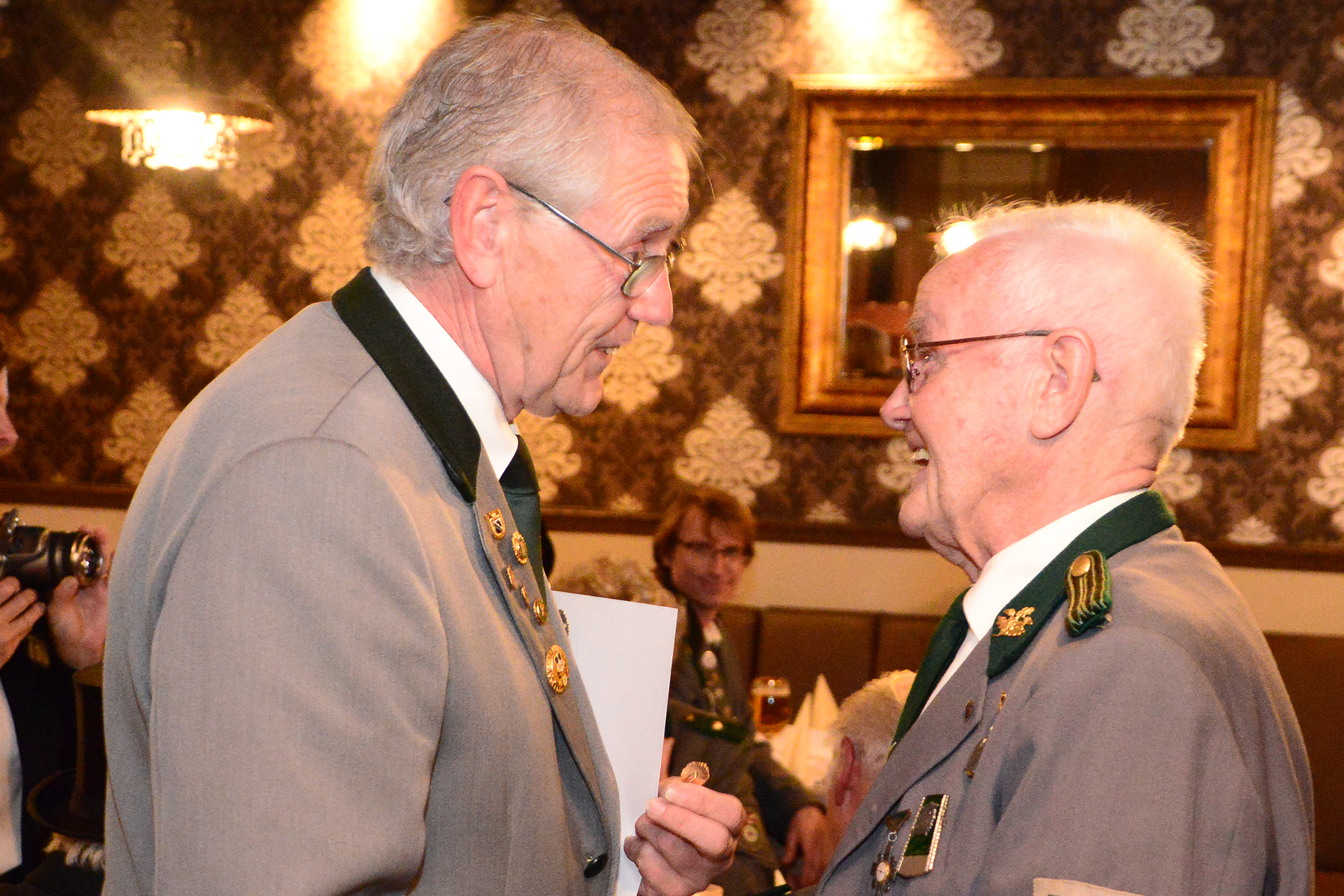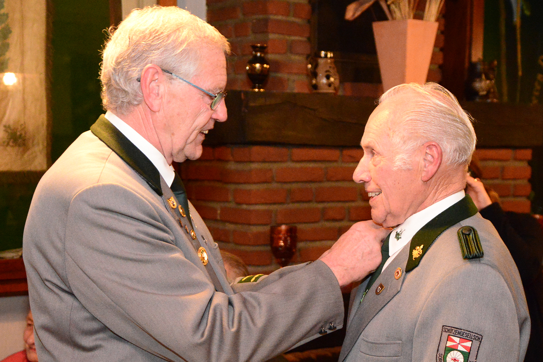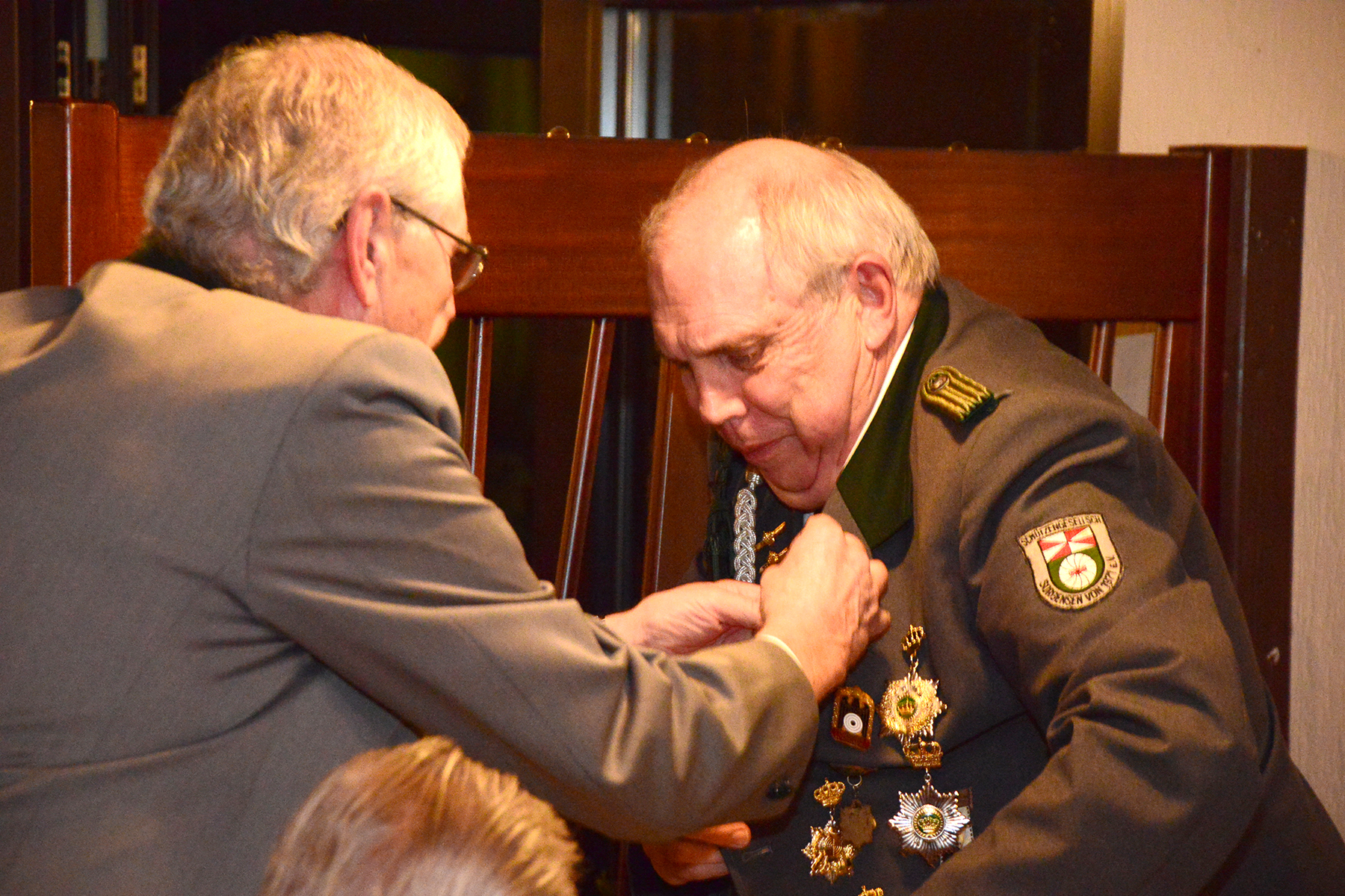 KSV-Präsident Werner Bösche (rechts) ehrt das älteste Gründungsmitglied der Schützengesellschaft Sorgensen, Werner Kreutzer. / Foto: Bastian Kroll