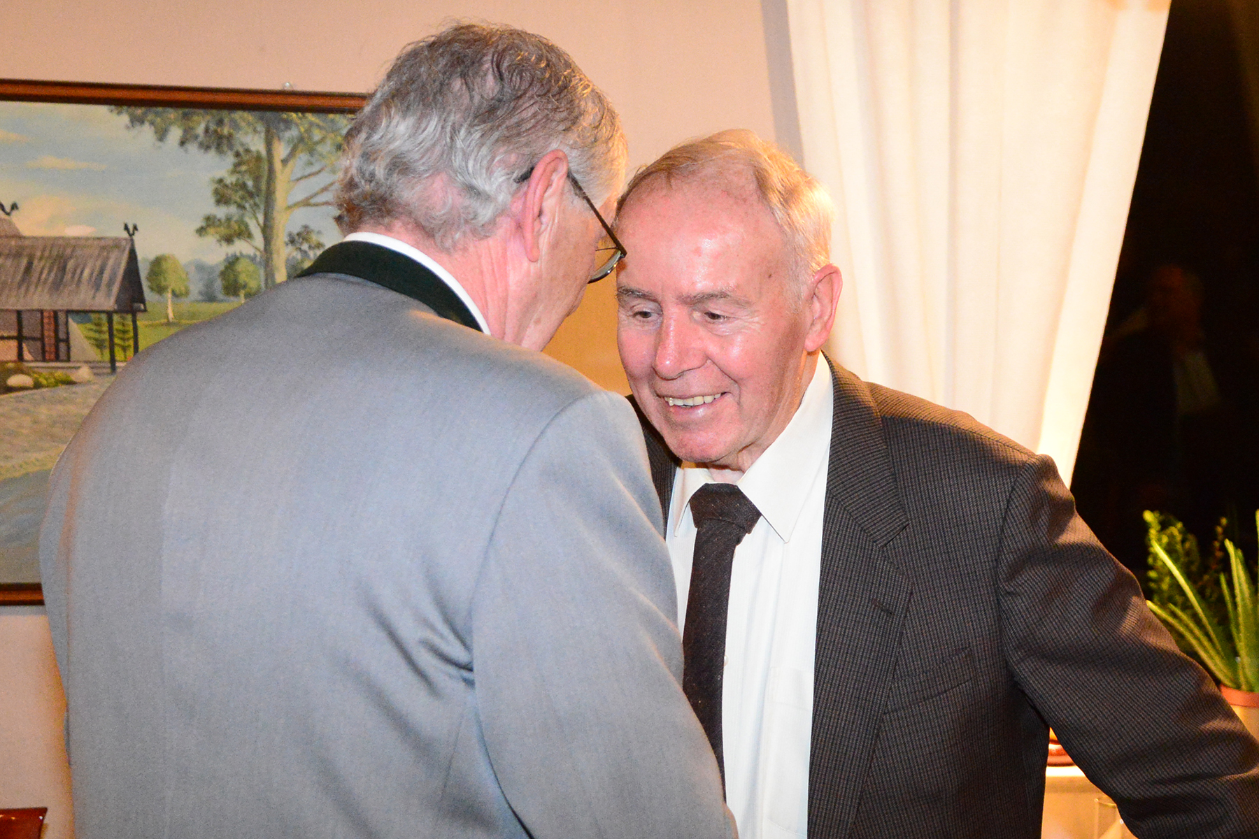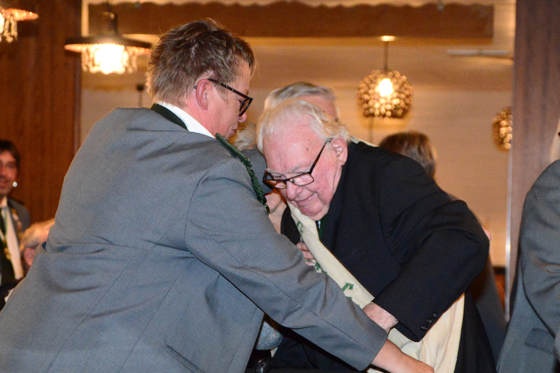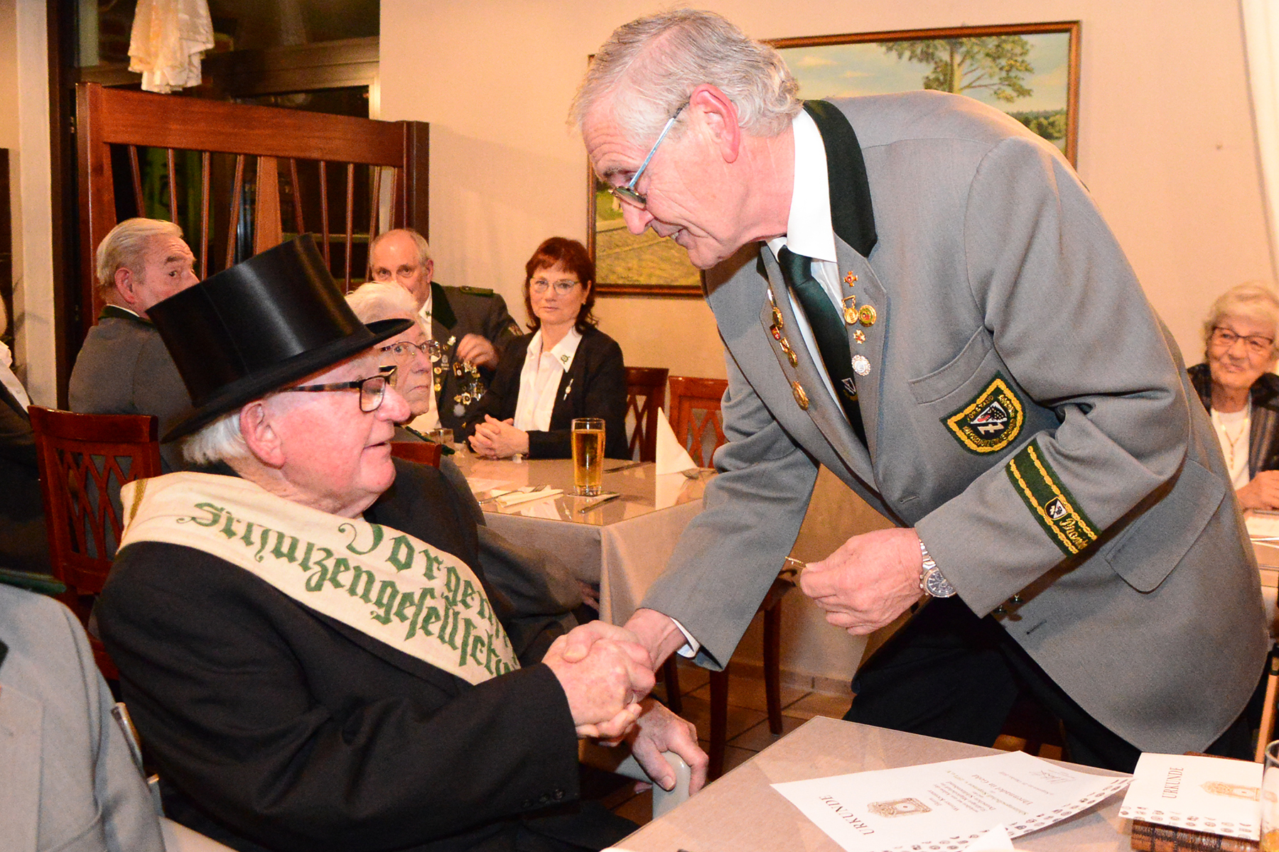 KSV-Präsident Werner Bösche (rechts) ehrt das älteste Gründungsmitglied der Schützengesellschaft Sorgensen, Werner Kreutzer. / Foto: Bastian Kroll